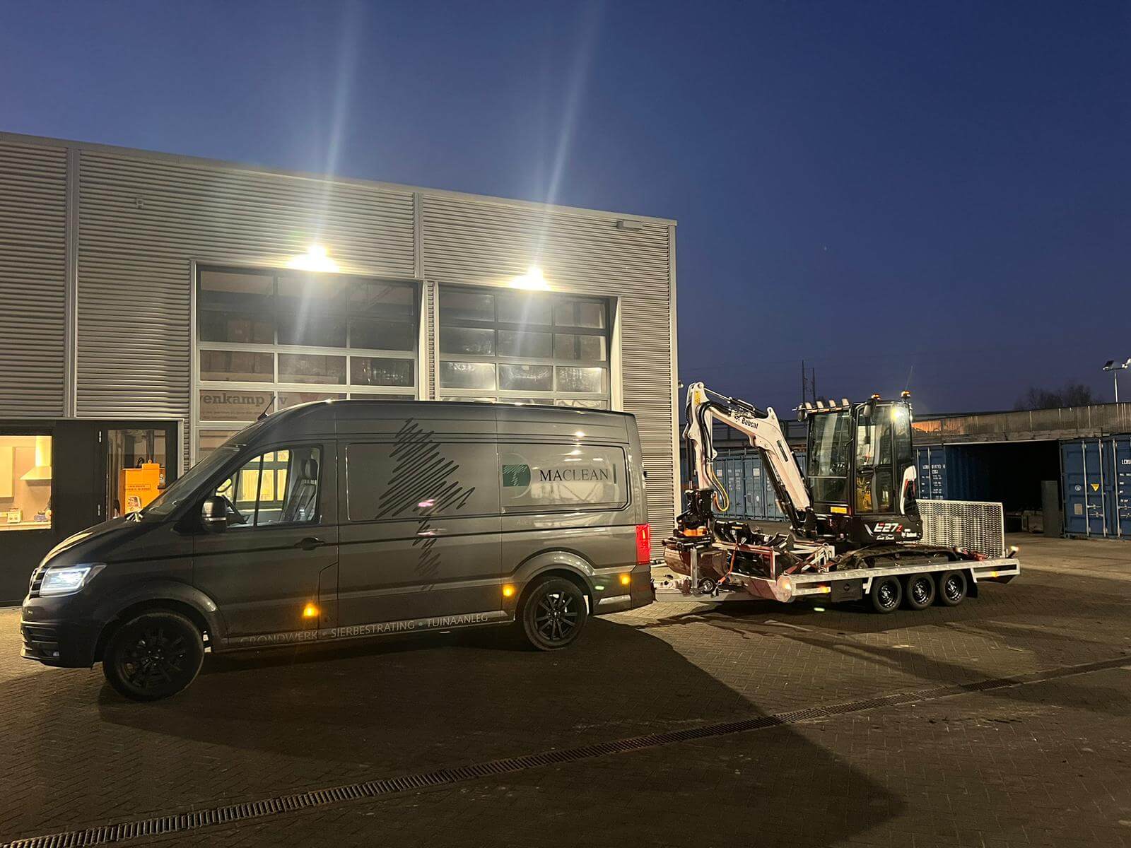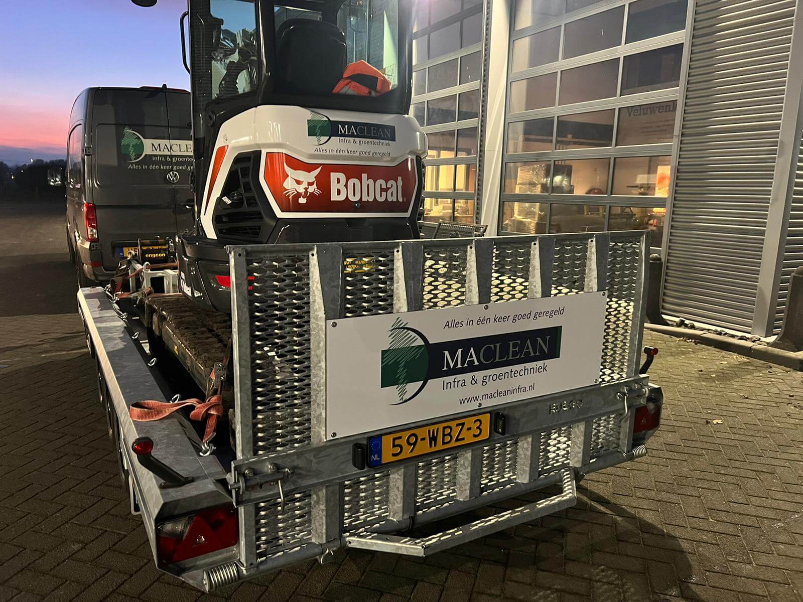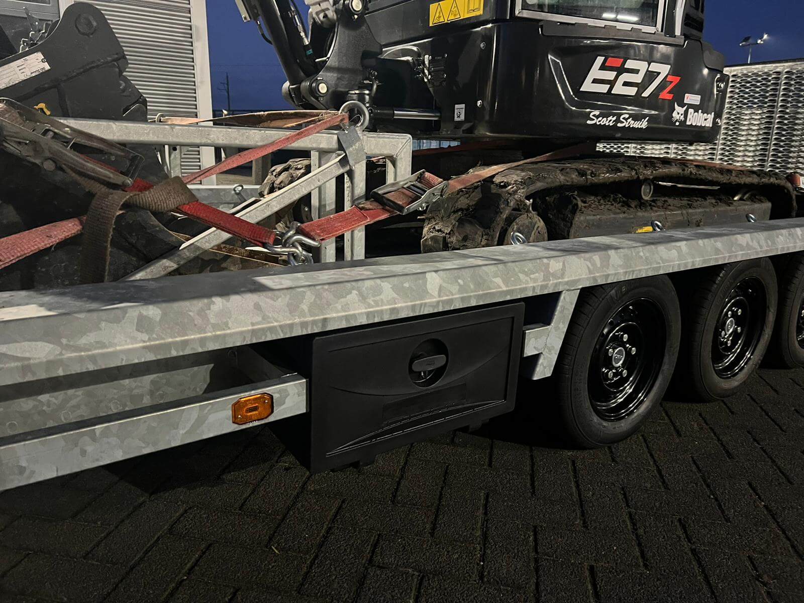 Onze nieuwe aanhanger heeft een afmeting van  3.5x 1.8 mtr en is speciaal voor het transport van onze minikraan en is geleverd door H.O. Veluwenkamp BV