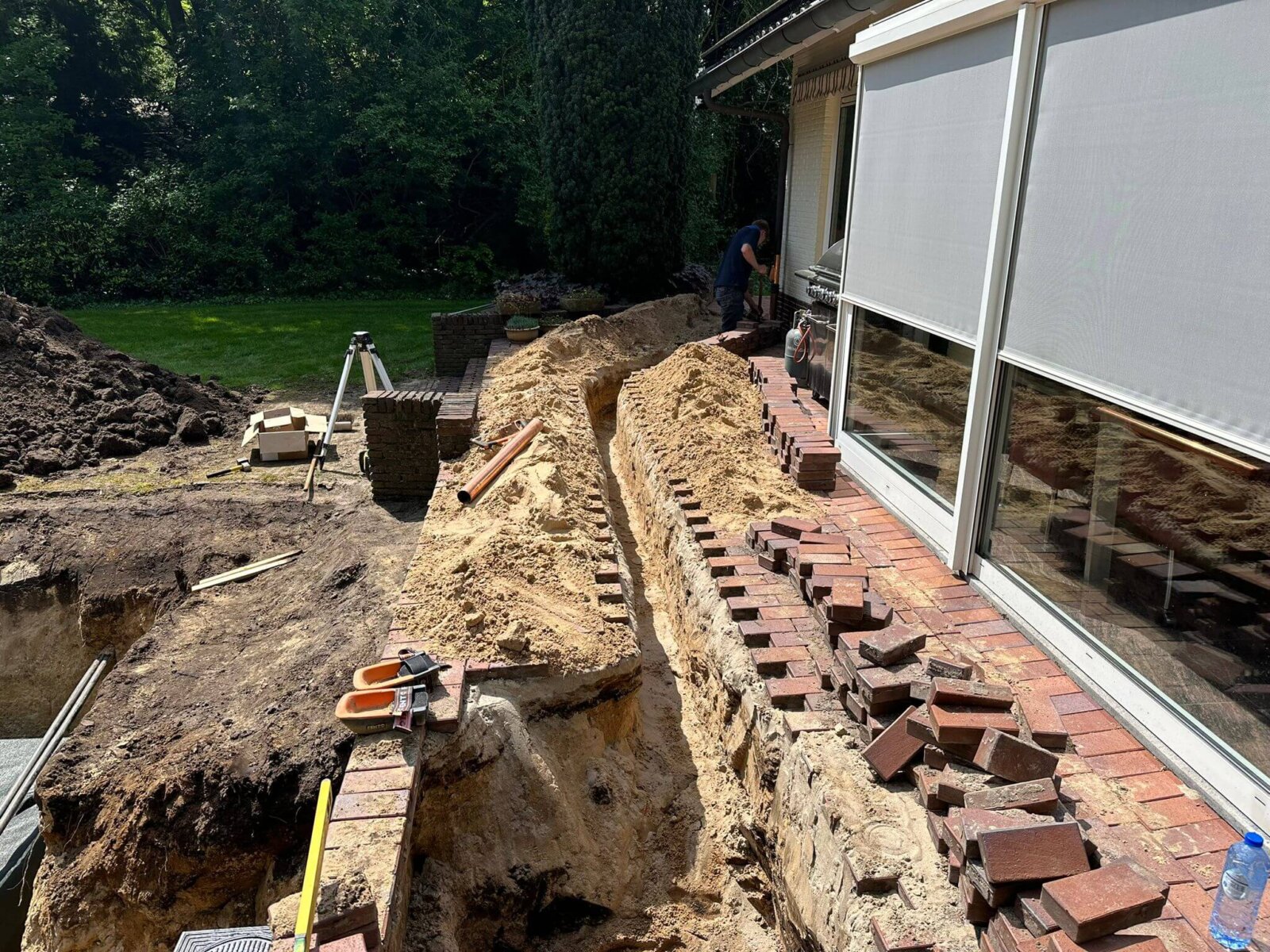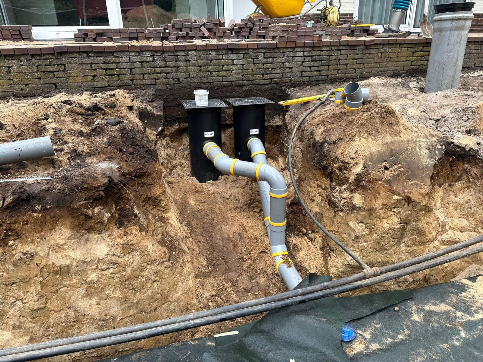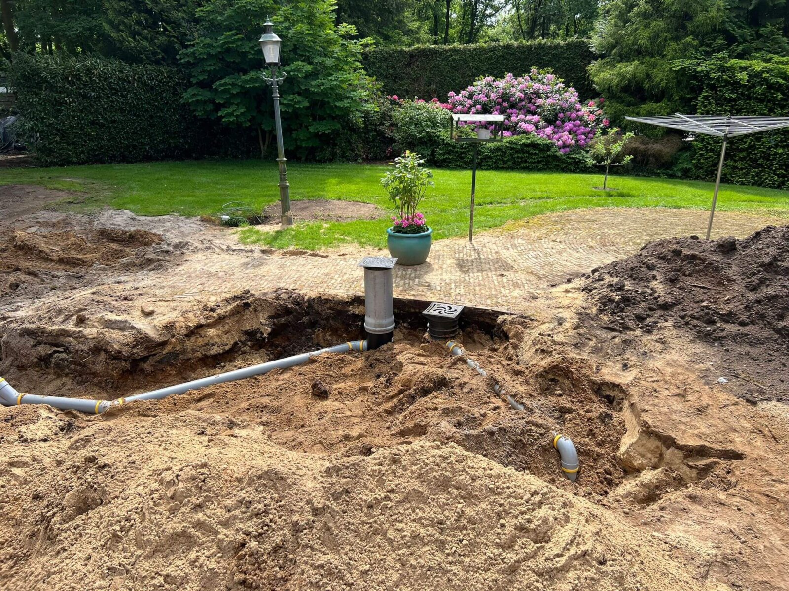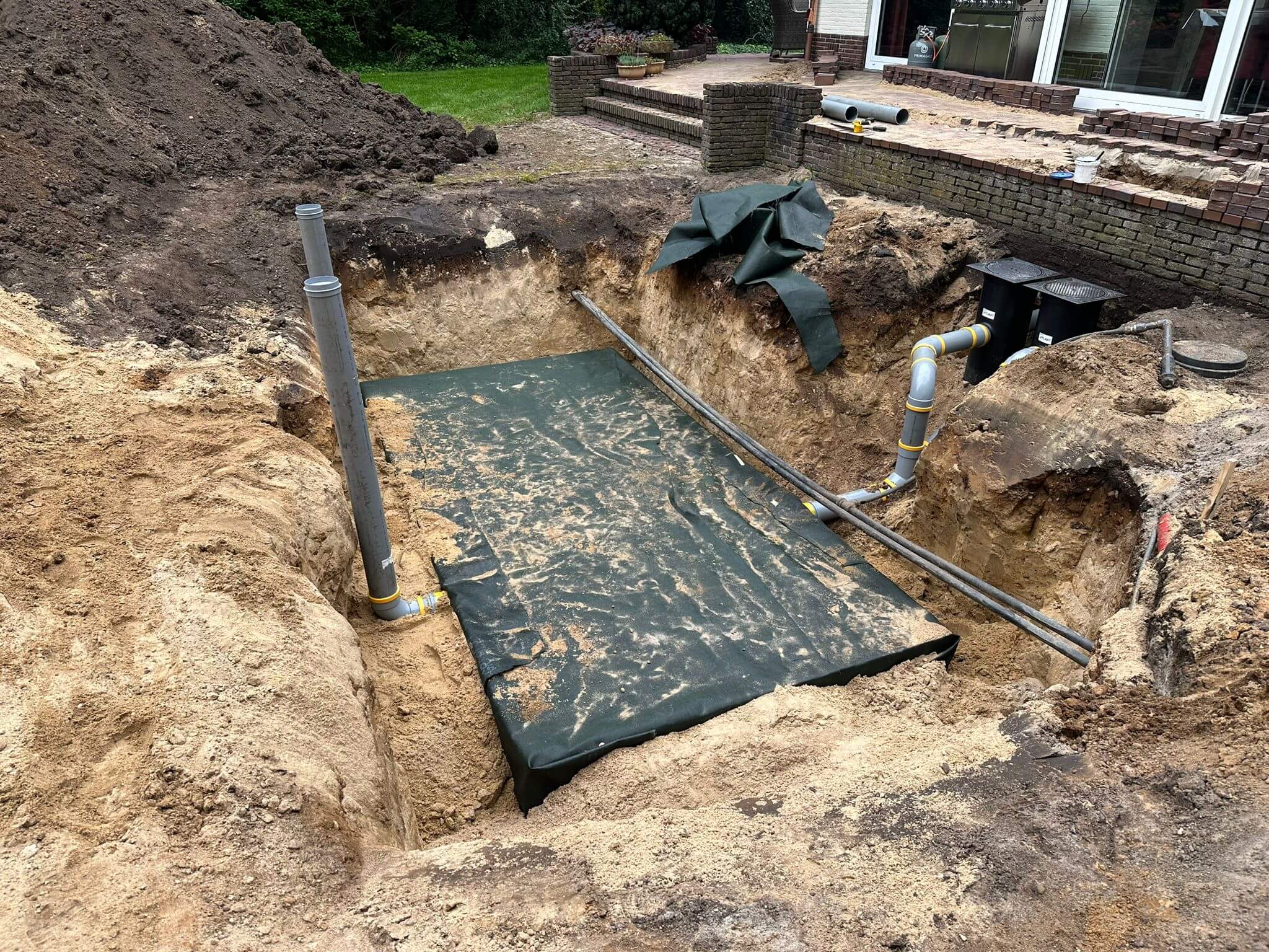 Het grondwerk hebben we met klein materieel uitgevoerd ivm de beperkte ruimte achter in de tuin. De infiltratiekratten zijn 1 meter minus maaiveld in het zand aangebracht. Voor deze woning hebben we een berekening gedaan om 130 m2 dakoppervlak van het riool af te koppelen. Voor deze woning hebben we een berekening gedaan waaruit blijkt dat er 9 m3 regenwater moet worden opgeslaan in kratten. Dit komt uit op 42 kratten die wij inpakken met Geotextiel.