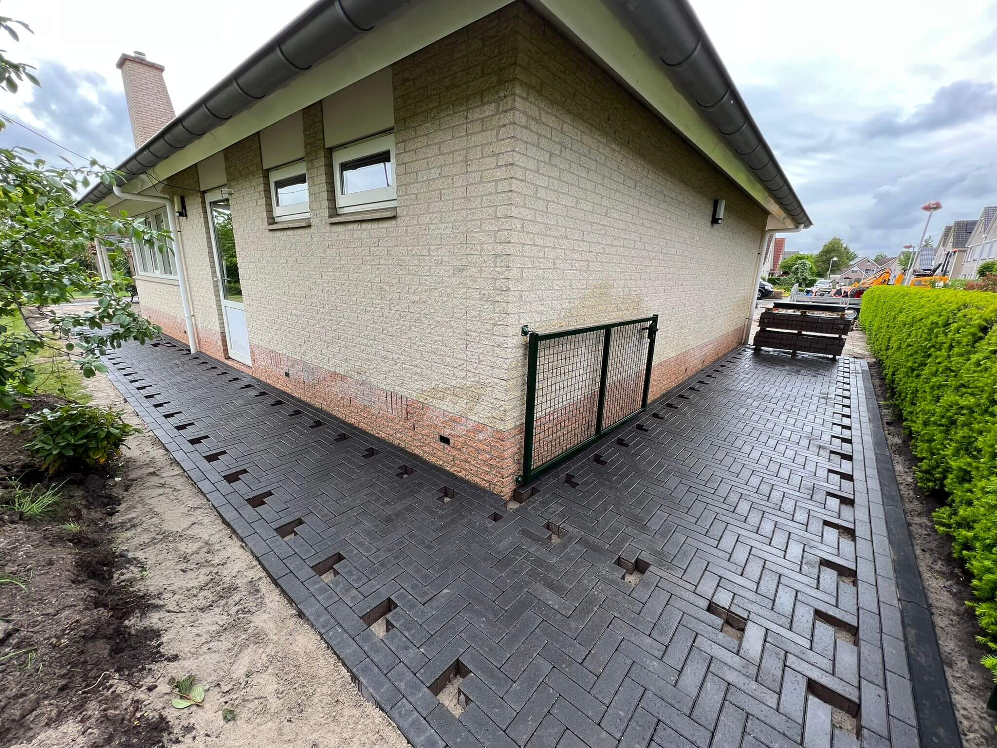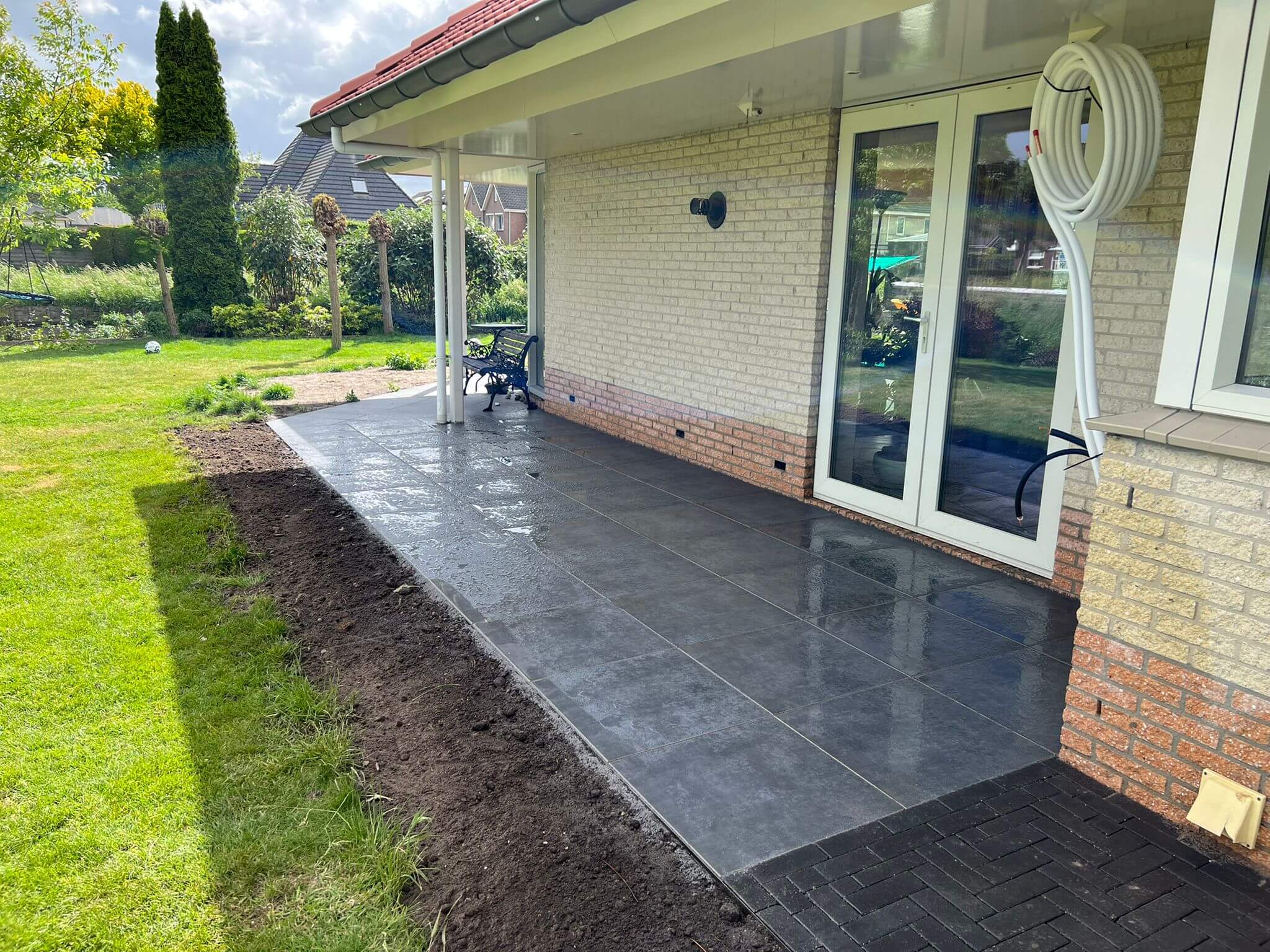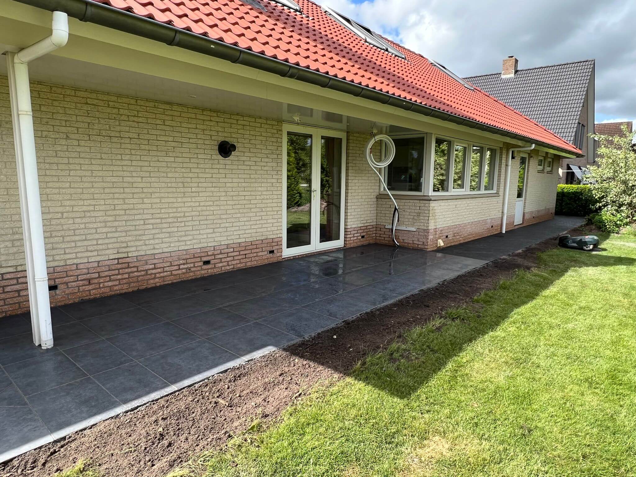 Het grondwerk hebben we uitgevoerd met klein materieel en 25 cm straatzand aangebracht. De paden zijn uitgevoerd met een dikformaat van MBI 8cm kleur antraciet. In het terras GeoCeramica 60x60x4 cm Starter One smoke. De tegel heeft een toplaag van 1 cm keramiek onlosmakelijk verbonden met de waterdoorvoerende Stabikorn laag aangebracht. Onder de pergola zijn. tegels van 60x60x2,5/3,5 cm zwart hardsteen gelegd. Deze combinatie GeoCeramica met een mooie dikformaat geeft de tuin een strakke en nette uitstraling.