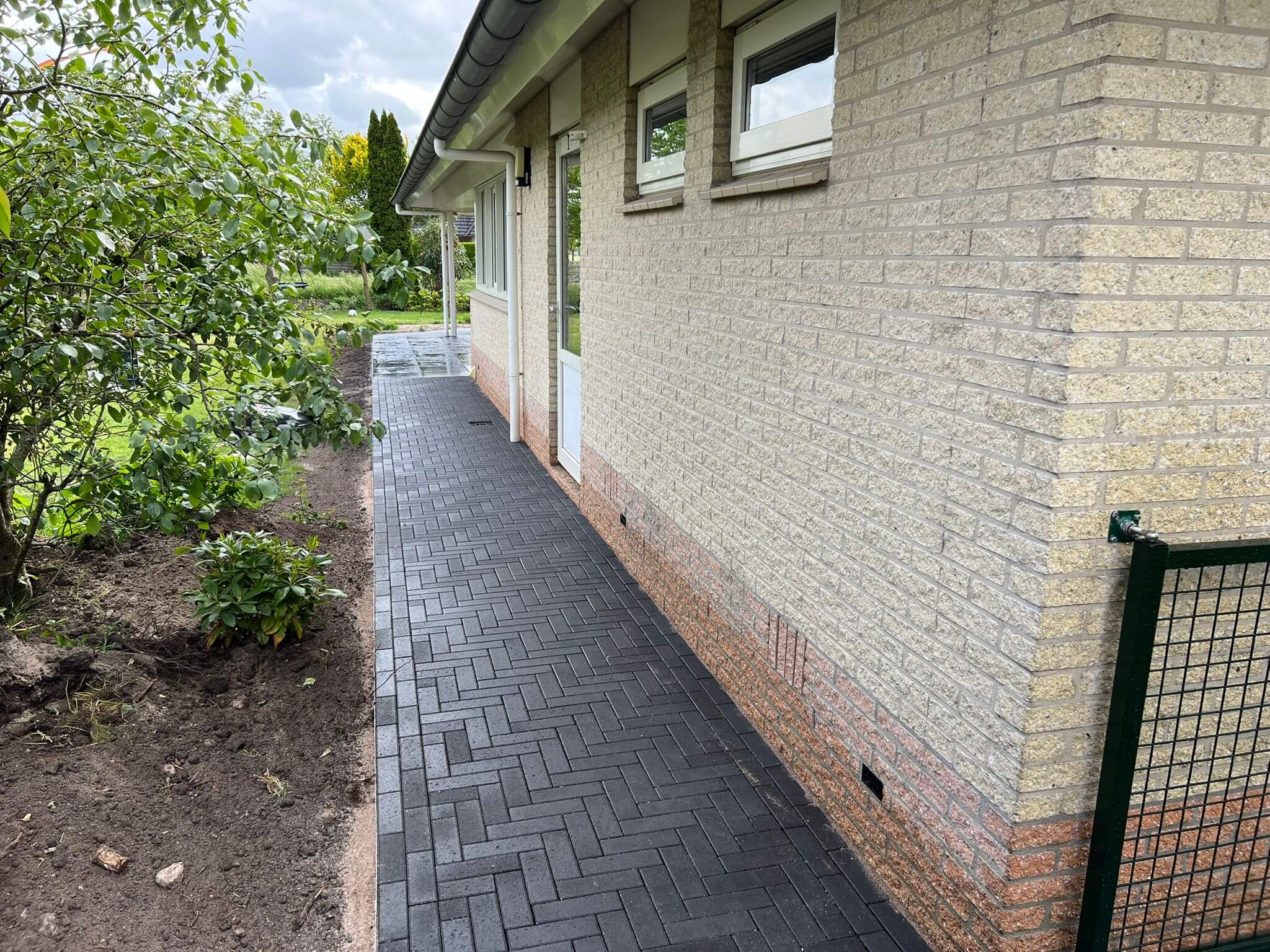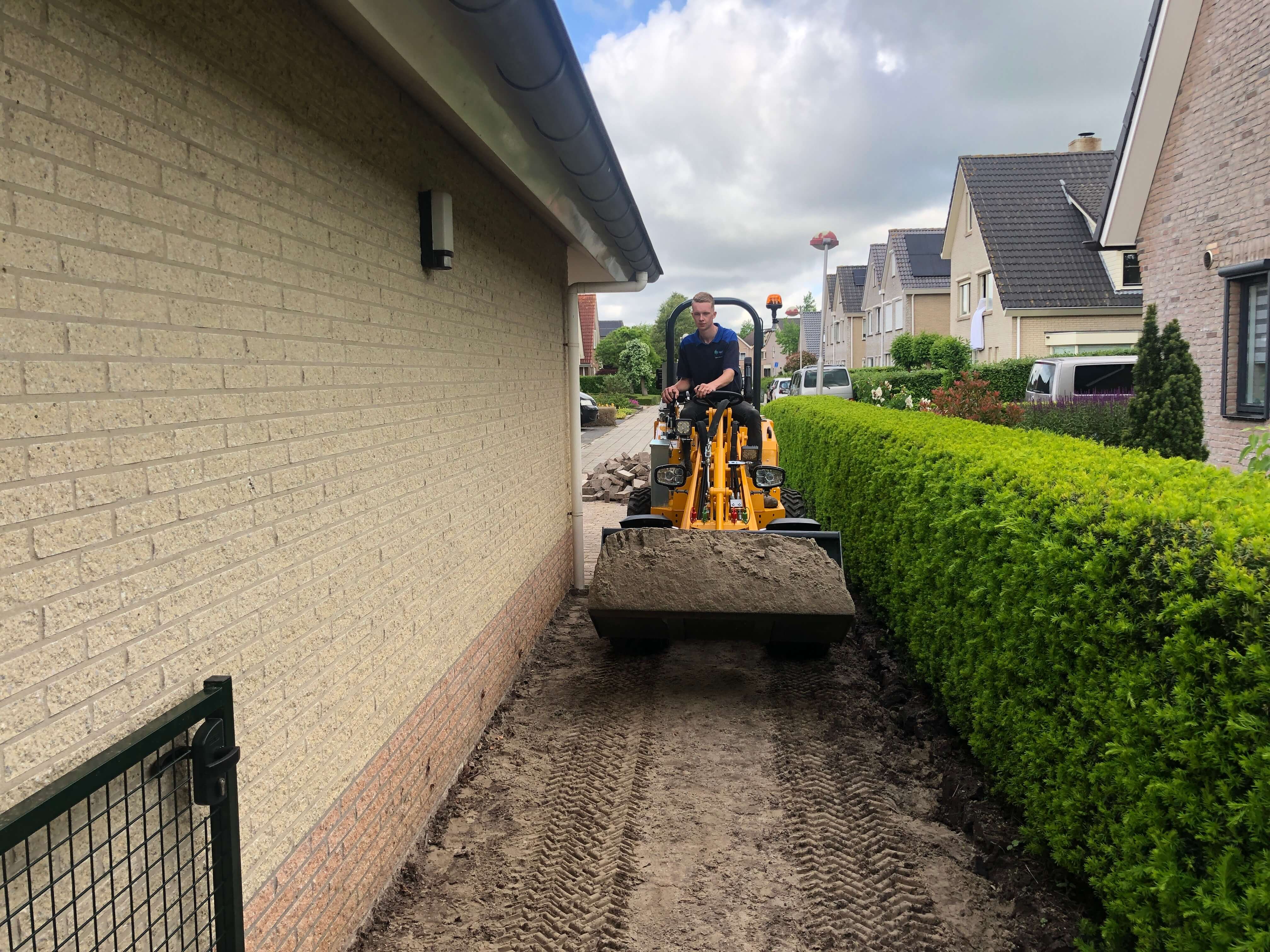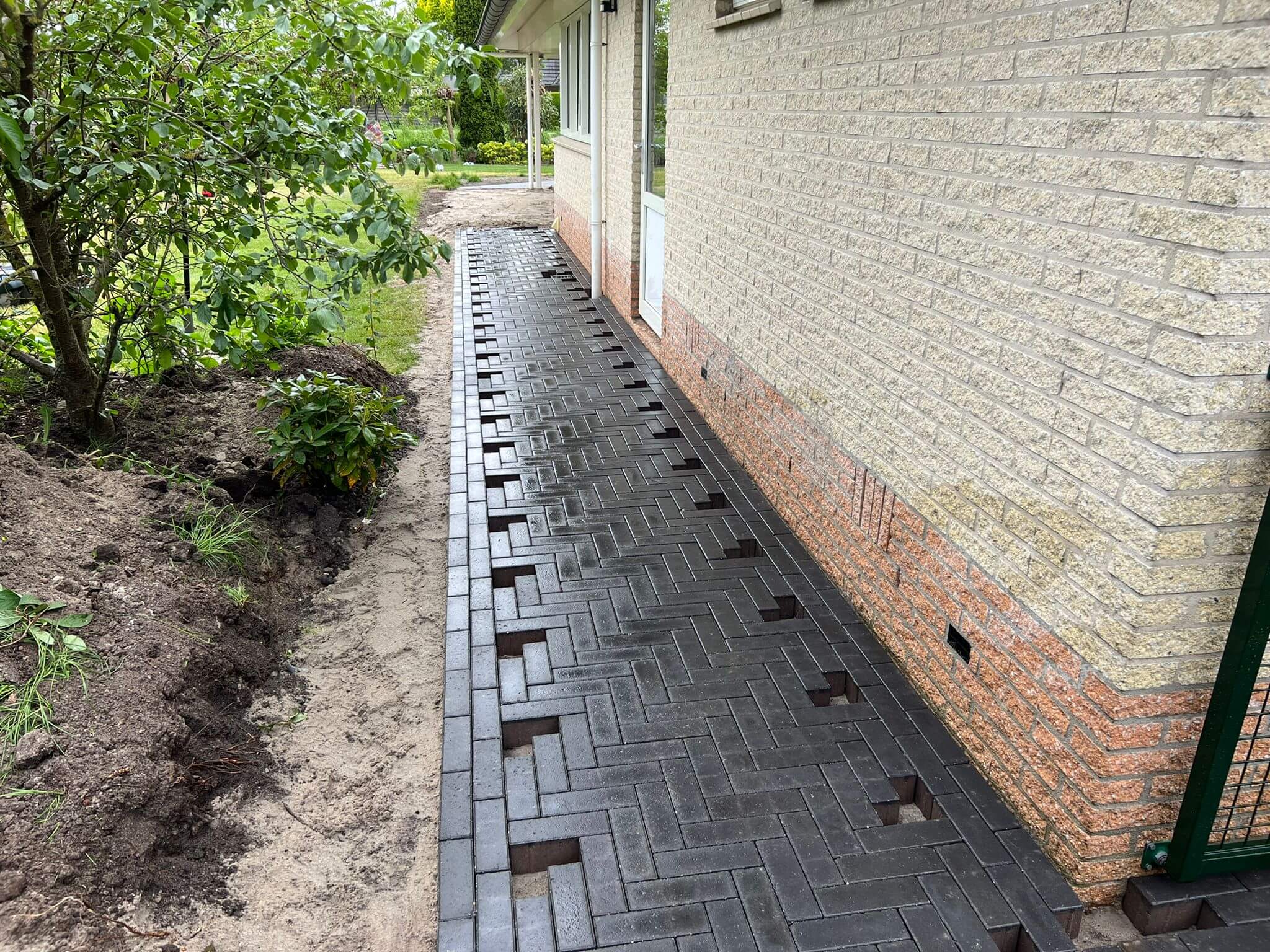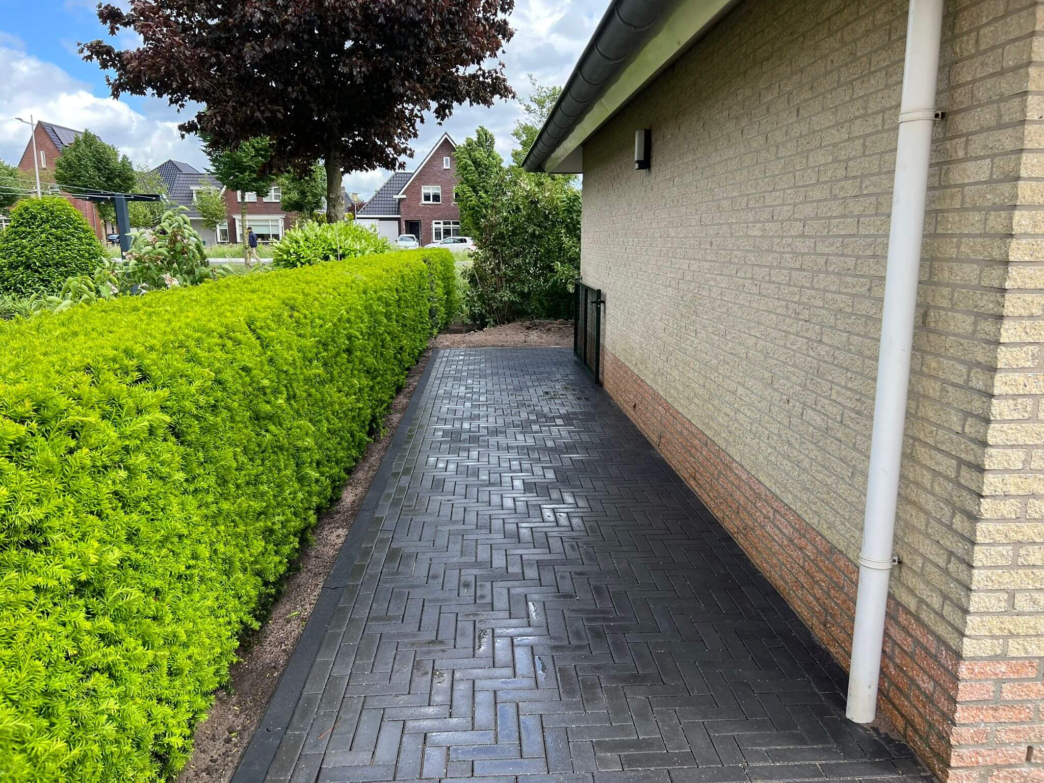 Het grondwerk hebben we uitgevoerd met klein materieel en 25 cm straatzand aangebracht. De paden zijn uitgevoerd met een dikformaat van MBI 8cm kleur antraciet. In het terras GeoCeramica 60x60x4 cm Starter One smoke. De tegel heeft een toplaag van 1 cm keramiek onlosmakelijk verbonden met de waterdoorvoerende Stabikorn laag aangebracht. Onder de pergola zijn. tegels van 60x60x2,5/3,5 cm zwart hardsteen gelegd. Deze combinatie GeoCeramica met een mooie dikformaat geeft de tuin een strakke en nette uitstraling.