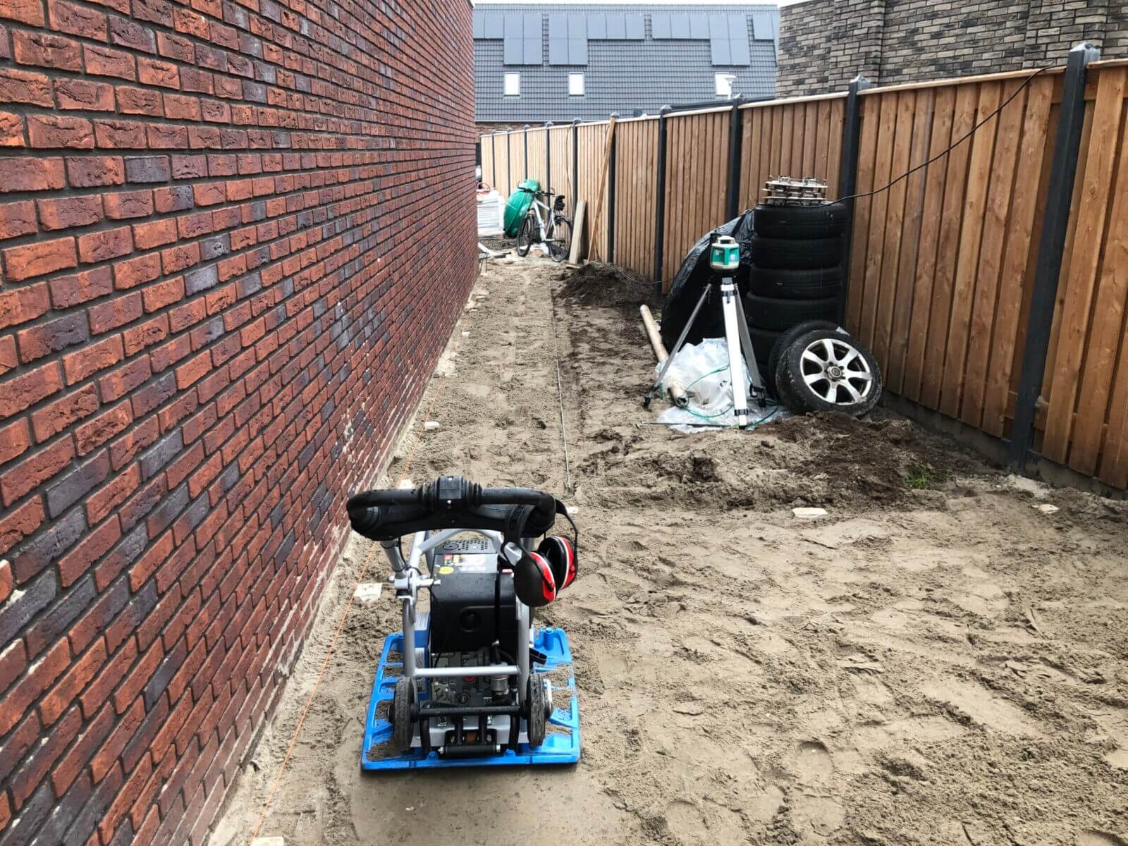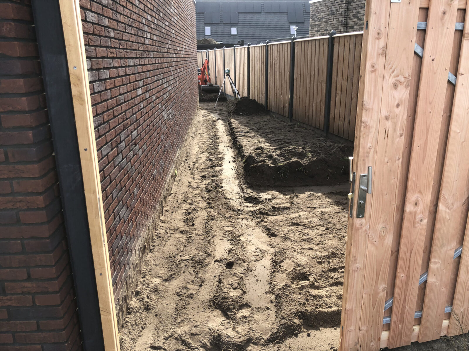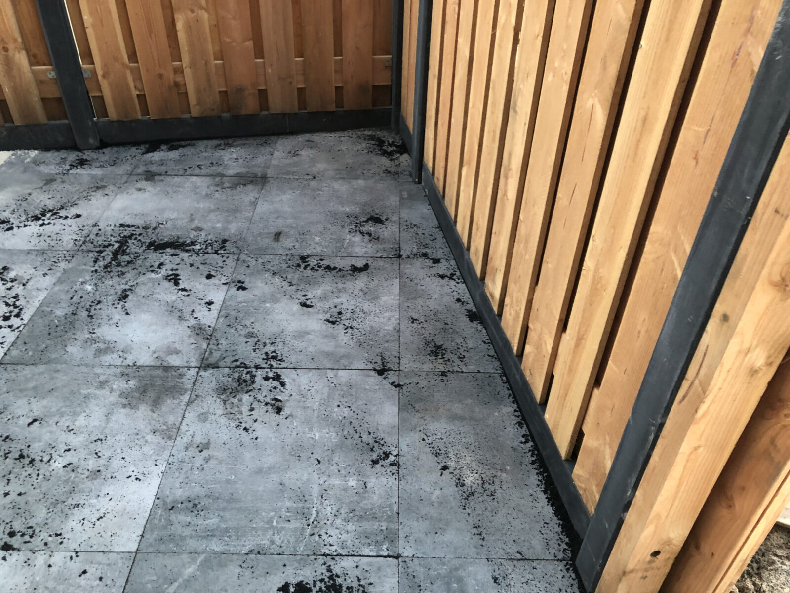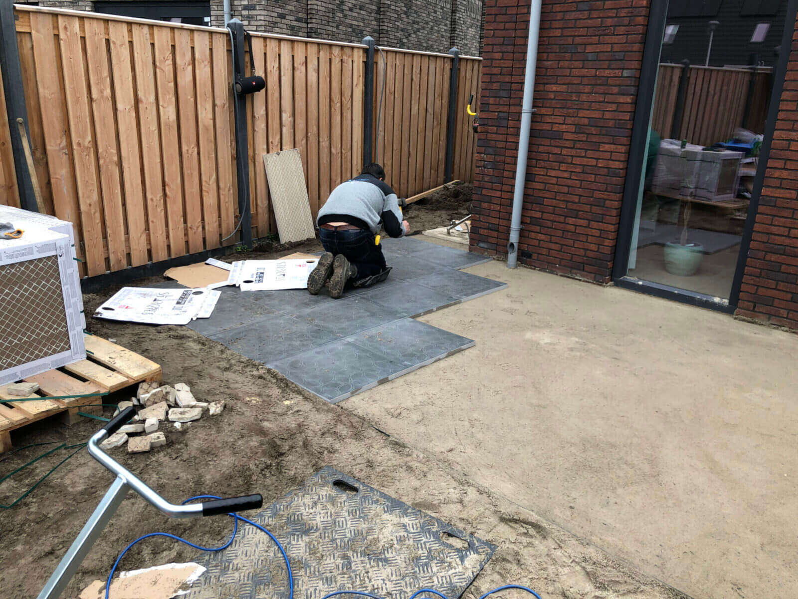 We hebben eerst het grondwerk uitgevoerd met klein materieel. 25cm straatzand in het terras en menggranulaat 0-31,5 in de oprit aangebracht. Waarna we de terrassen hebben aangelegd met keramische Gardenlux CERA3LINE LUX&DUTCH 60x60x3cm SQUARE DECOR tegels en de paden van keramische houtlook tegels 90x40x3cm.