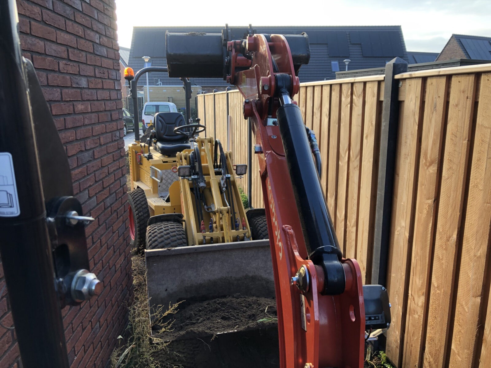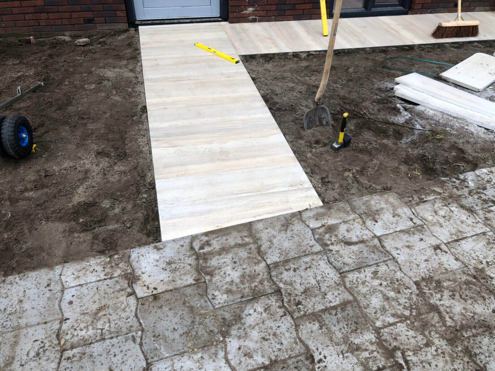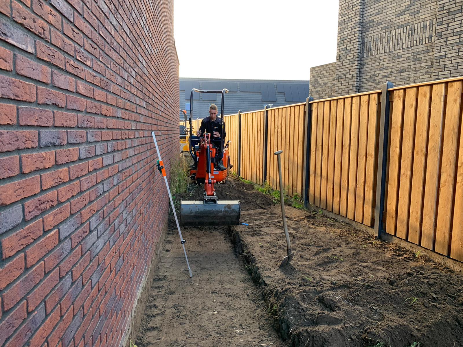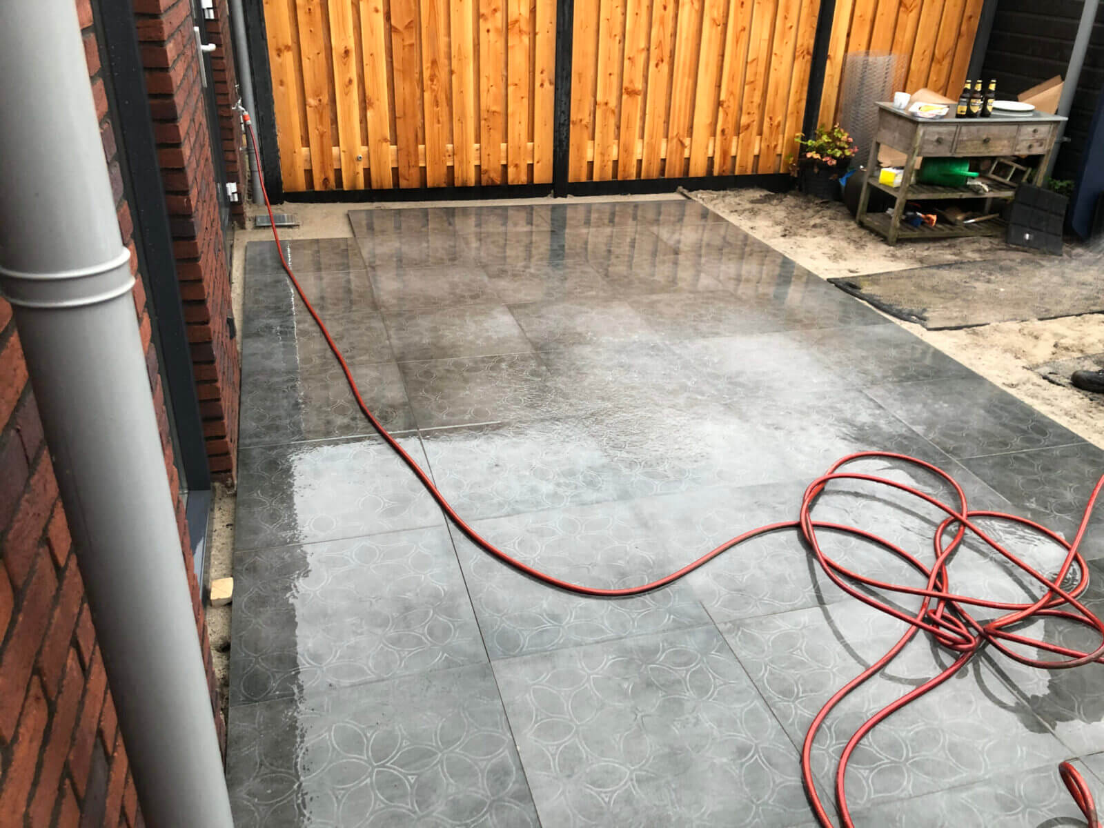 We hebben eerst het grondwerk uitgevoerd met klein materieel. 25cm straatzand in het terras en menggranulaat 0-31,5 in de oprit aangebracht. Waarna we de terrassen hebben aangelegd met keramische Gardenlux CERA3LINE LUX&DUTCH 60x60x3cm SQUARE DECOR tegels en de paden van keramische houtlook tegels 90x40x3cm.