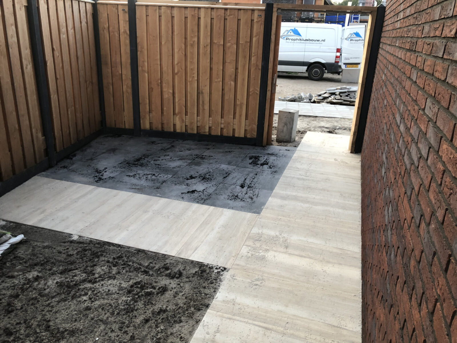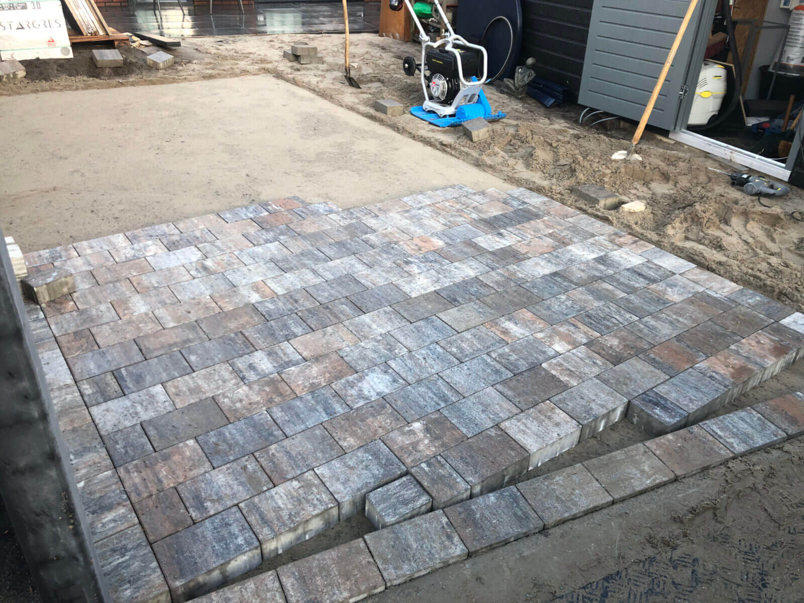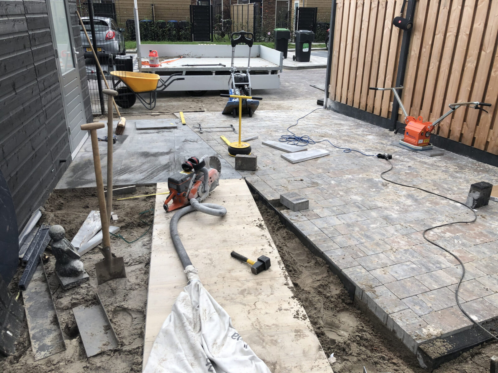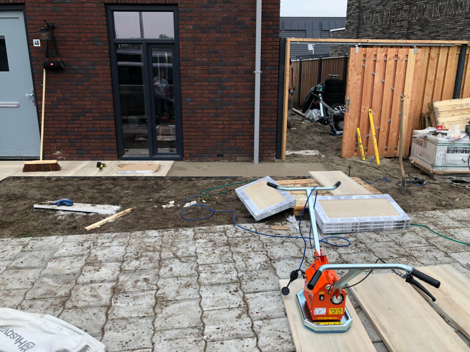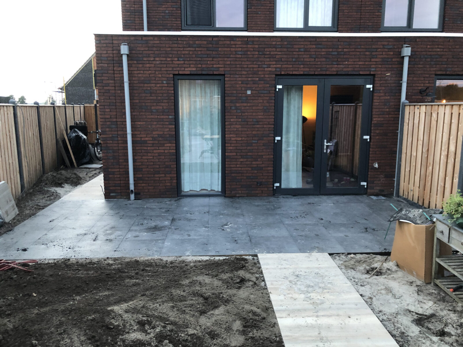 Aanleg nieuwe terrassen en oprit Elburg met keramische bestratingsmaterialen.