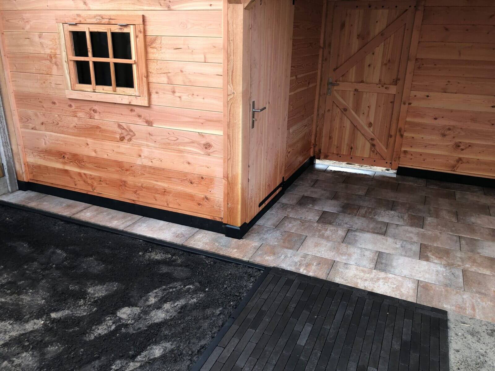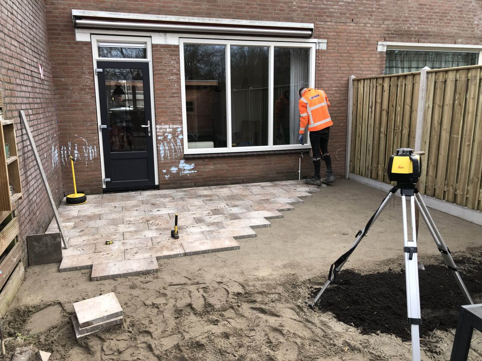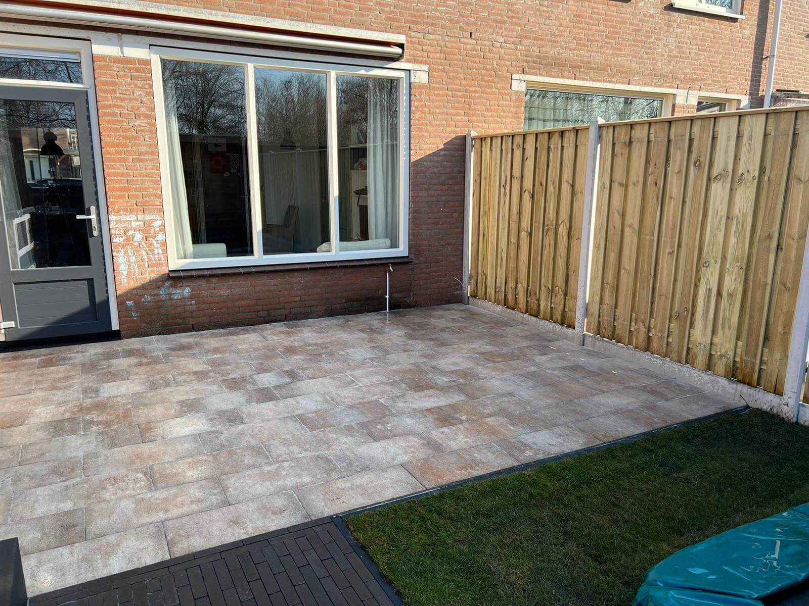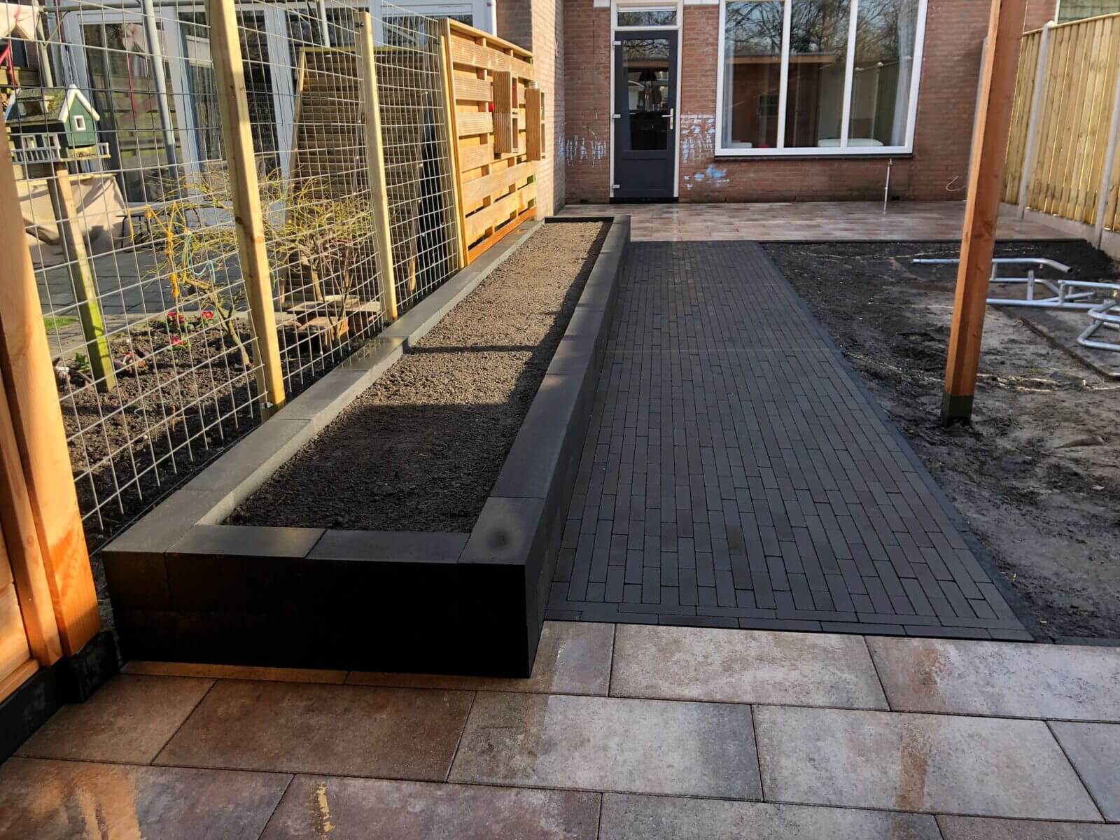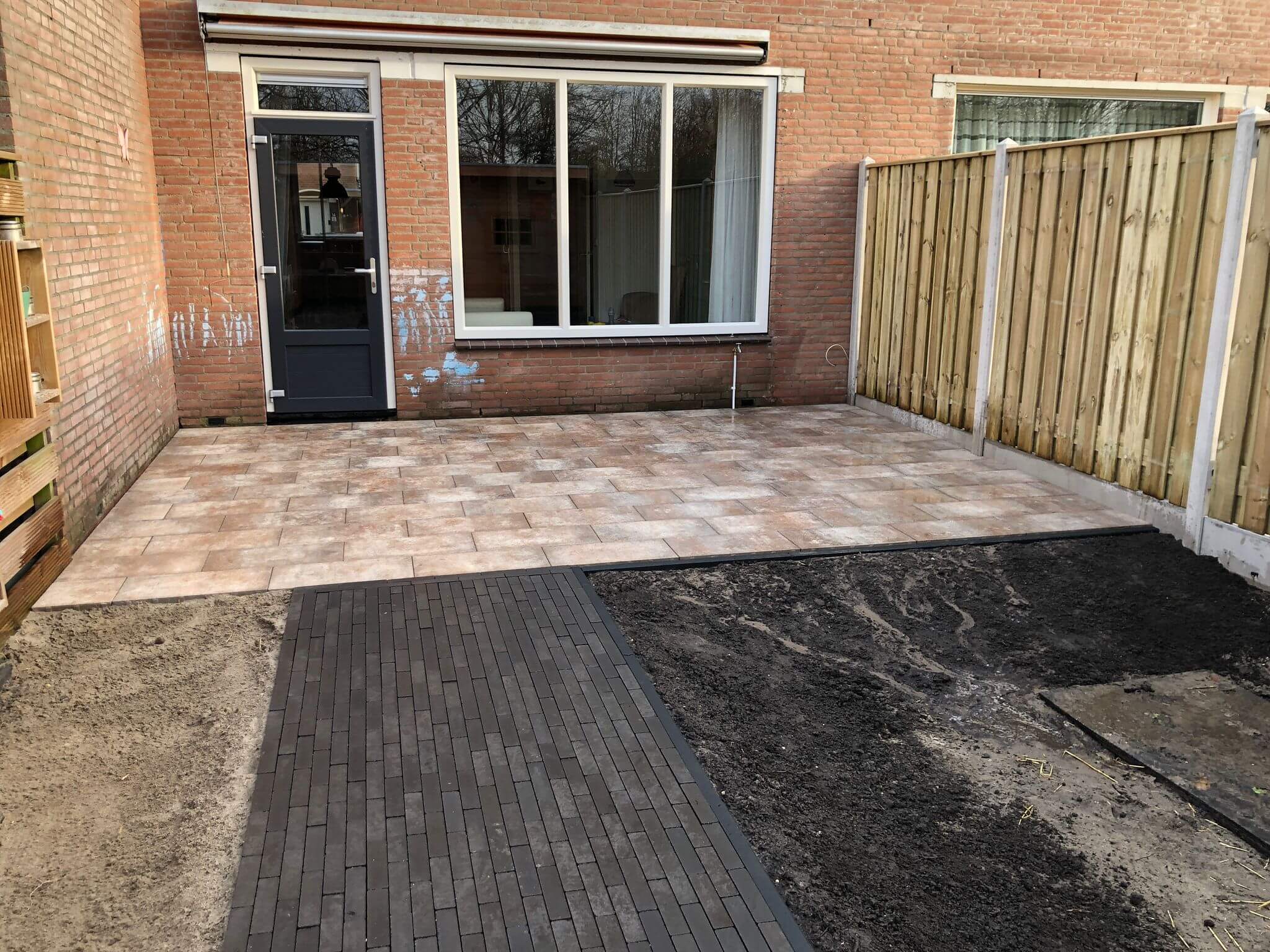 We hebben eerst tuin leeg gehaald het straatwerk en groen afgevoerd. Het grondwerk hebben we uitgevoerd met klein materieel en 25 cm straatzand aangebracht waarna we de hout-betonschutting en Douglas tuinschuur met overkapping hebben geplaatst. In het terras we Eliton Supreme XXS Lin 30x60x4cm Kilimanjaro tegels met een pad van zwarte MBI GeoCotto Nero waalformaat aangebracht. De borderbak is opgebouwd in 2 lagen van MBI patioblokken 15x15x60cm antraciet.