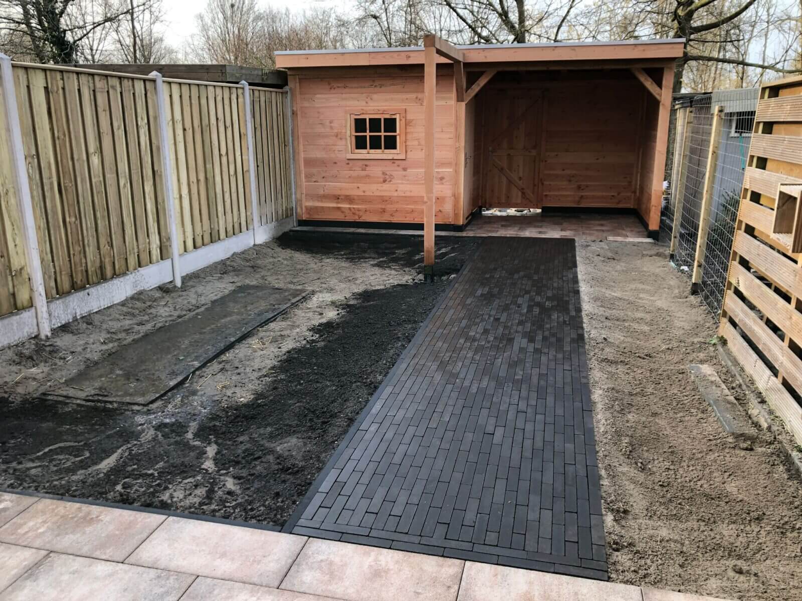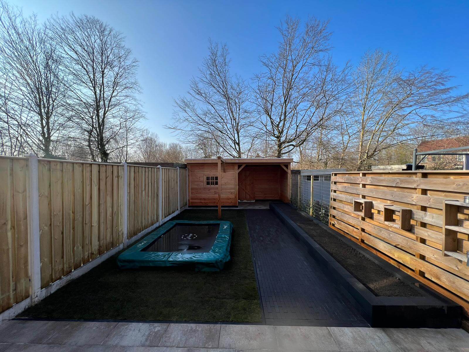 Aanleg tuin met tuinschuur Lelystad: grondwerk, nieuw terras, hout-betonschutting, tuinschuur en aanleg graszoden in Lelystad.