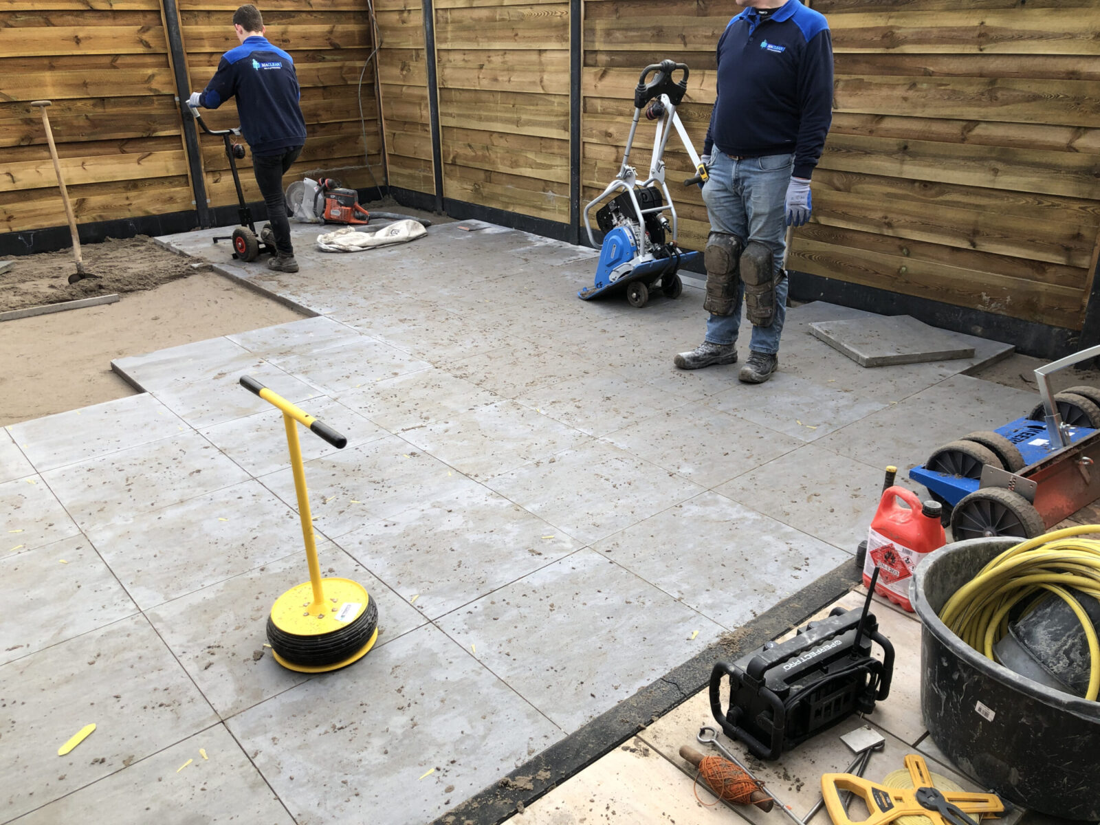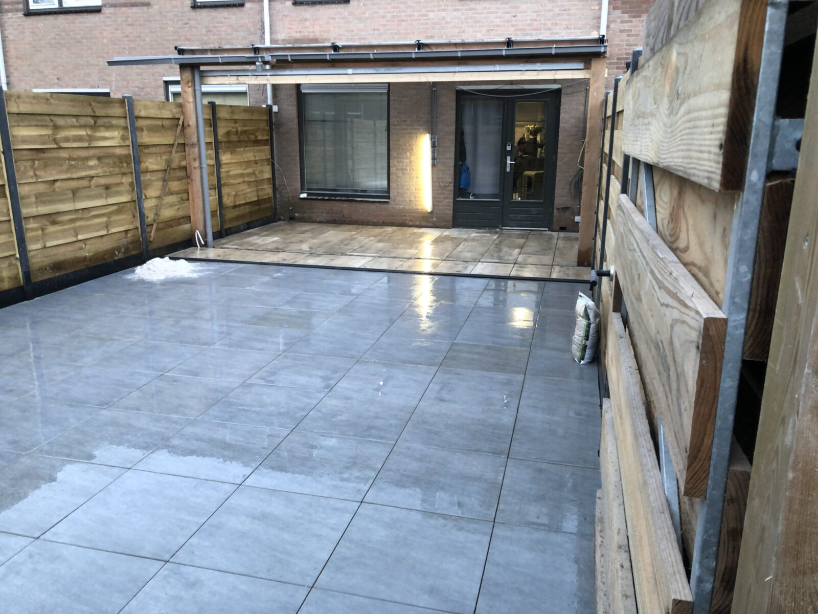 Keramische terras onder de overkapping en in de tuin gelegd en een sponning aangebracht voor het plaatsen van een overkapping.