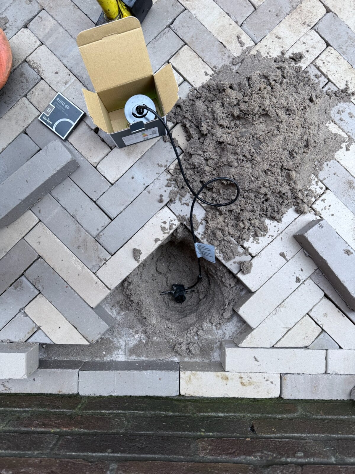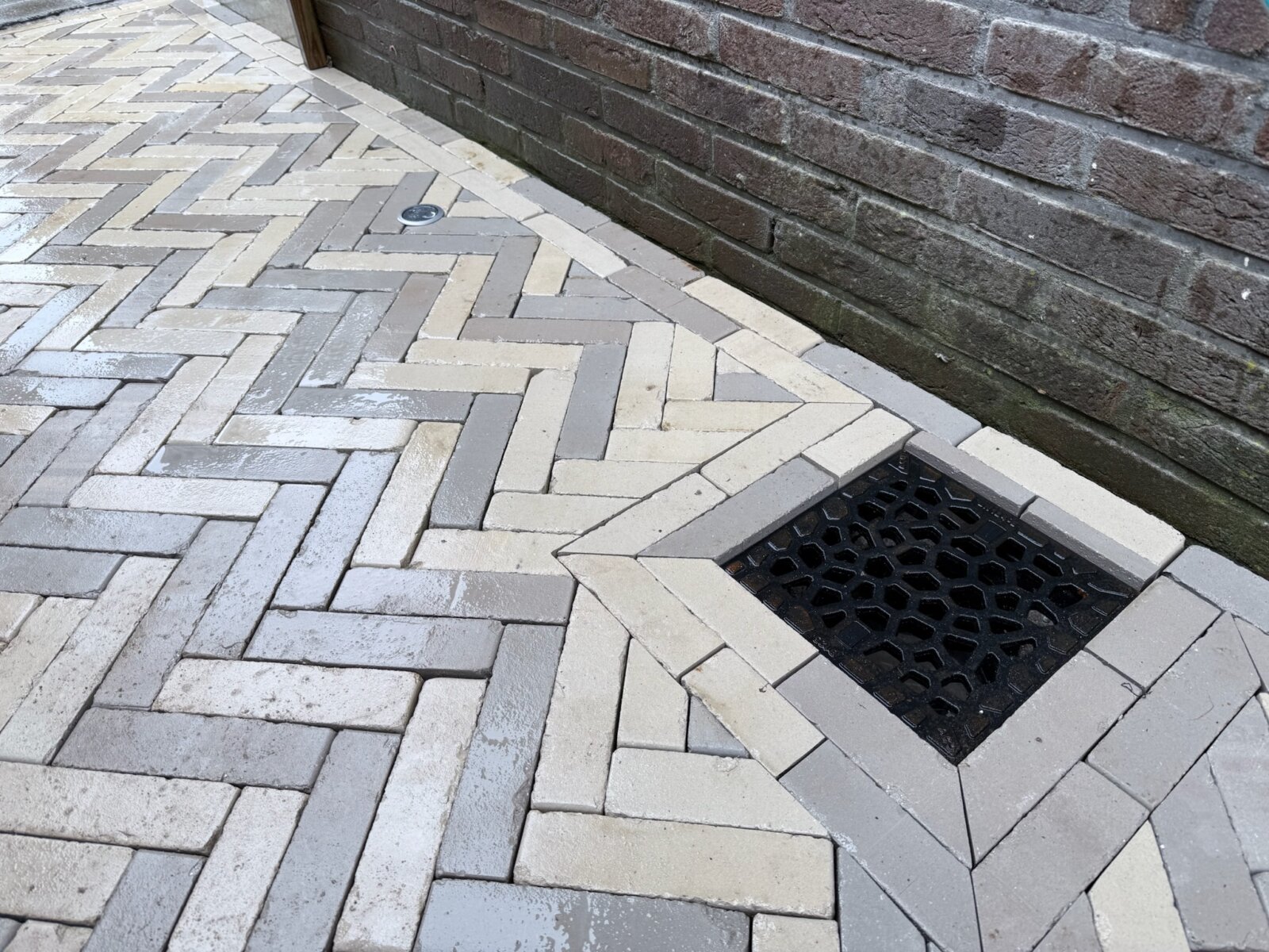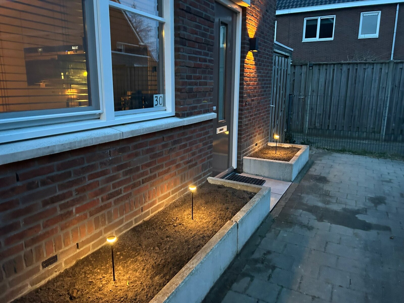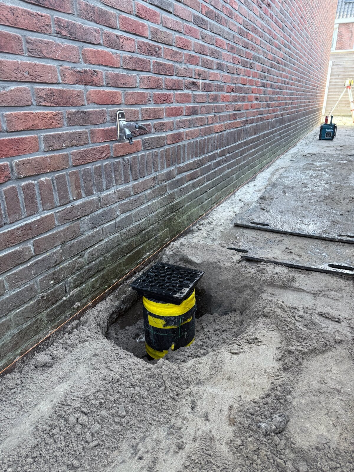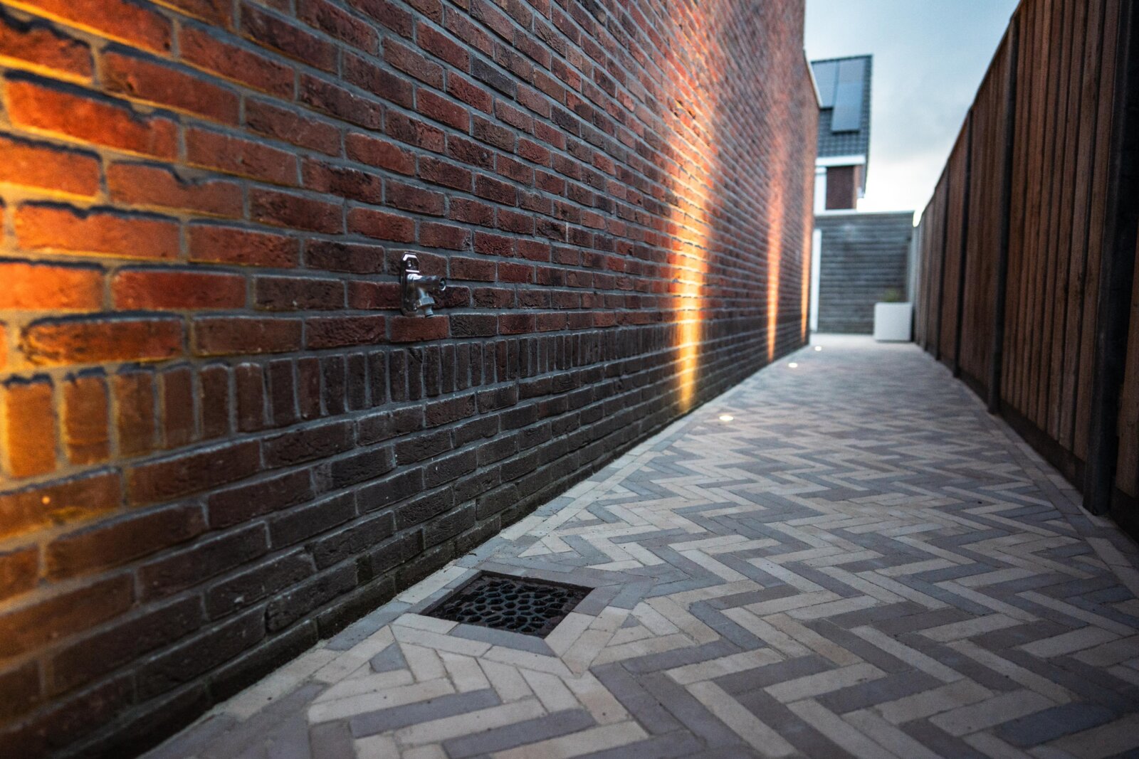 Onder de buitenkraan plaatsten we een ACO House & Garden infiltratieput. Deze put voert regenwater lokaal af in de bodem, zonder dat een aansluiting op de riolering nodig is. Een duurzame en praktische oplossing. Met deze tuinrenovatie in Zwolle laten we zien hoe bestrating, groen en verlichting samen een onderhoudsvriendelijke en exclusieve buitenruimte vormen.