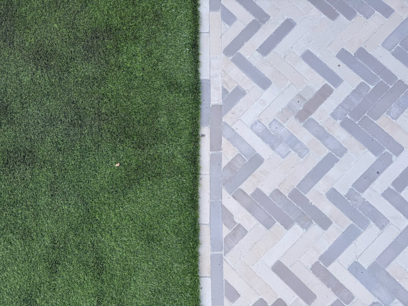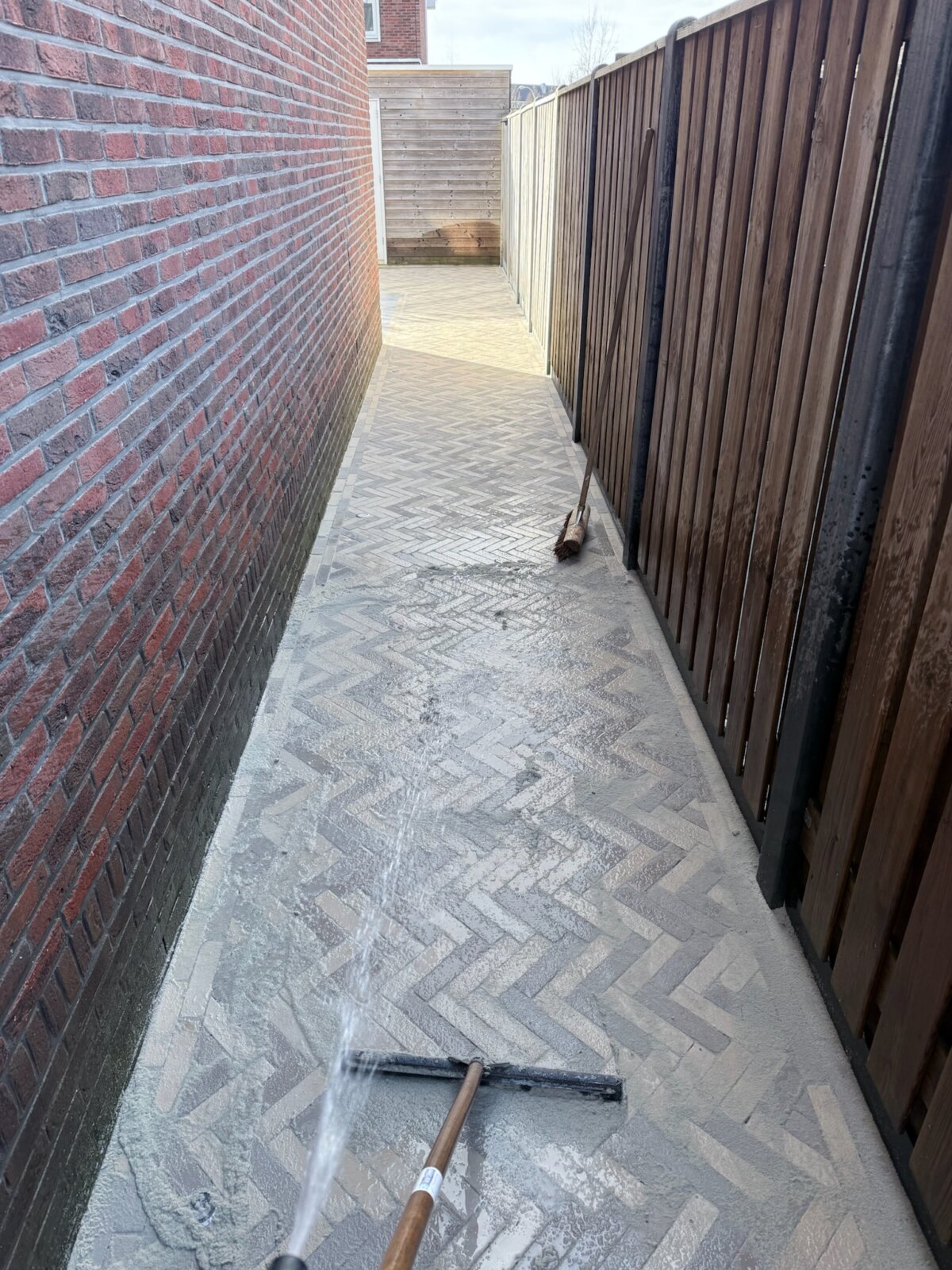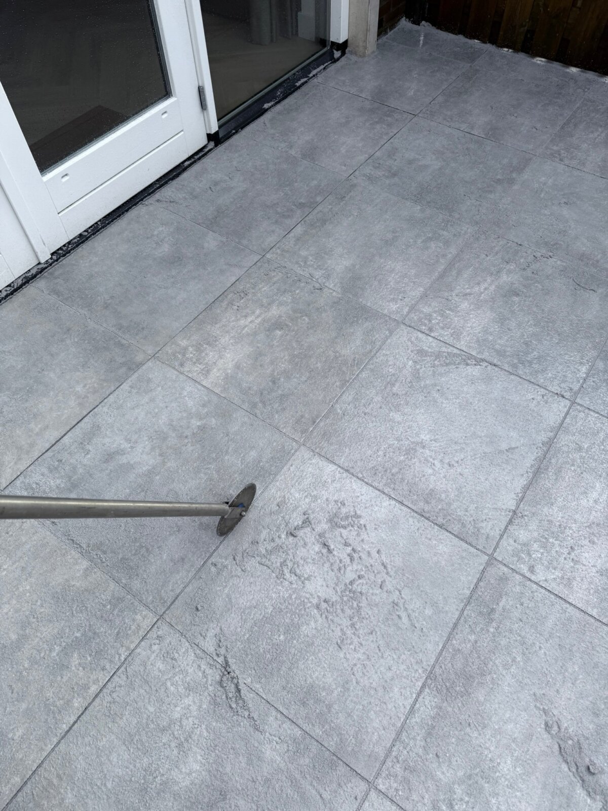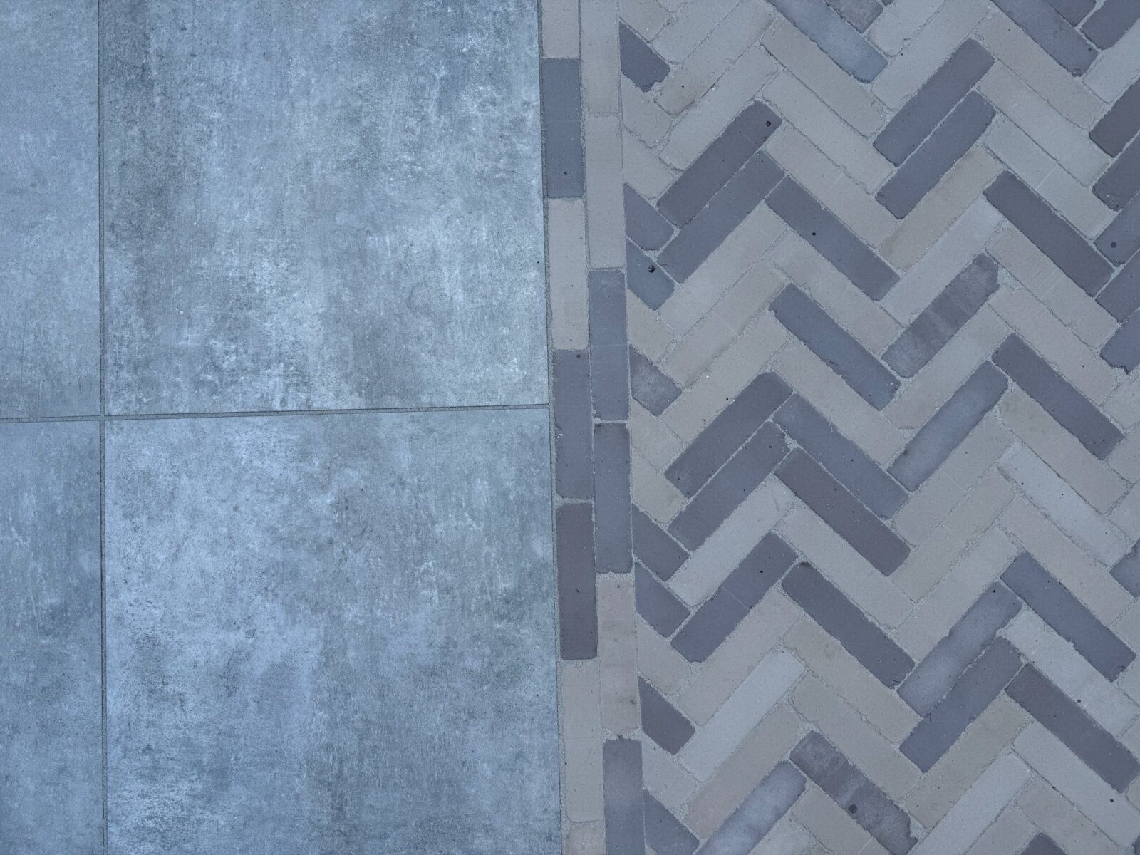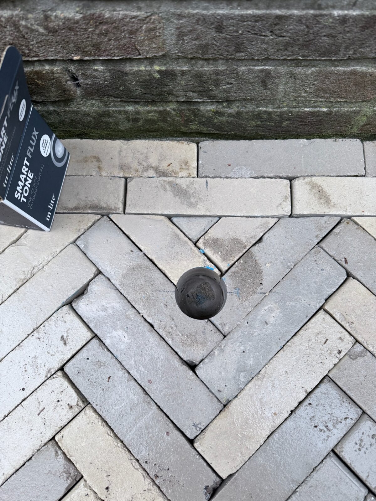 In het terras verwerkten we keramische tegels GeoCeramica® Evoque Greige 60x60x4 cm. Deze tegels hebben een toplaag van 1 cm keramiek en zijn verbonden met een water doorvoerende Stabikorn-laag. De voegen zijn afgewerkt met Varistone LM Aqua voegmortel in de kleur zilvergrijs. Dit zorgt voor een strakke uitstraling en voorkomt groei van onkruid. De paden zijn aangelegd met een gebakken waalformaat Gromo Antica genuanceerd van Van der Sanden. Ook hier kozen we voor een duurzame afwerking: de voegen zijn gevuld met Gatorsand Nitro ivoor. Deze voegmortel is waterdoorlatend en onderhoudsvriendelijk, waardoor de bestrating langer mooi blijft.