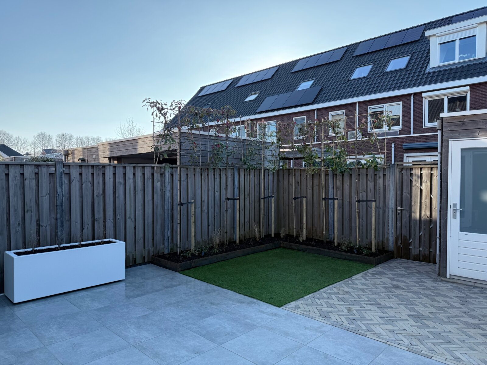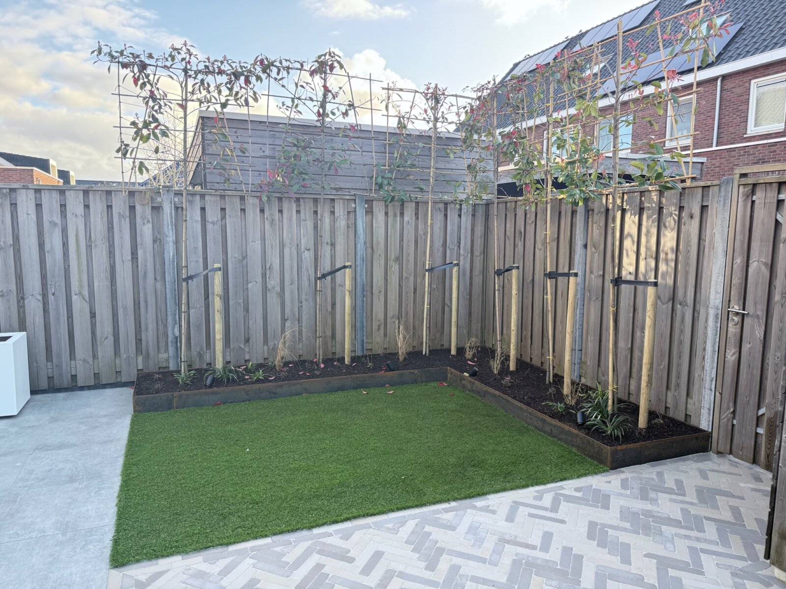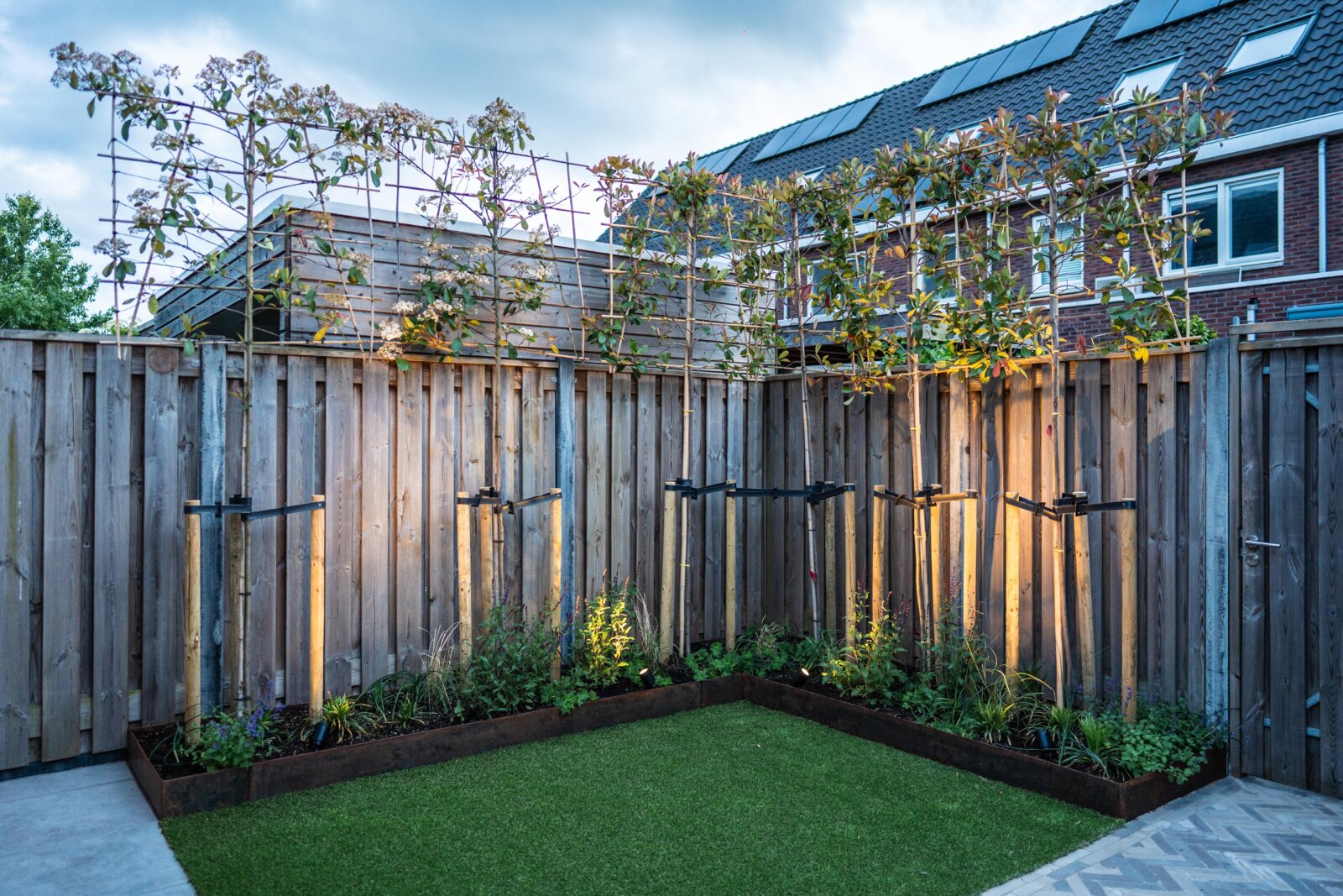 Voor een onderhoudsvriendelijke graszone legden we kunstgras van 42 mm dikte aan. Dit is geplaatst op een Drainbase waterdoorlatende onderplaat, gekoppeld via een connectiesysteem. Zo blijven de platen stevig op hun plaats en voert de ondergrond regenwater goed af. Tegen de achterwand plaatsten we vier Photinia Fraseri Red leibomen met een stamhoogte van 250 cm. Deze bomen zorgen voor schaduw, privacy en een groene beleving in de tuin.