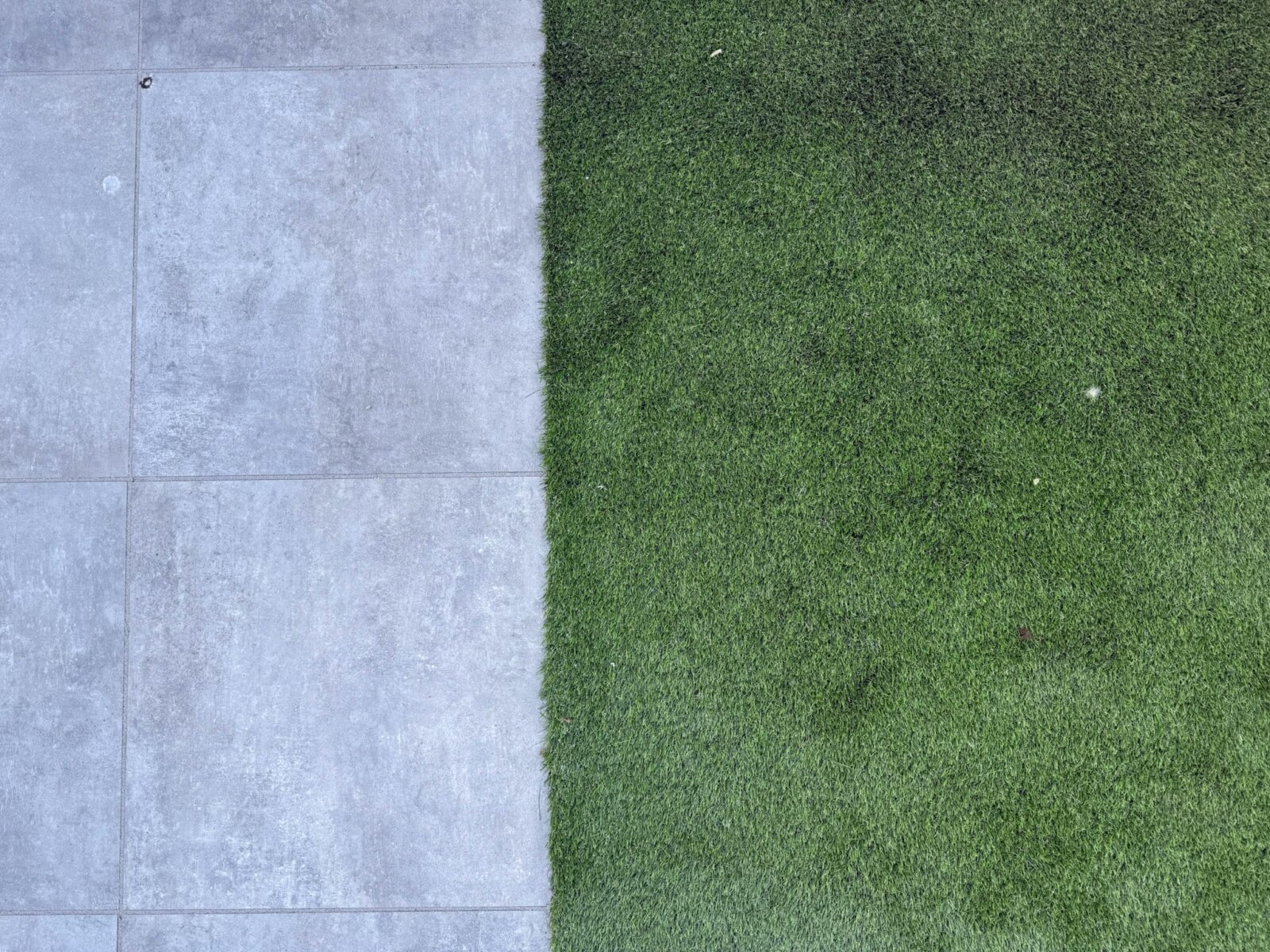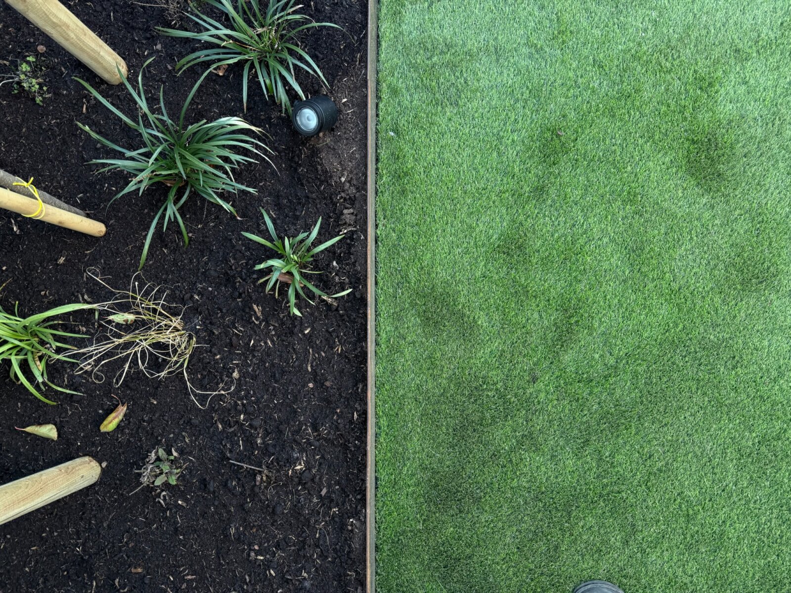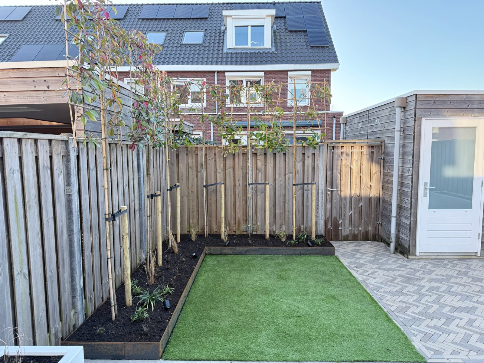 Voor een onderhoudsvriendelijke graszone legden we kunstgras van 42 mm dikte aan. Dit is geplaatst op een Drainbase waterdoorlatende onderplaat, gekoppeld via een connectiesysteem. Zo blijven de platen stevig op hun plaats en voert de ondergrond regenwater goed af. Tegen de achterwand plaatsten we vier Photinia Fraseri Red leibomen met een stamhoogte van 250 cm. Deze bomen zorgen voor schaduw, privacy en een groene beleving in de tuin.