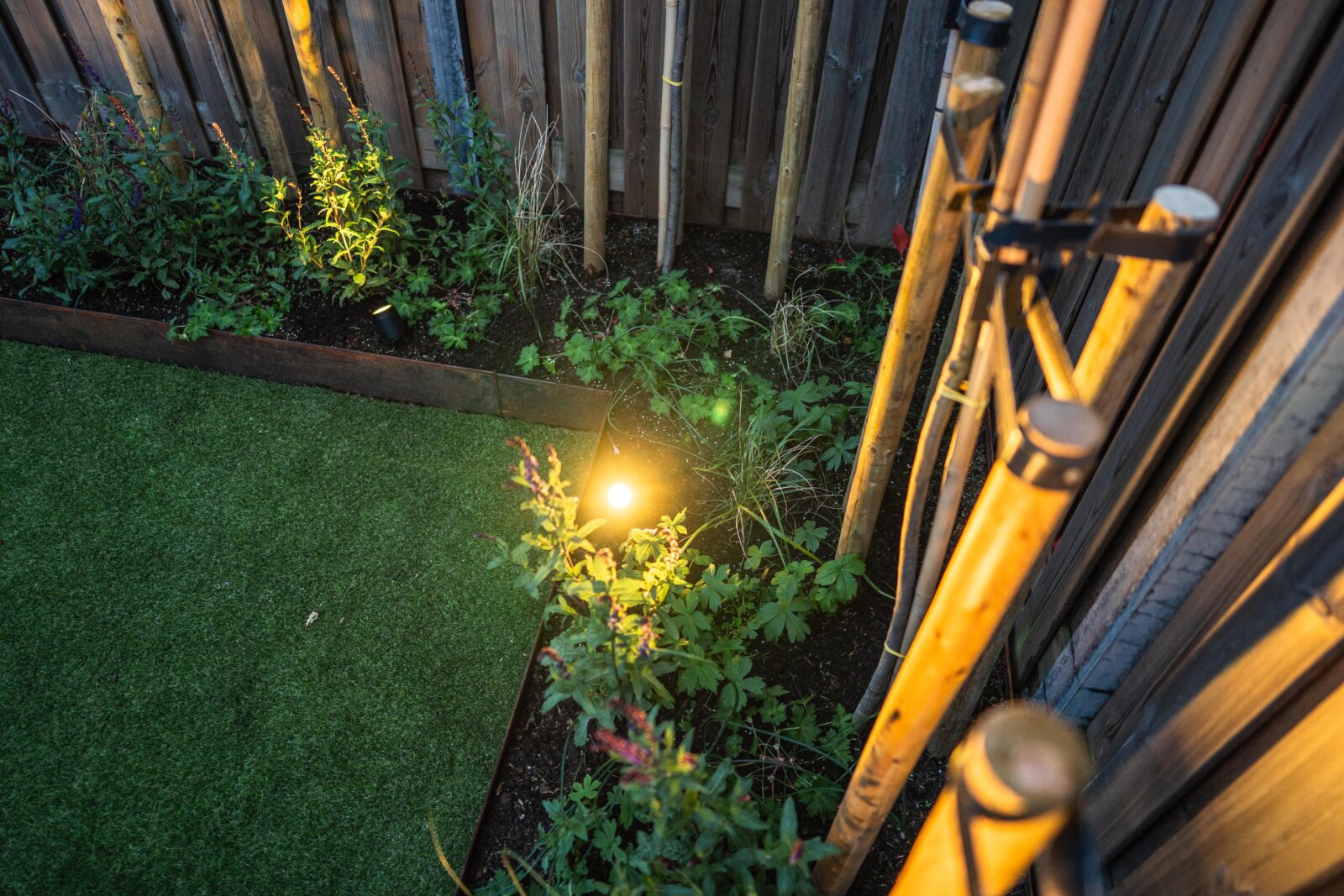 Langs de paden installeerden we In-Lite grondspots Smart Flux Tone Pearl Grey en in de borders bijpassende Mini Sway armaturen. In de achtertuin staan Smart Scope Tone Black spots die de bomen sfeervol uitlichten. De verlichting wordt aangestuurd door de Smart Hub-150, die via Bluetooth afzonderlijk te bedienen is. Zo is de verlichting volledig naar wens in te stellen. De In-Lite SMART spots bieden zowel kleurlicht als warm-wit licht en zijn geschikt voor alle soorten bomen. Dankzij de app kan elke spot individueel worden aangepast.