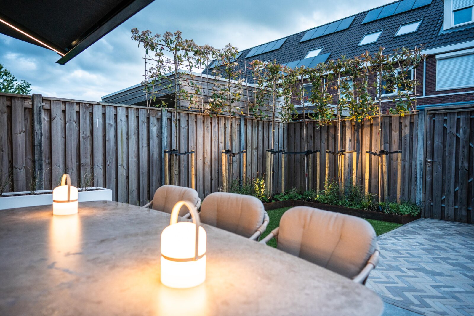 Exclusieve (voor)tuin Zwolle met keramisch terras, kunstgras en In-Lite verlichting
