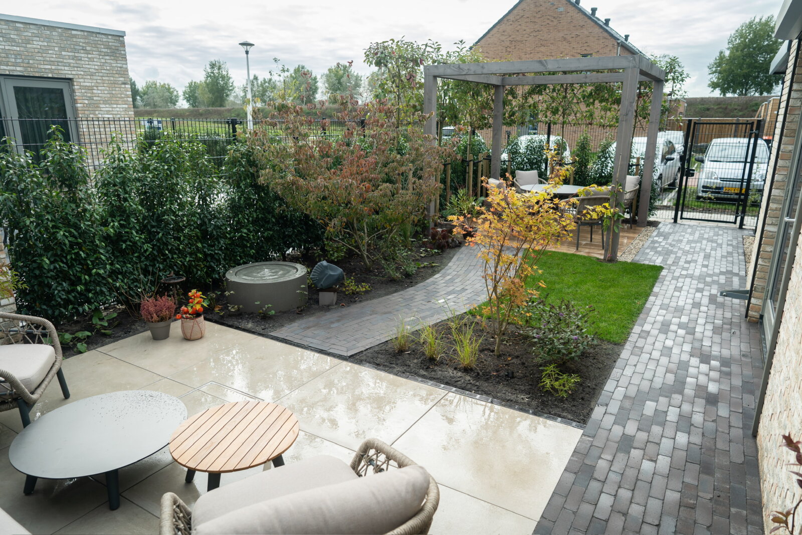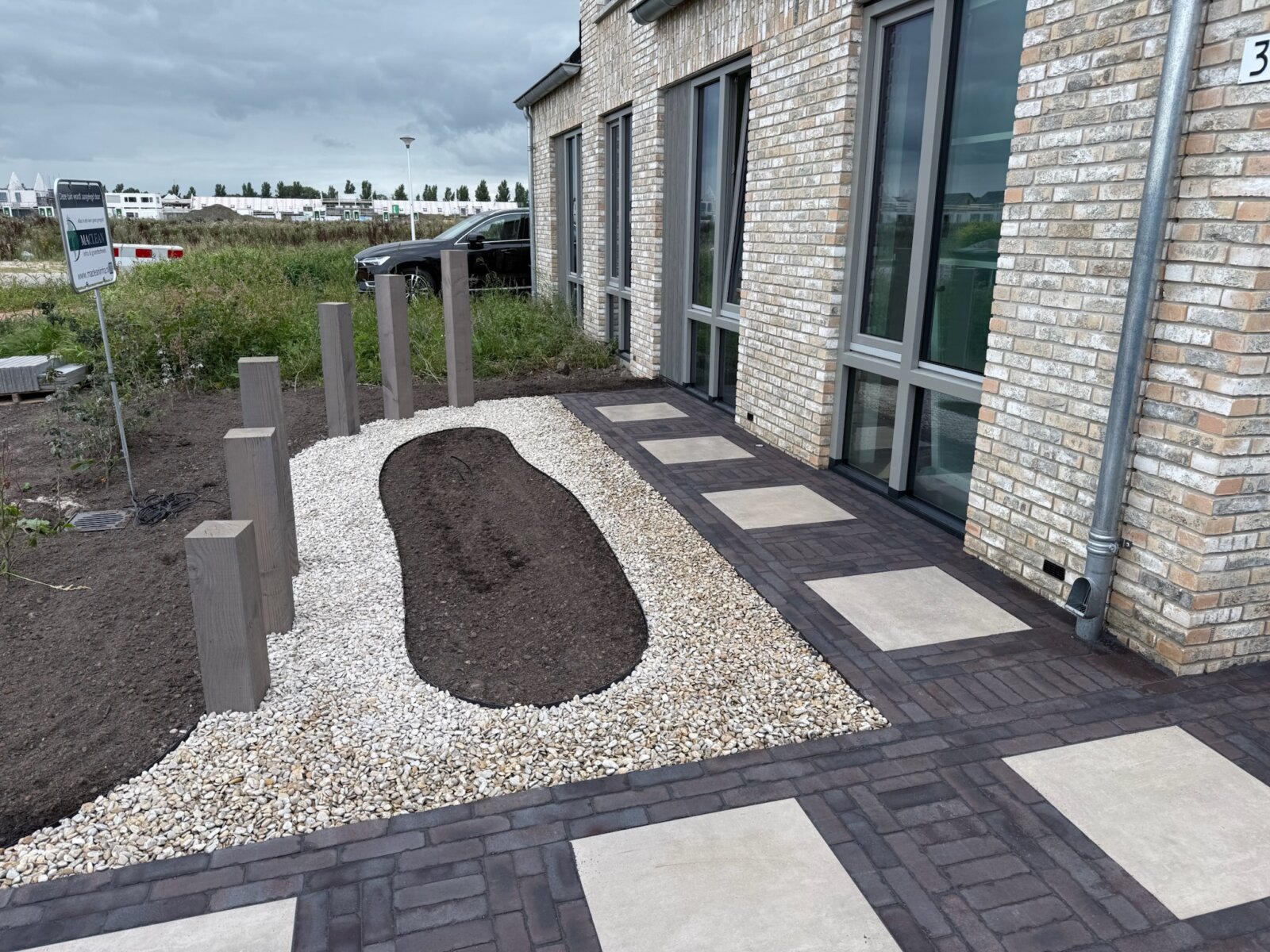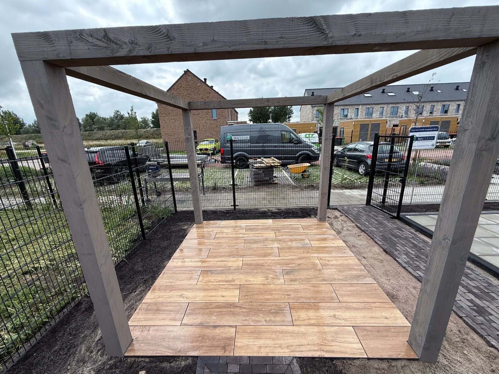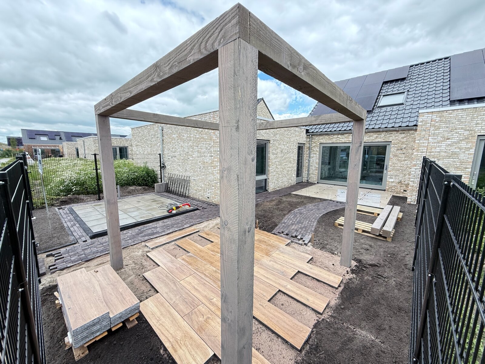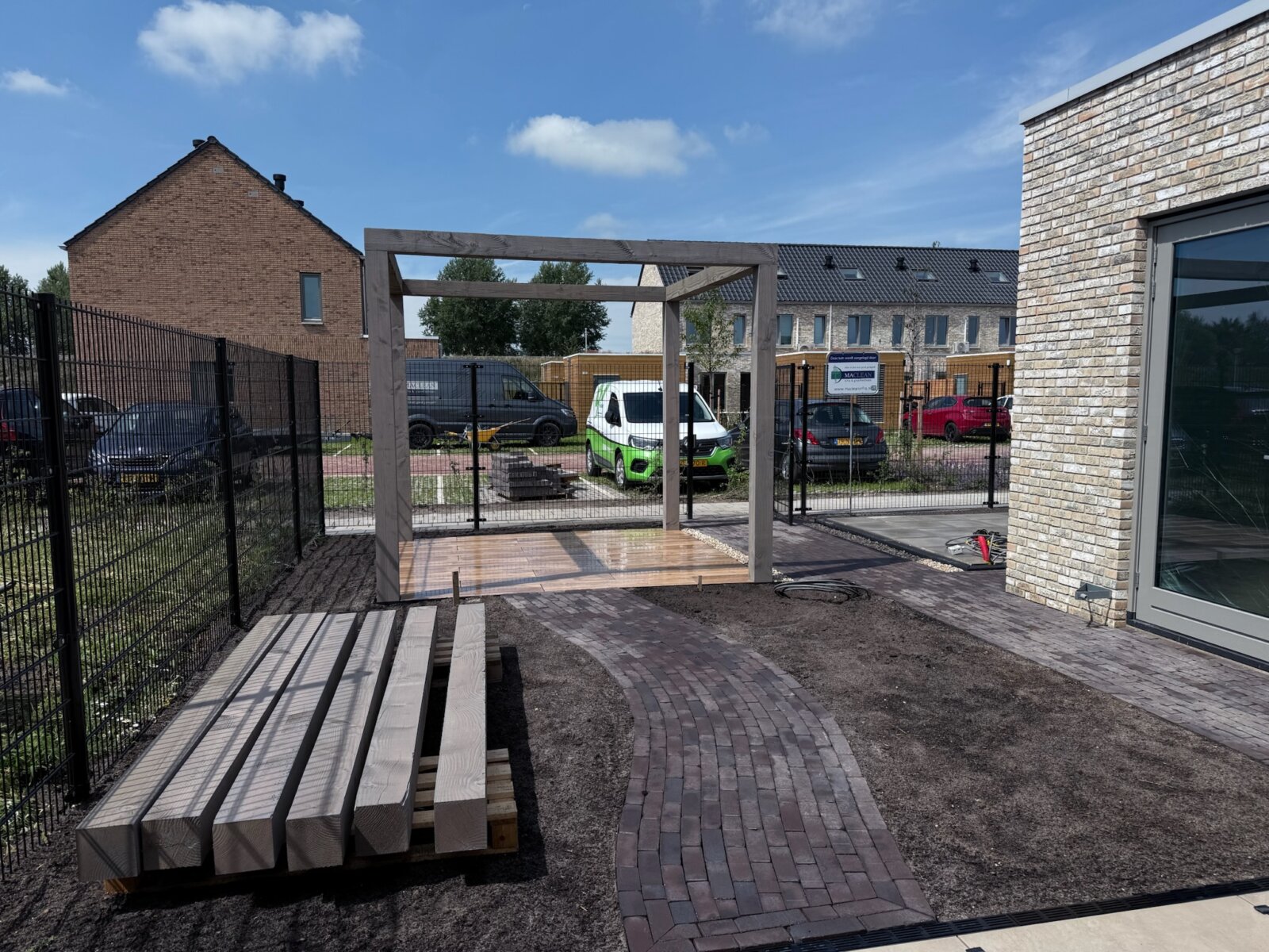 In de achtertuin staat inmiddels een pergola van Douglas palen 15×15 cm, behandeld met Douglasolie Dim Grey. Dit geeft de tuin een stoere, natuurlijke uitstraling. Het beplantingsplan bestaat uit kleurrijke en groene beplanting die voor schaduw en een levendige tuinbeleving zorgen. Het grasveld is alvast aangelegd met graszoden, zodat de tuin direct een frisse basis heeft.