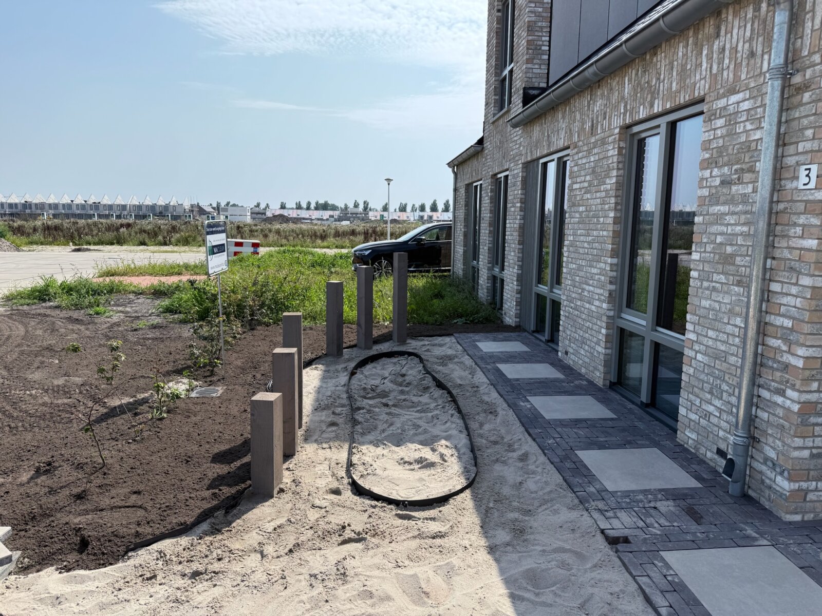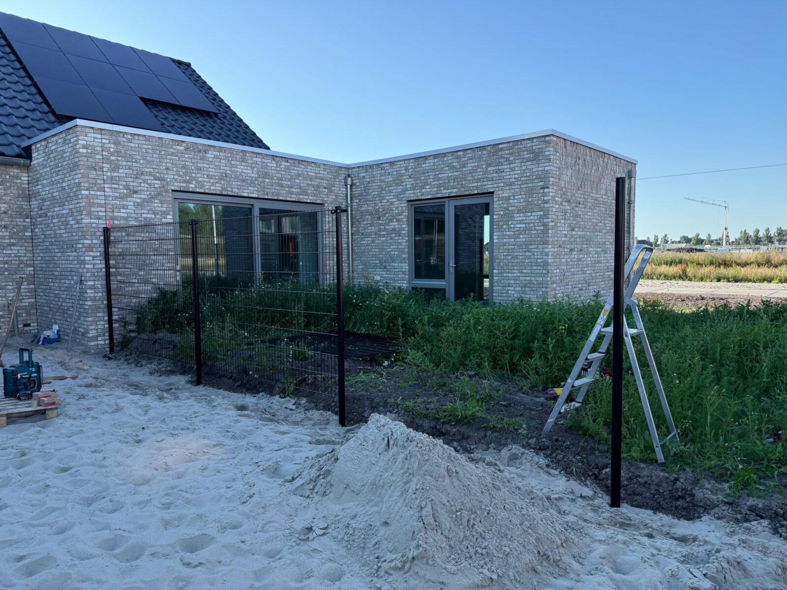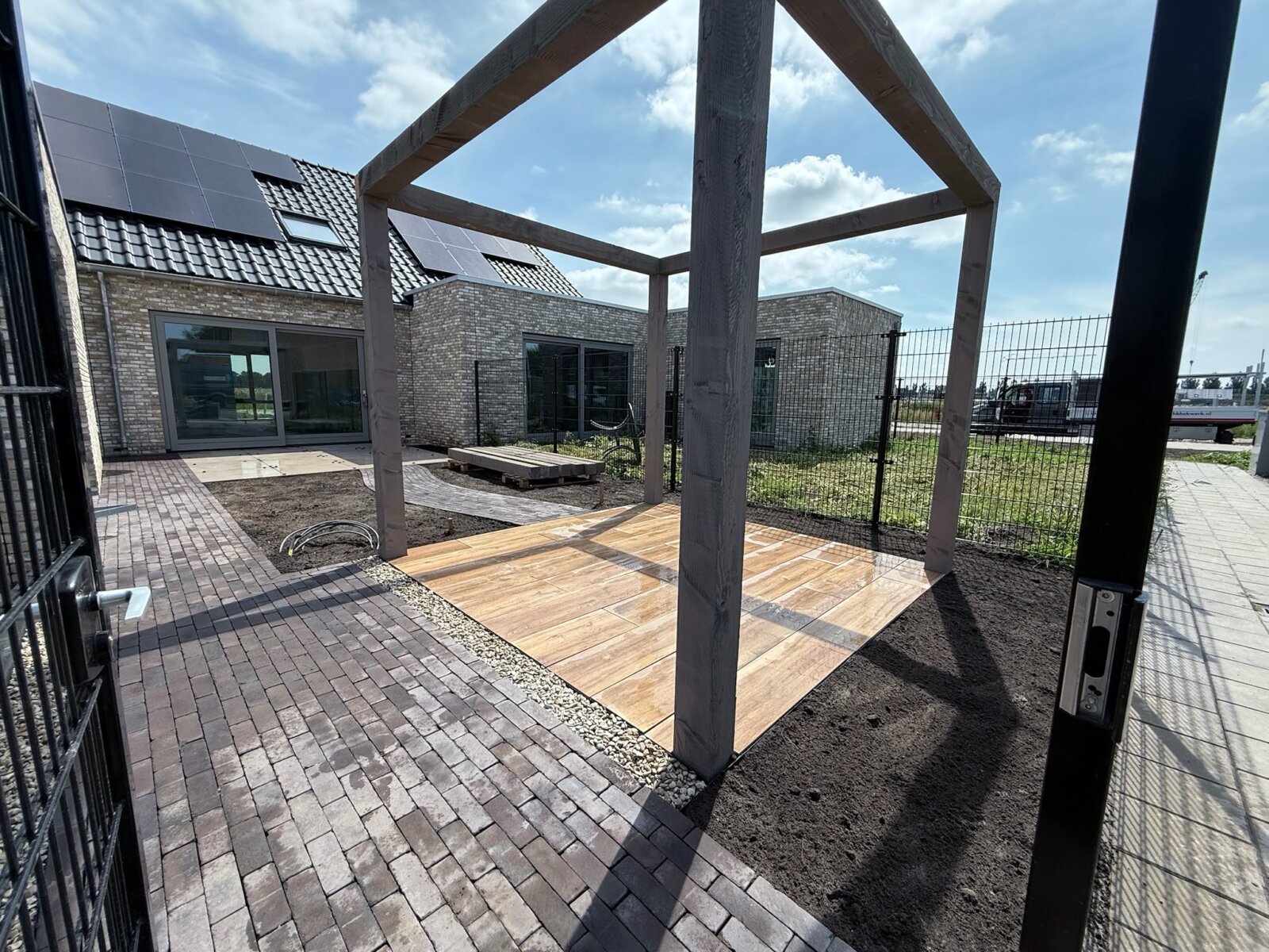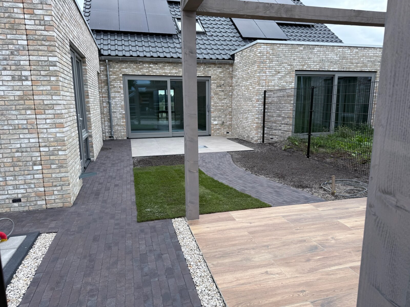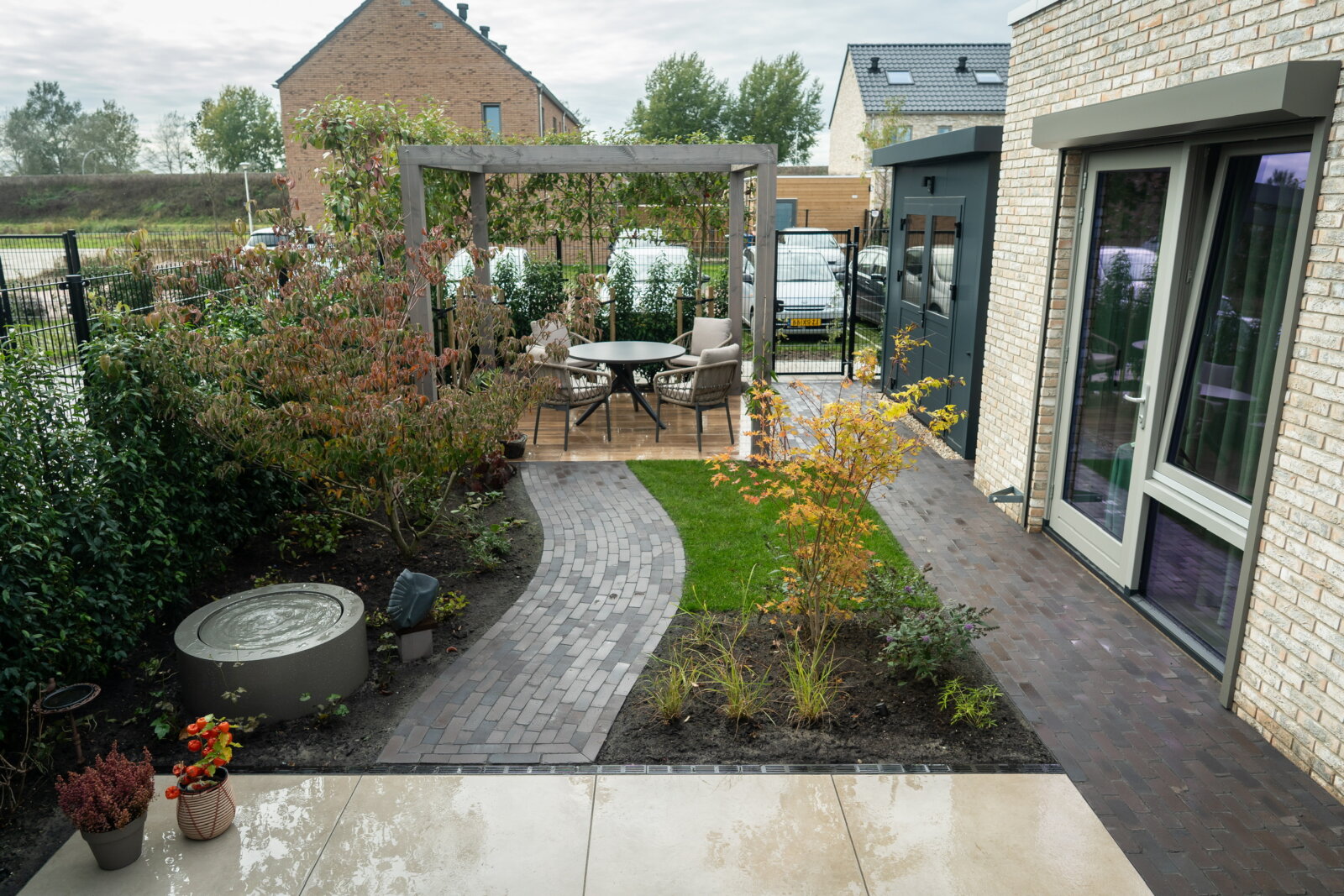 In de achtertuin staat inmiddels een pergola van Douglas palen 15×15 cm, behandeld met Douglasolie Dim Grey. Dit geeft de tuin een stoere, natuurlijke uitstraling. Het beplantingsplan bestaat uit kleurrijke en groene beplanting die voor schaduw en een levendige tuinbeleving zorgen. Het grasveld is alvast aangelegd met graszoden, zodat de tuin direct een frisse basis heeft.