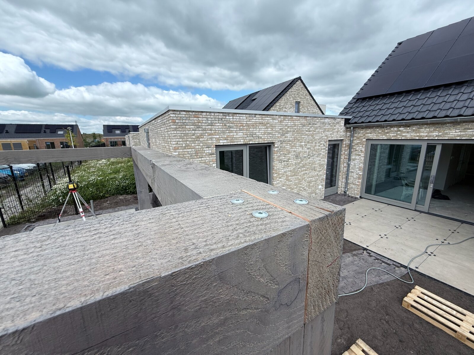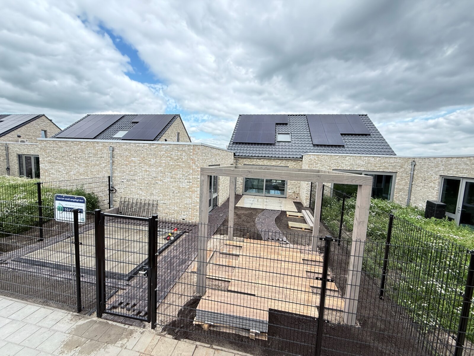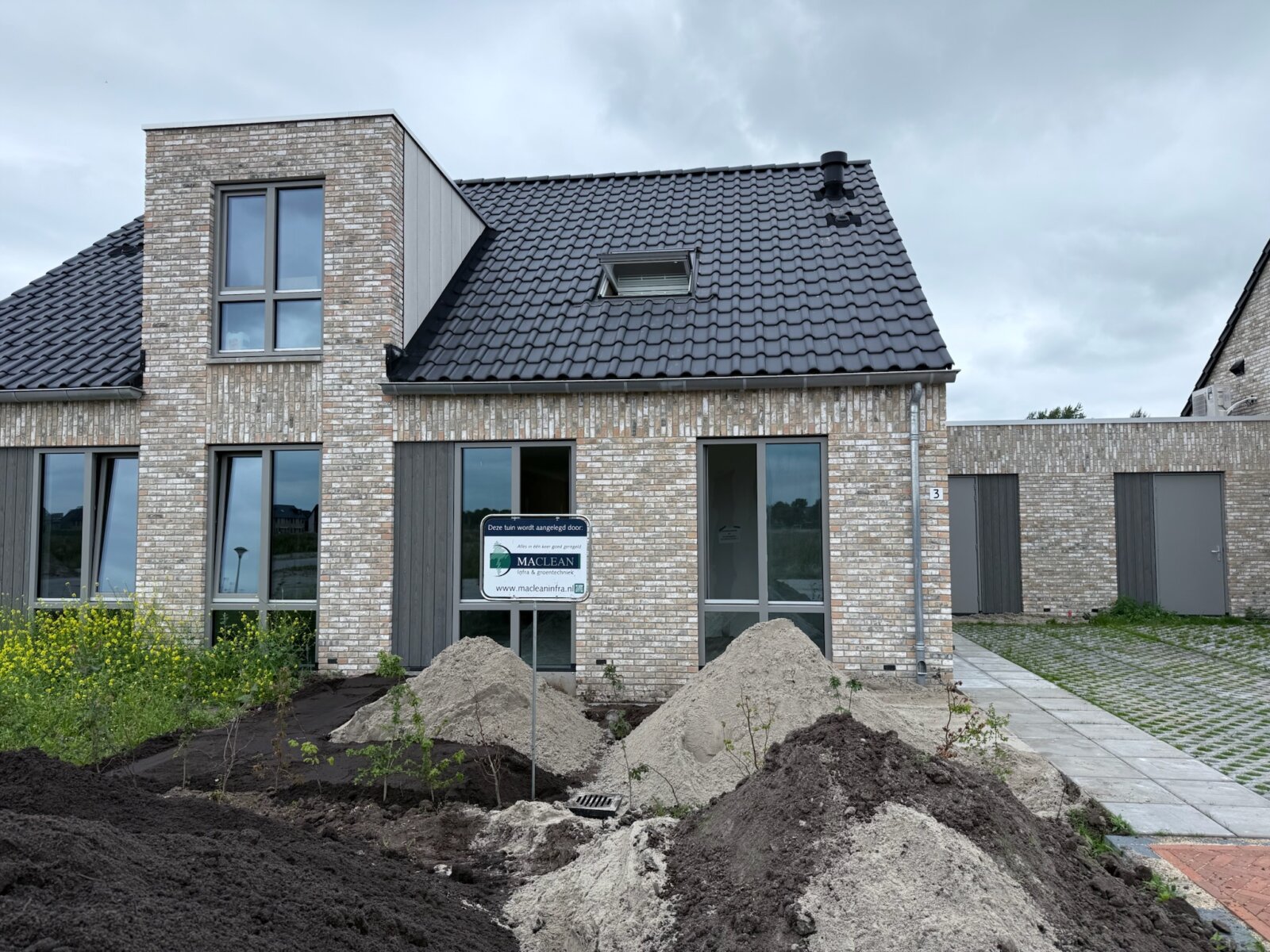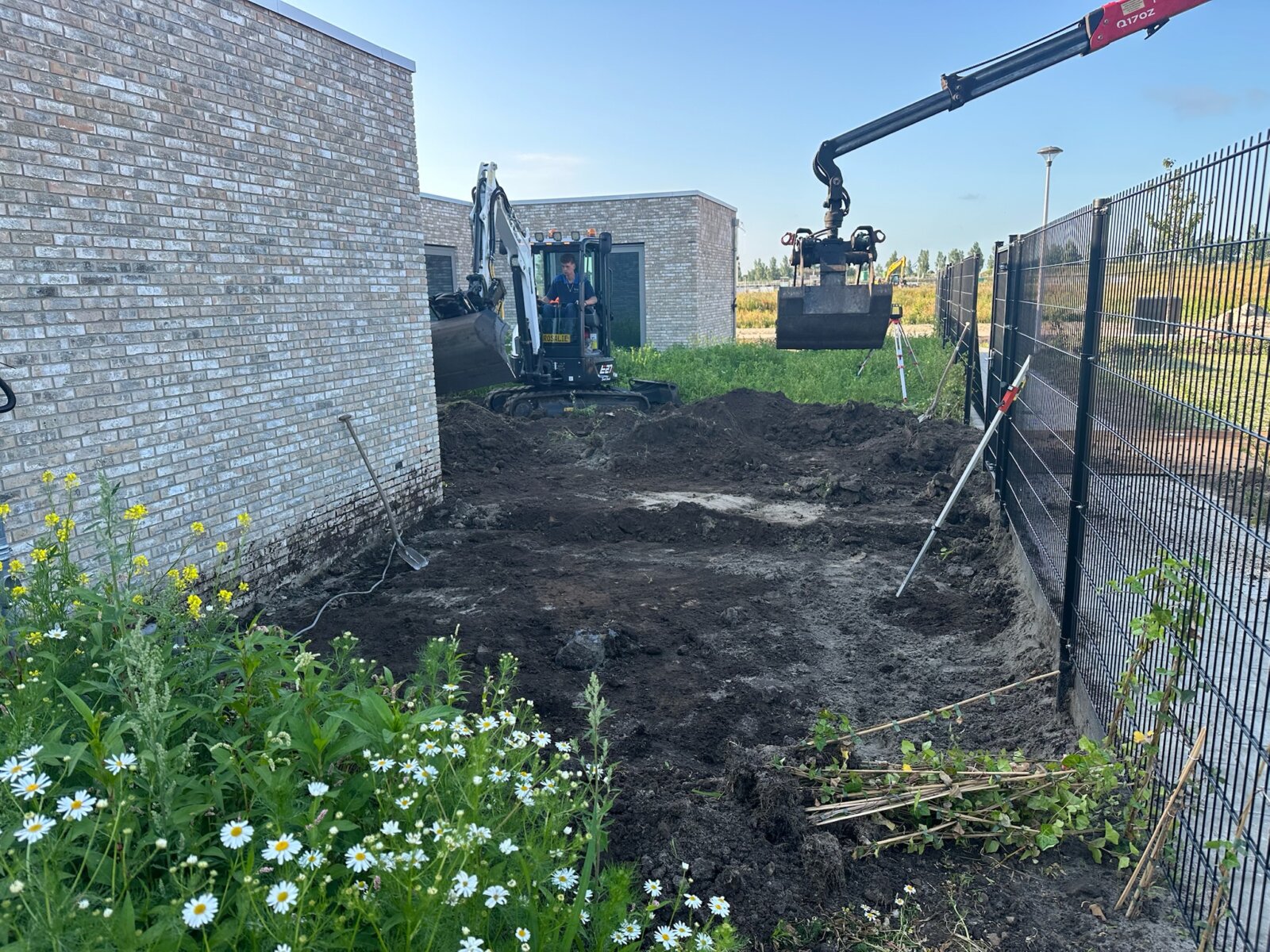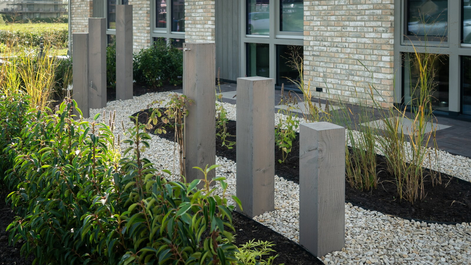 In de achtertuin staat inmiddels een pergola van Douglas palen 15×15 cm, behandeld met Douglasolie Dim Grey. Dit geeft de tuin een stoere, natuurlijke uitstraling. Het beplantingsplan bestaat uit kleurrijke en groene beplanting die voor schaduw en een levendige tuinbeleving zorgen. Het grasveld is alvast aangelegd met graszoden, zodat de tuin direct een frisse basis heeft.