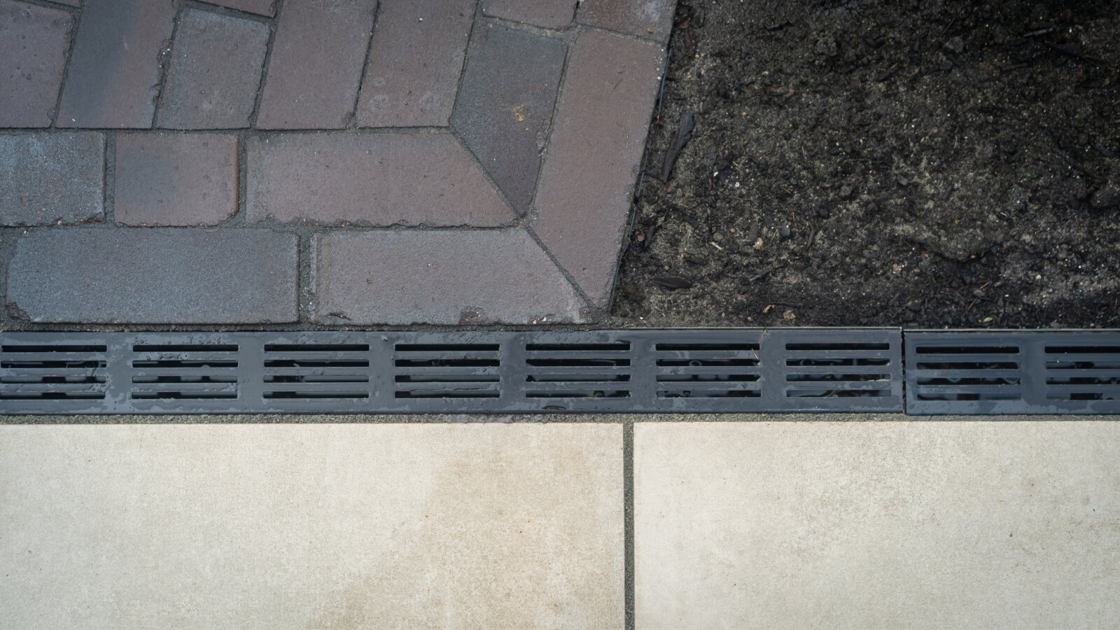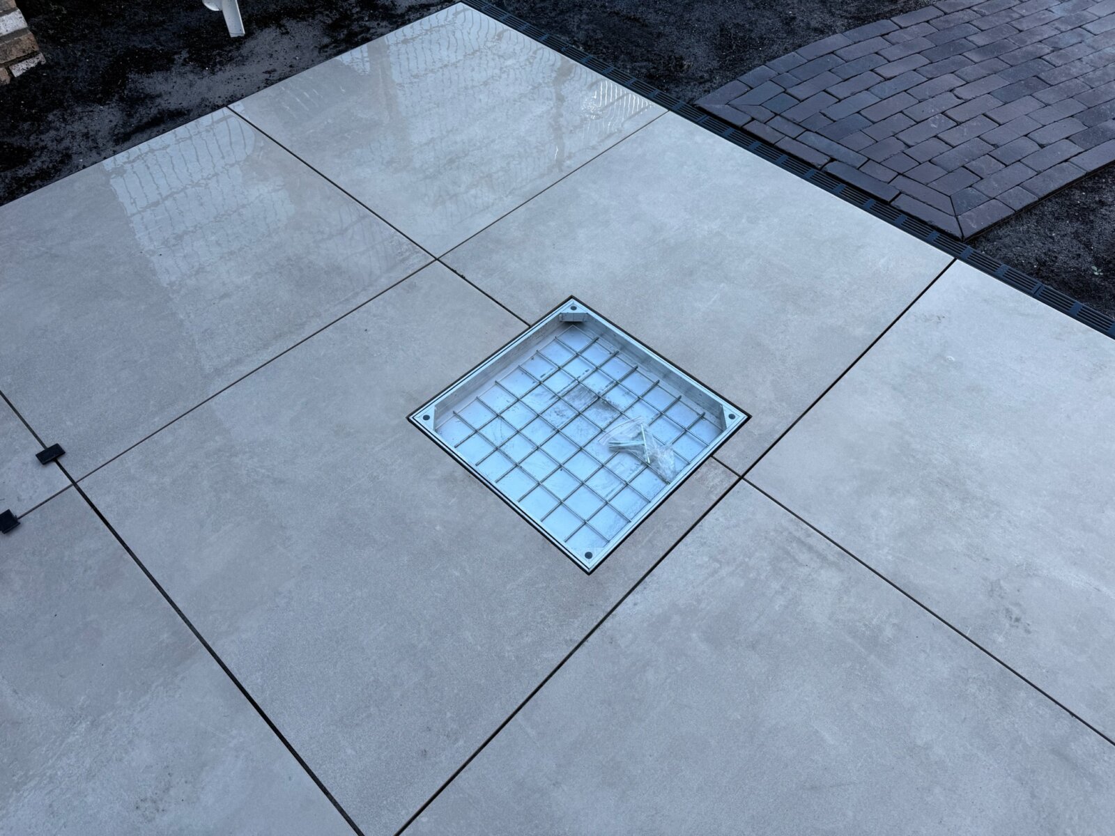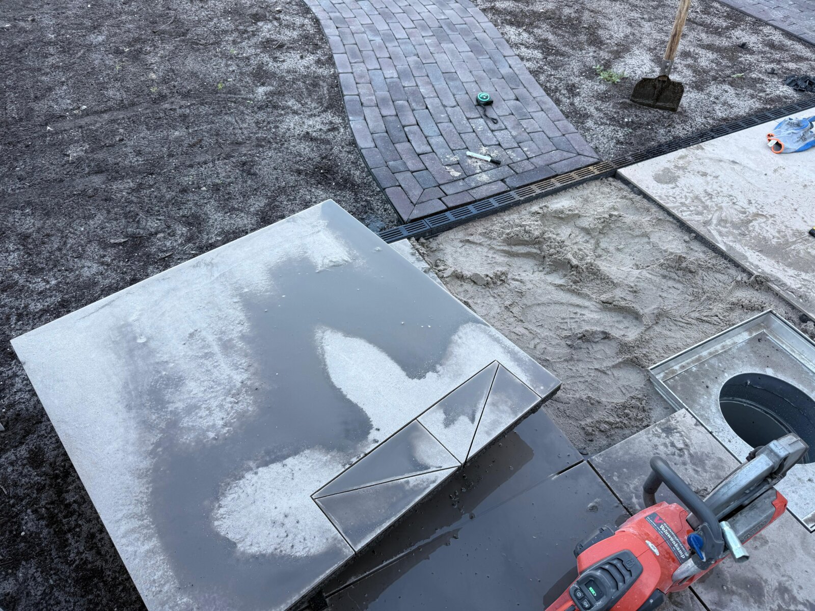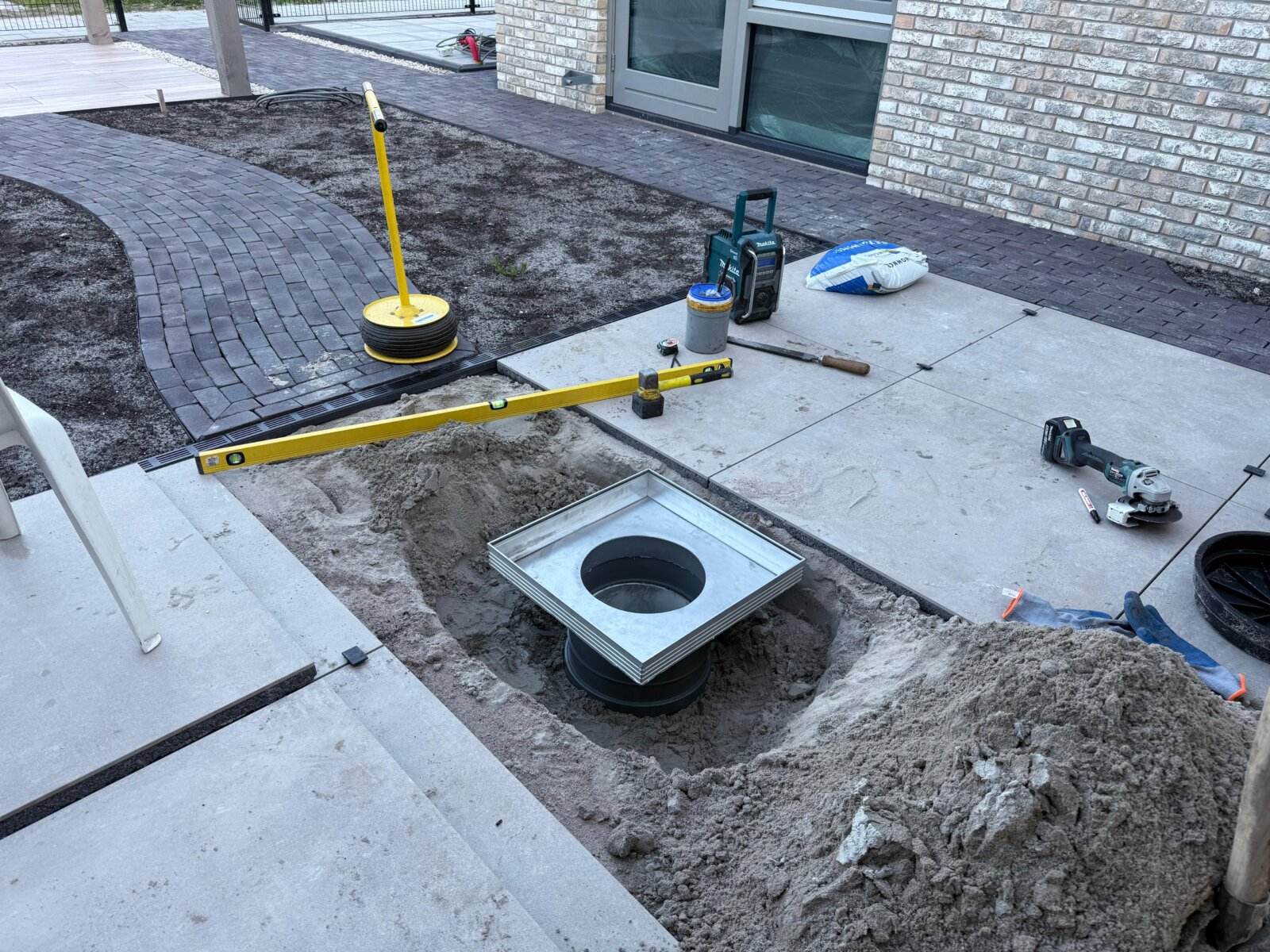 Langs de paden en in de borders plaatsen we In-Lite verlichting, aangestuurd door de Smart Hub-150. In de achtertuin worden de bomen uitgelicht met In-Lite SMART spots, die instelbaar zijn in warm-wit en kleur. Dit zorgt straks voor een sfeervolle uitstraling in de avonduren. Voor de afwatering kozen we een ACO Slimline aluminium lijnafwatering en een rvs-putje onder de buitenkraan. In het terras werken we de zandvangput af met een aluminium tegeldeksel waarin dezelfde keramische tegel is verwerkt. Met dit lopende project in Zwolle laten we zien hoe wij complete tuinen realiseren die design, duurzaamheid en comfort combineren. Binnenkort volgt de afronding met de beplanting en de laatste details!