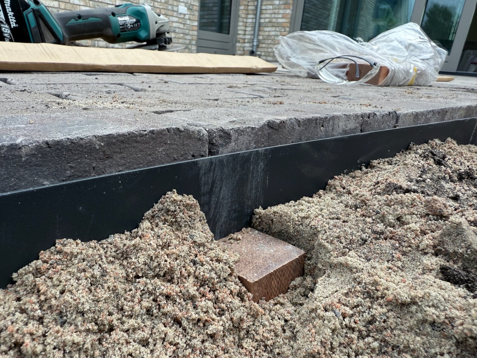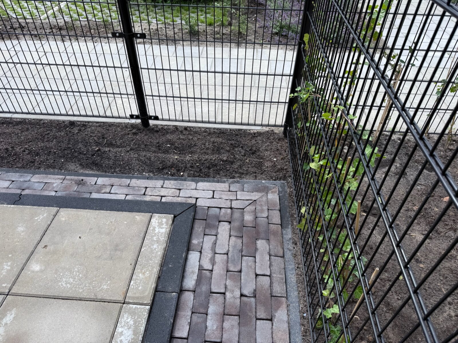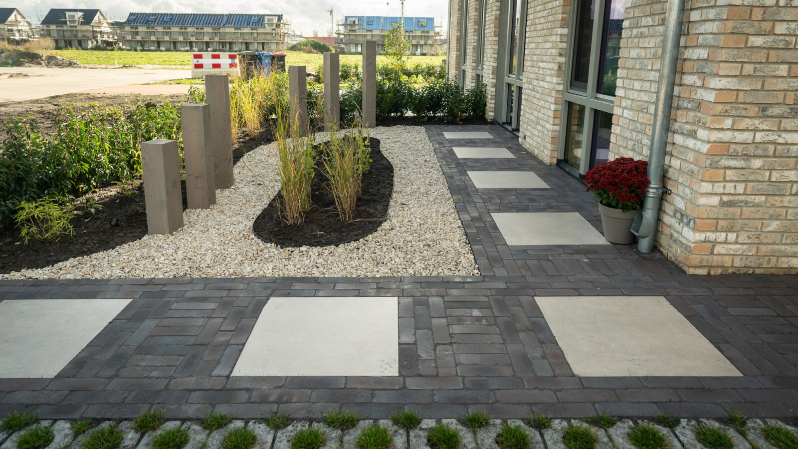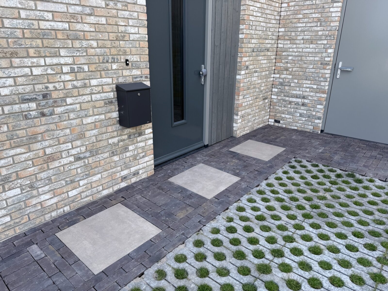 In het terras verwerken we keramische tegels GeoCeramica® Patch-Plus Beige 90x90x4 cm in combinatie met houtlook tegels Mensola-Larix 120x30x4 cm. Deze tegels zijn verbonden met een water doorvoerende Stabikorn-laag en afgewerkt met Gator Nitro X voegmortel. Voor de paden leggen we een gebakken waalformaat van Van der Sanden, type Lugano Antica Blauw-zwart, ingevoegd met Gator Nitro X Ivoor. Het voegmateriaal voorkomt de groei van onkruid, zorgt voor een nette afwerking en maakt de tuin onderhoudsvriendelijk. Daarnaast brengen we grindvakken aan met Castle grind 8-16 mm op een grindplaat met doek. Voor praktisch gebruik plaatsen we in het terras een RVS deurvasthouder, zodat de deur op mooie dagen open kan blijven staan.