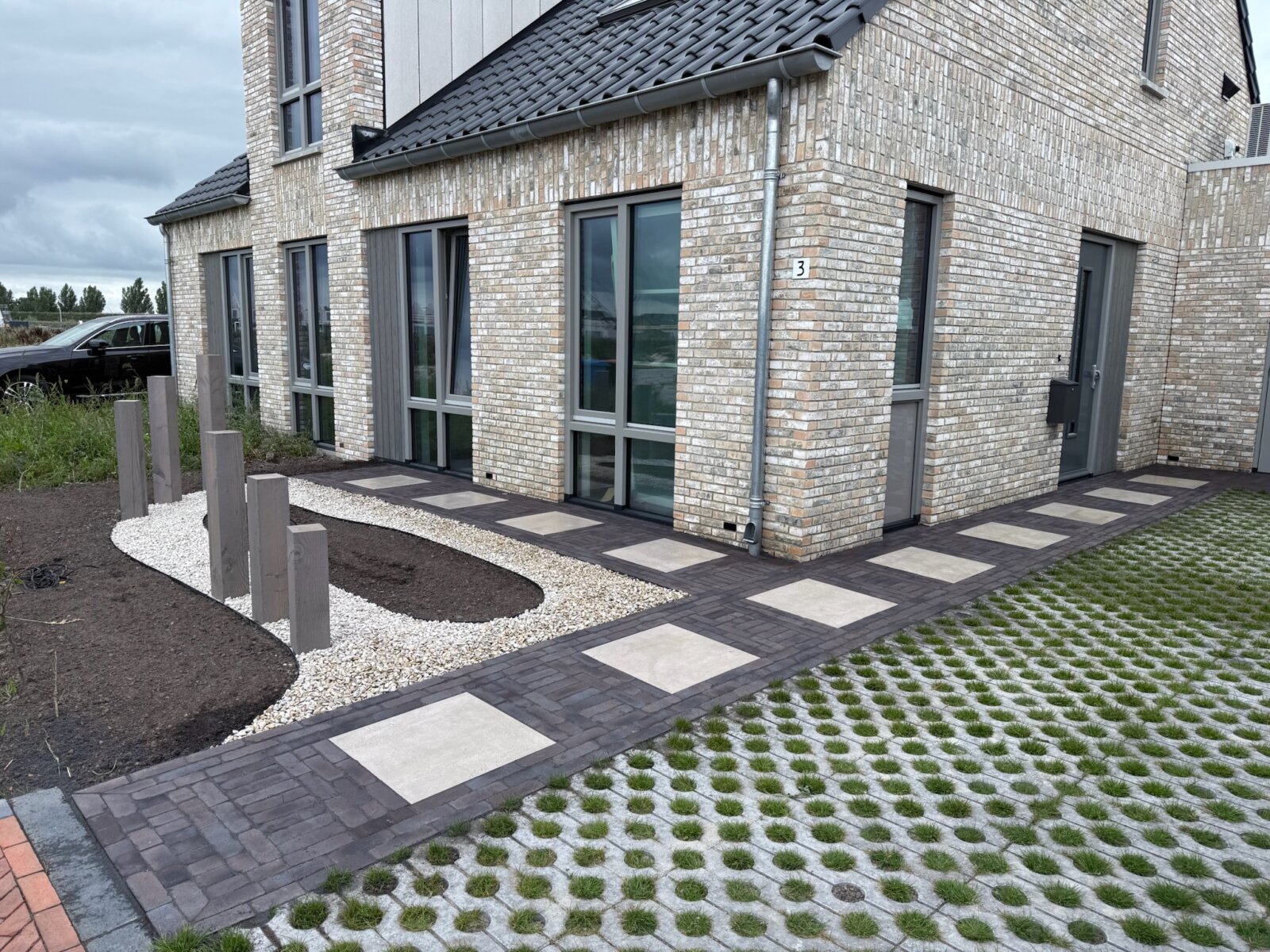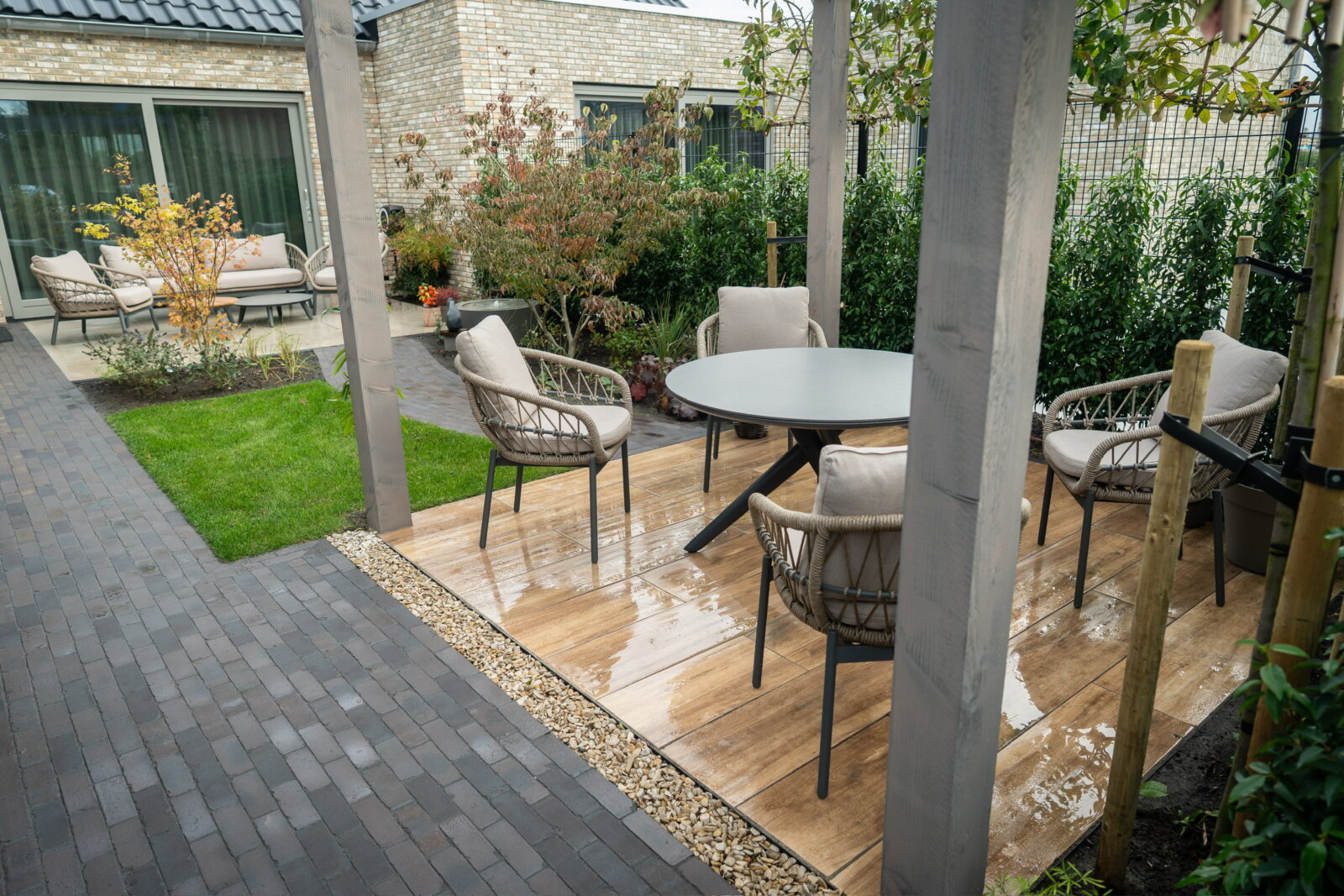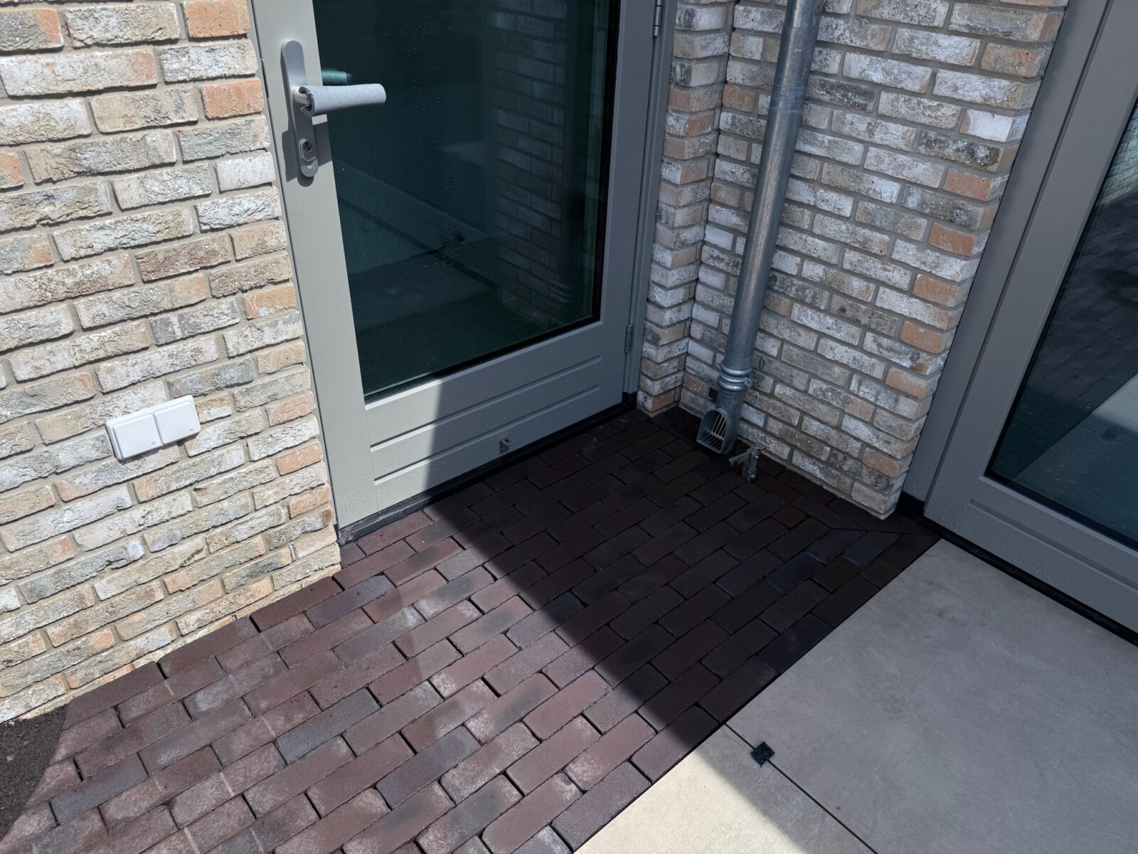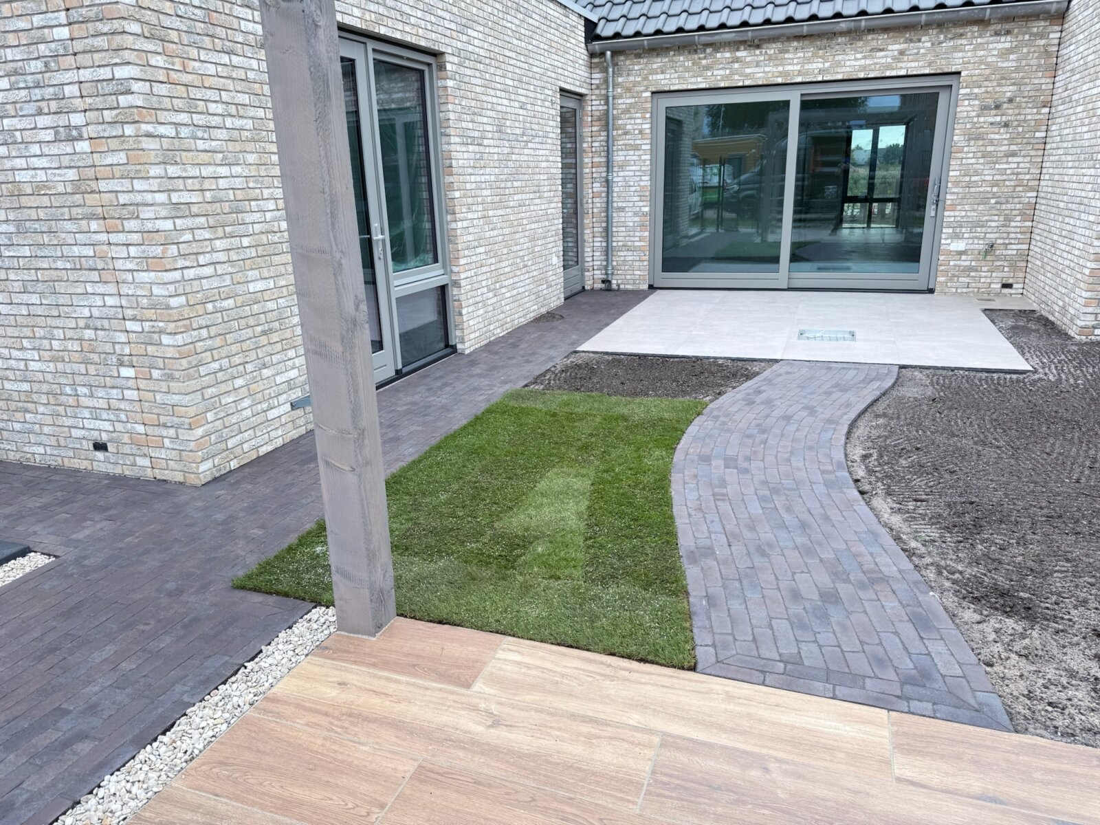 In het terras verwerken we keramische tegels GeoCeramica® Patch-Plus Beige 90x90x4 cm in combinatie met houtlook tegels Mensola-Larix 120x30x4 cm. Deze tegels zijn verbonden met een water doorvoerende Stabikorn-laag en afgewerkt met Gator Nitro X voegmortel. Voor de paden leggen we een gebakken waalformaat van Van der Sanden, type Lugano Antica Blauw-zwart, ingevoegd met Gator Nitro X Ivoor. Het voegmateriaal voorkomt de groei van onkruid, zorgt voor een nette afwerking en maakt de tuin onderhoudsvriendelijk. Daarnaast brengen we grindvakken aan met Castle grind 8-16 mm op een grindplaat met doek. Voor praktisch gebruik plaatsen we in het terras een RVS deurvasthouder, zodat de deur op mooie dagen open kan blijven staan.