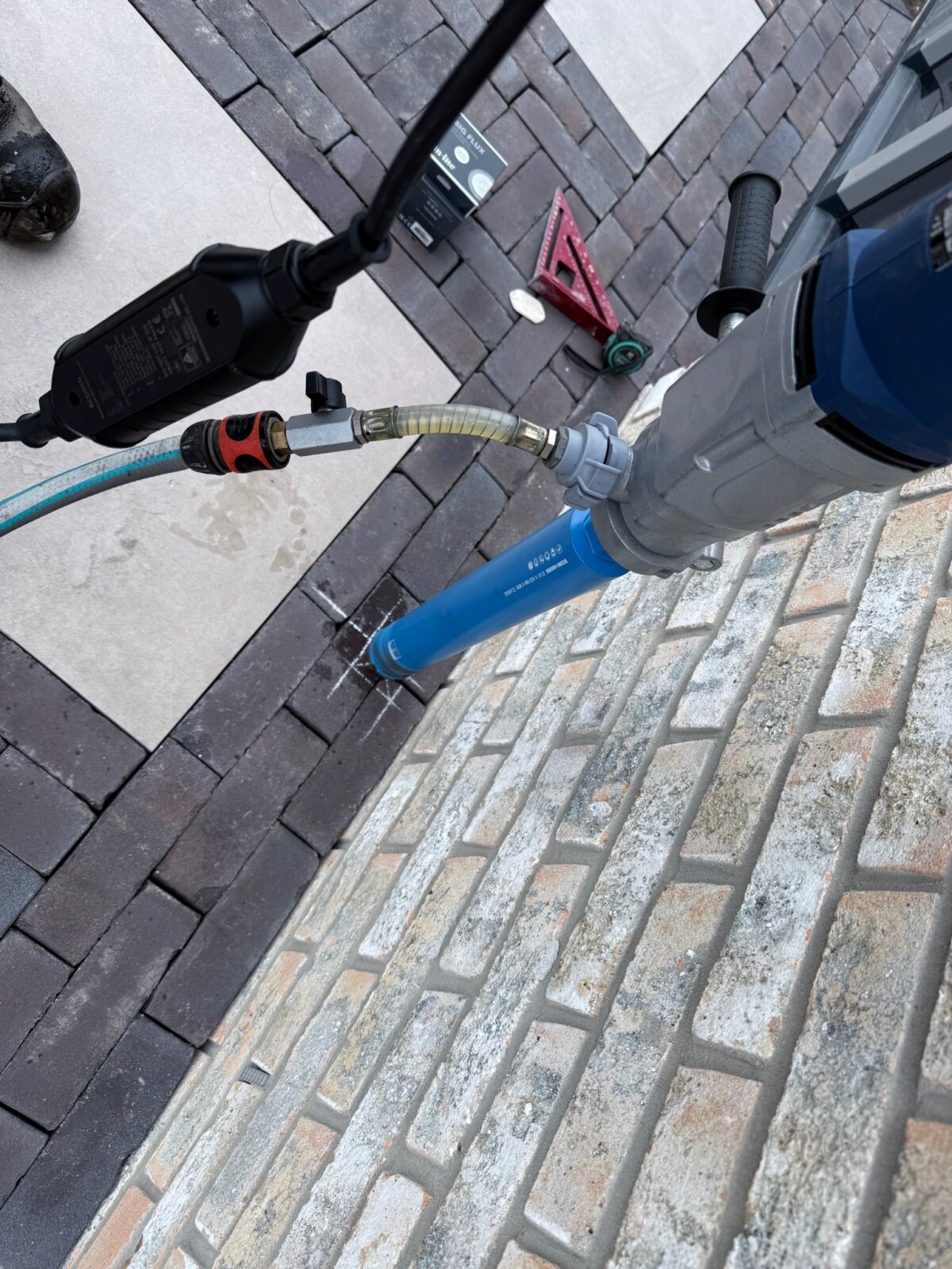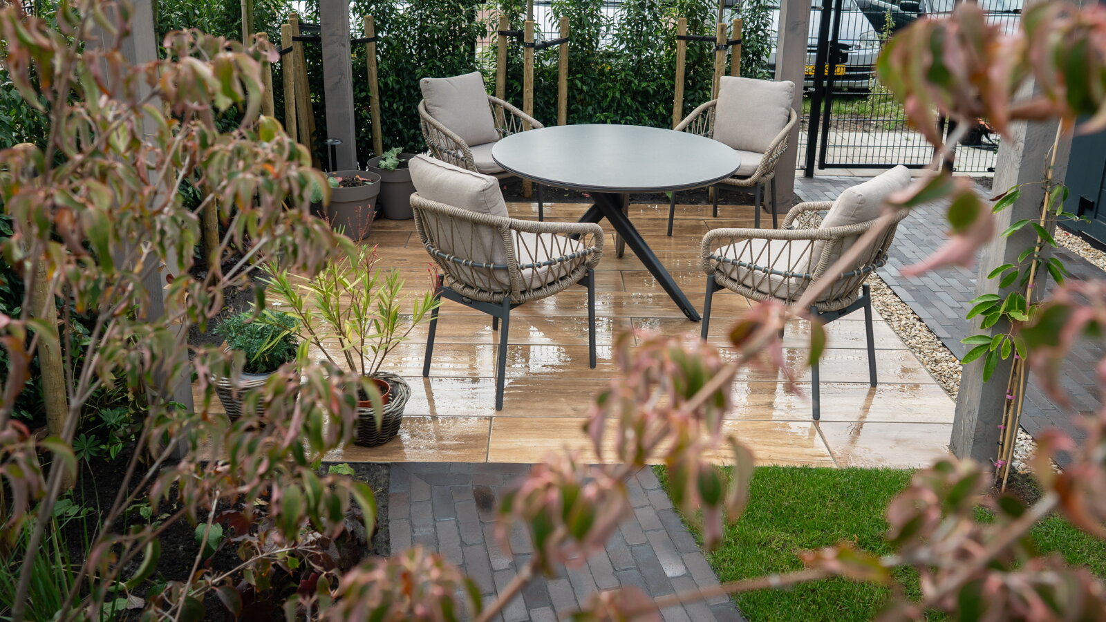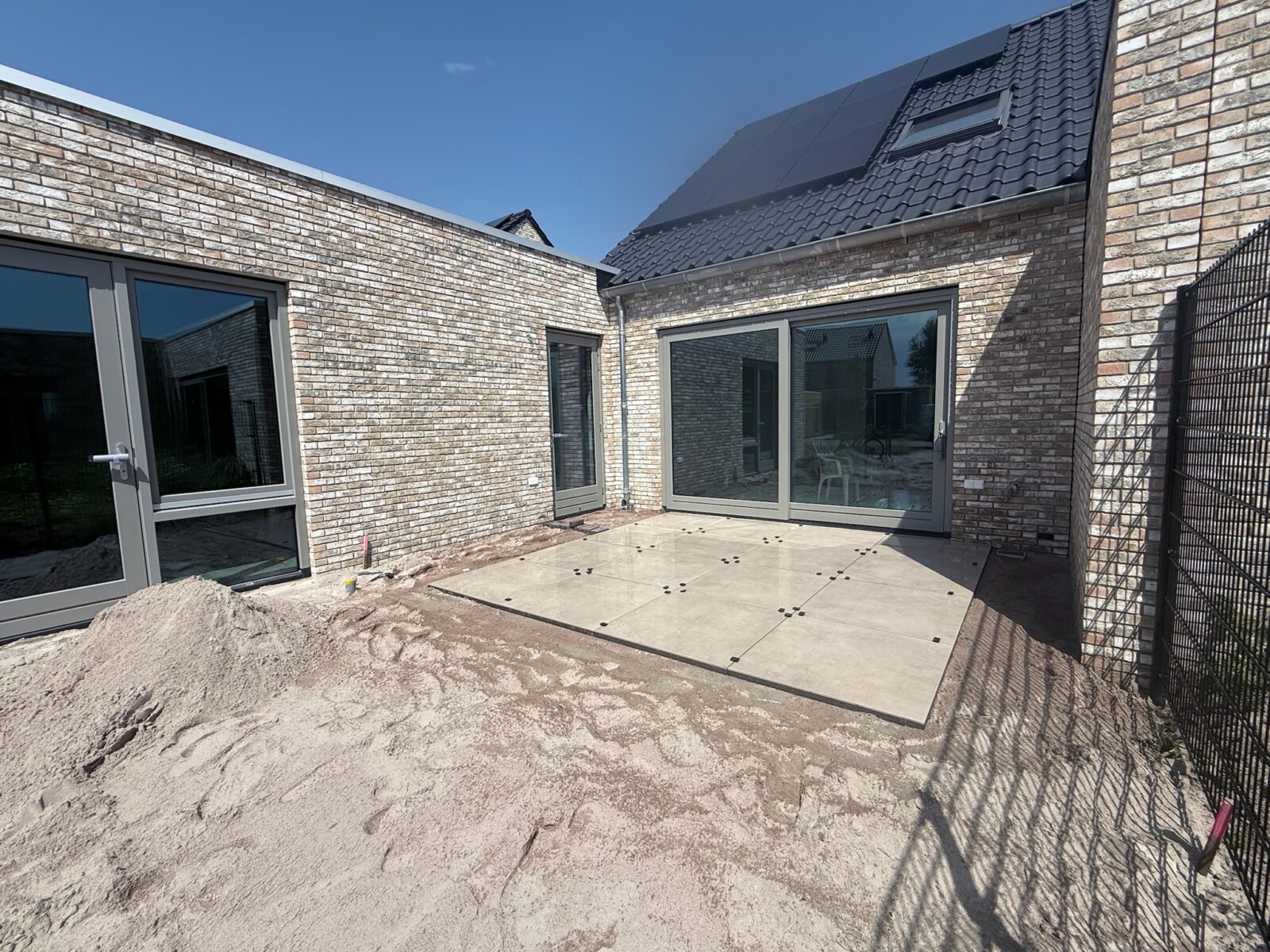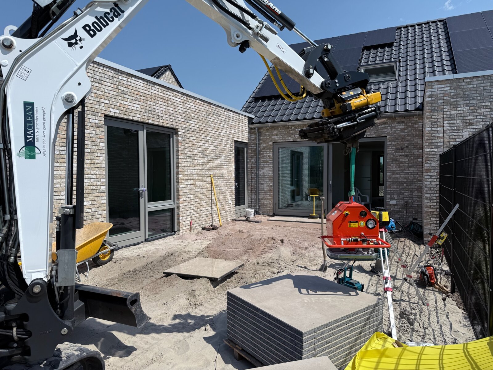 In het terras verwerken we keramische tegels GeoCeramica® Patch-Plus Beige 90x90x4 cm in combinatie met houtlook tegels Mensola-Larix 120x30x4 cm. Deze tegels zijn verbonden met een water doorvoerende Stabikorn-laag en afgewerkt met Gator Nitro X voegmortel. Voor de paden leggen we een gebakken waalformaat van Van der Sanden, type Lugano Antica Blauw-zwart, ingevoegd met Gator Nitro X Ivoor. Het voegmateriaal voorkomt de groei van onkruid, zorgt voor een nette afwerking en maakt de tuin onderhoudsvriendelijk. Daarnaast brengen we grindvakken aan met Castle grind 8-16 mm op een grindplaat met doek. Voor praktisch gebruik plaatsen we in het terras een RVS deurvasthouder, zodat de deur op mooie dagen open kan blijven staan.