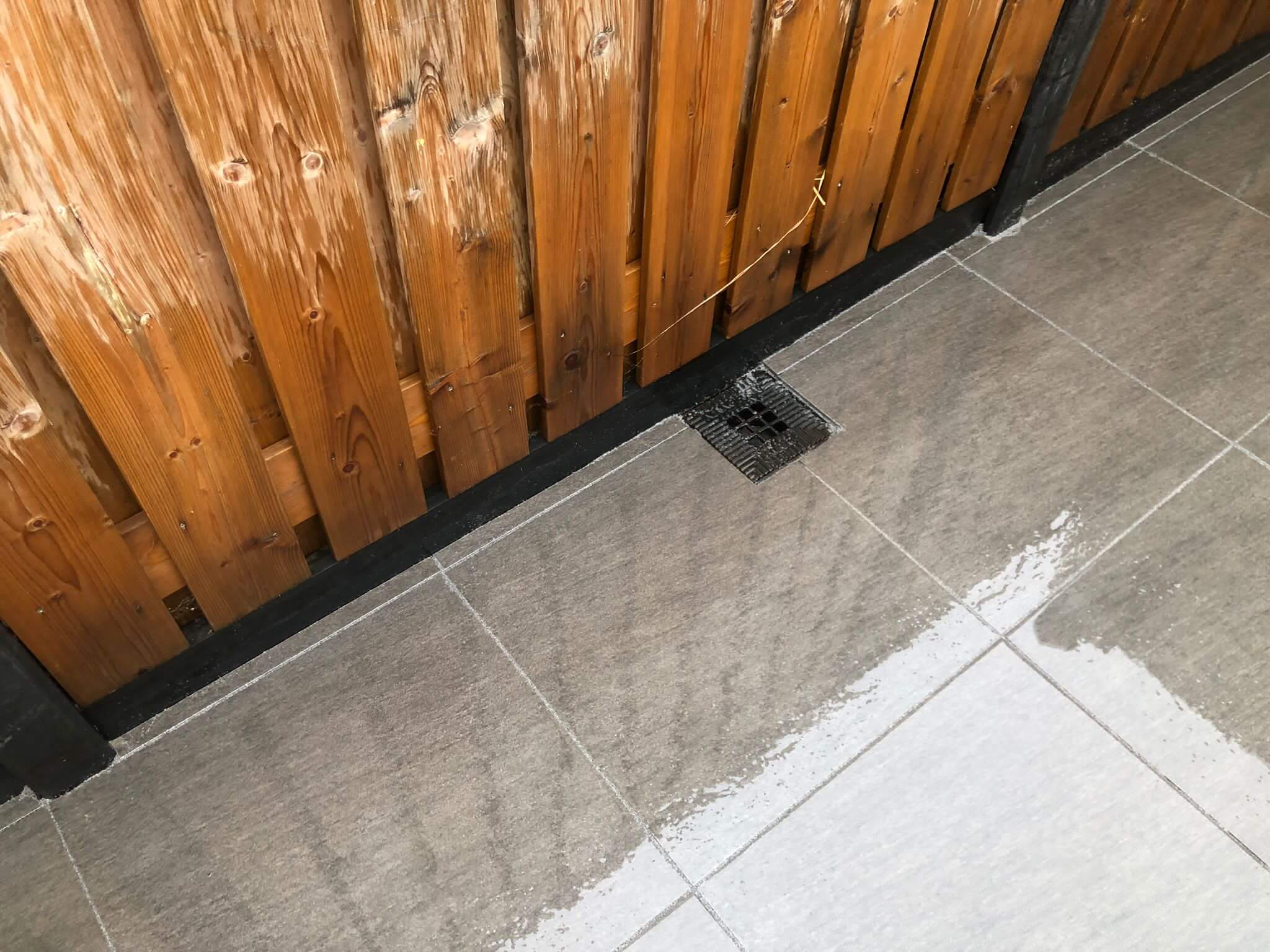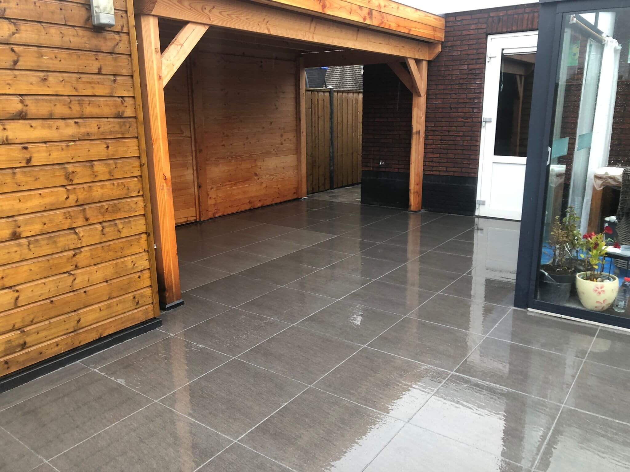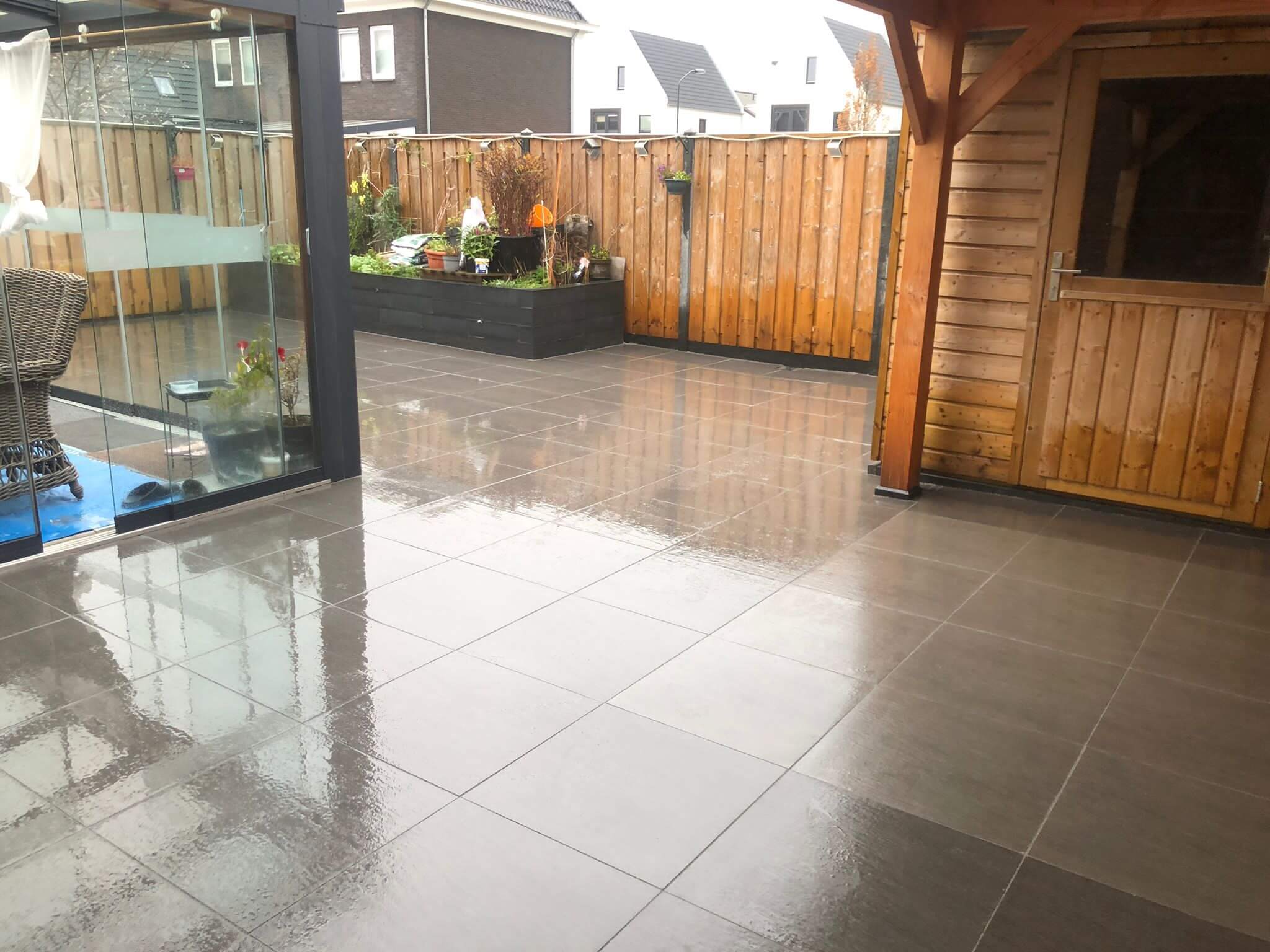 Het keramisch terras is opnieuw herstraat ivm een waterprobleem. Wij hebben riolering aangelegd en een afvoerputje geplaatst, regenwater afvoer aangesloten van het schuurtje en het terras opnieuw aangebracht. De tegels zijn van de fabrikant RedSun CERASUN ARDESIA NERO 60x60x4cm. De voegen zijn van Varistone LM Aqua drainerende waterdoorlatende voegmortel steengrijs. Hierdoor heb je nauwelijks last meer van onkruid! En dat scheelt je een stuk in het onderhoud van je tuin.