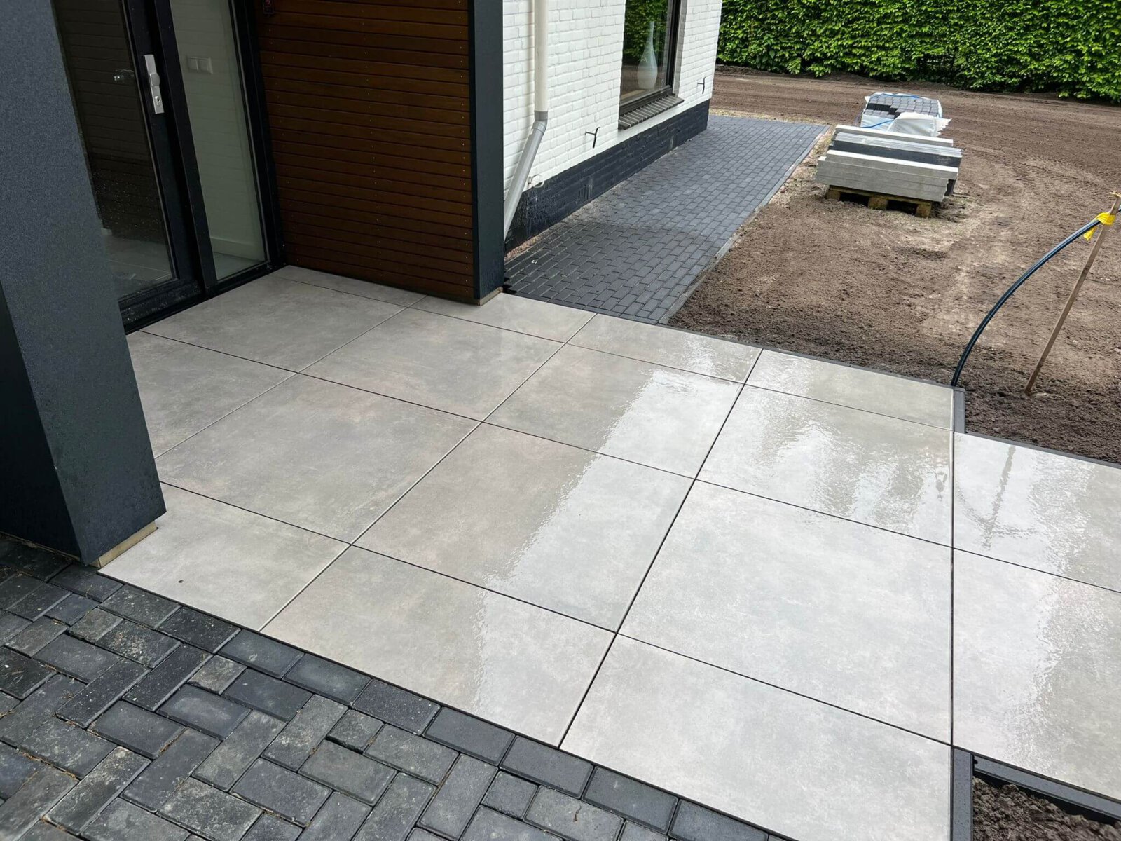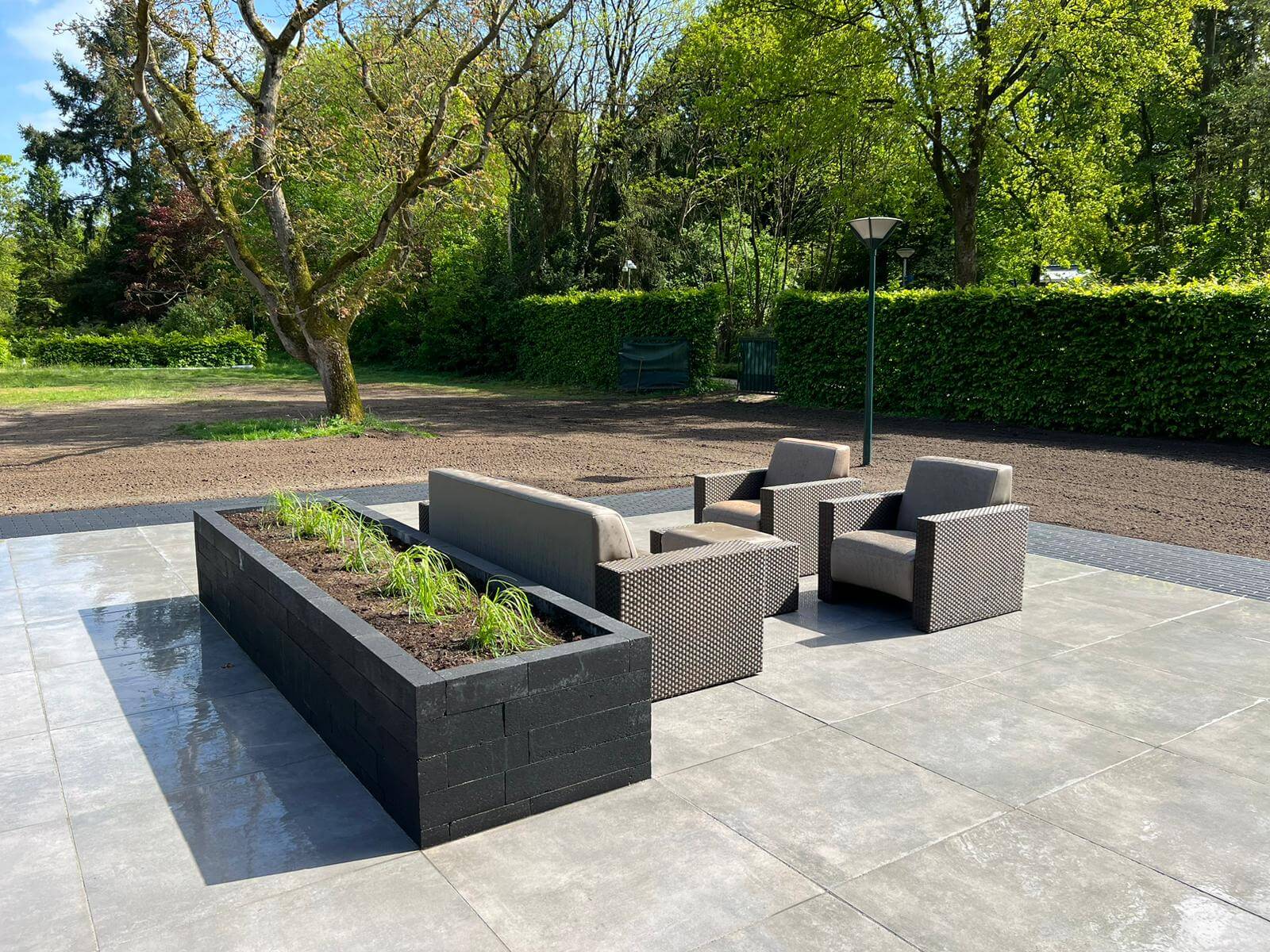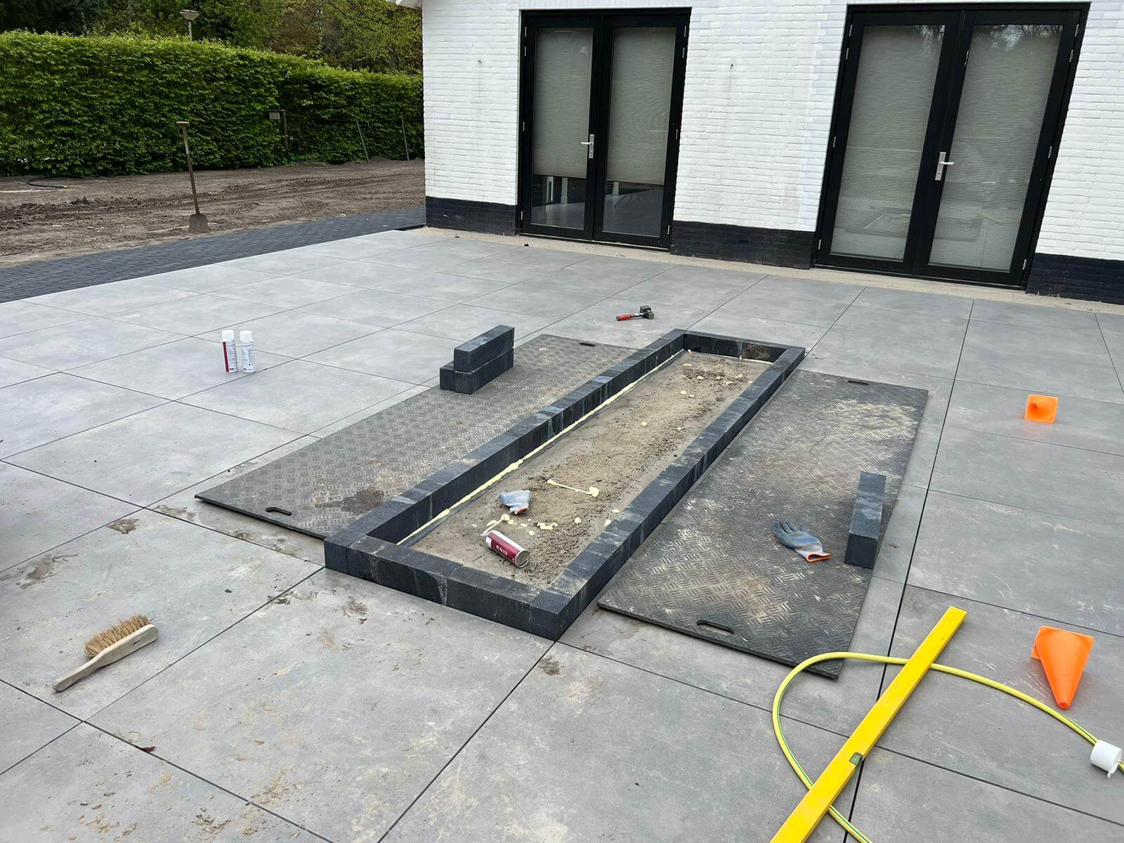 Het grondwerk hebben we met klein materieel uitgevoerd. 35cm grond ontgraven en zand aangebracht. In het terras hebben we keramische tegels MBI GeoCeramica® 90x90x4cm Patch-Plus Grey gecombineerd in de paden met een dikformaat antraciet van Kijlstra. De verhoogde borderbak is opgetrokken met Patioblokken van MBI Antraciet 60x12x10 cm.
