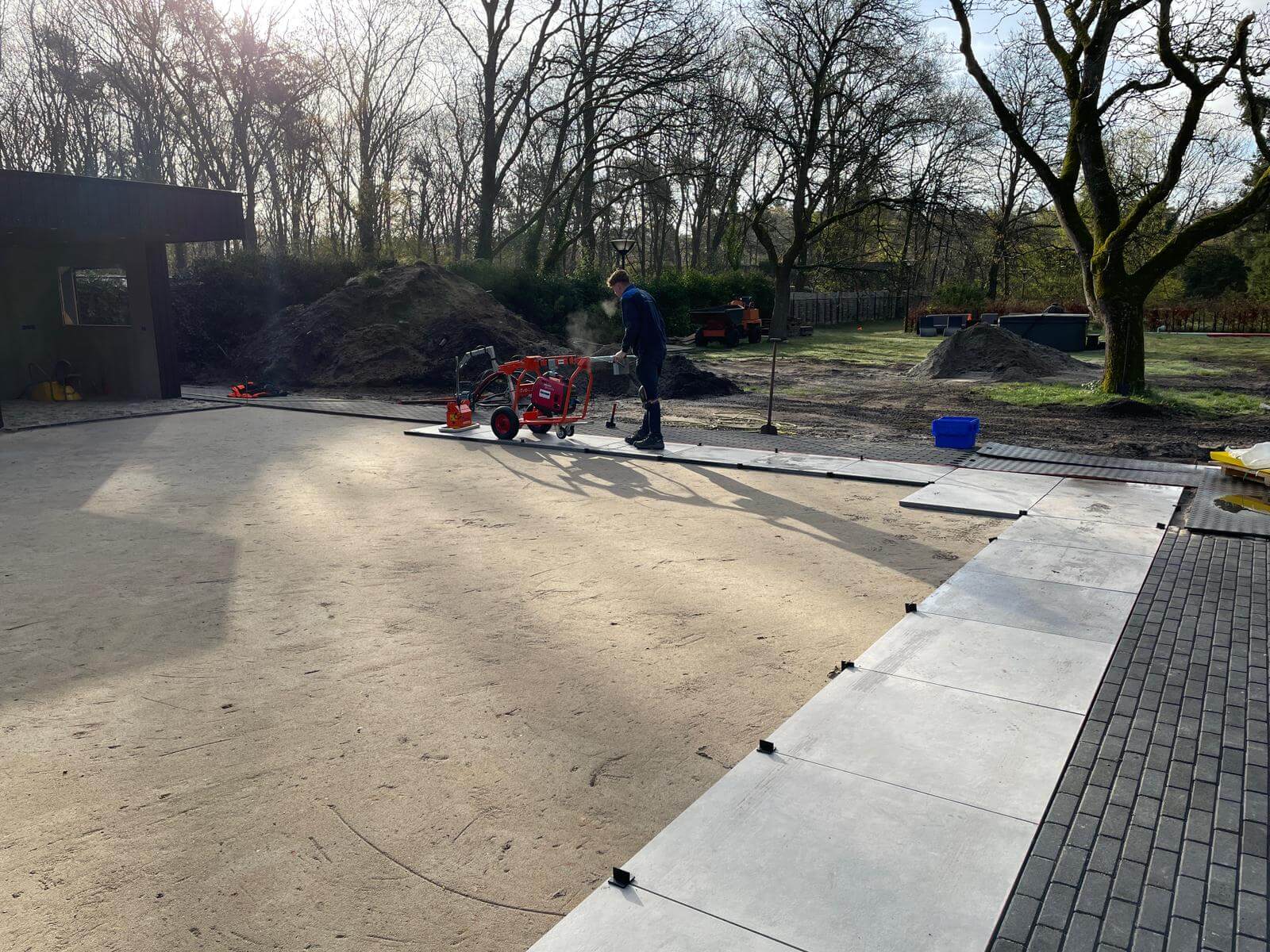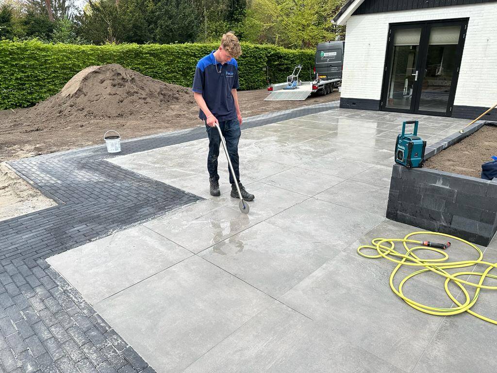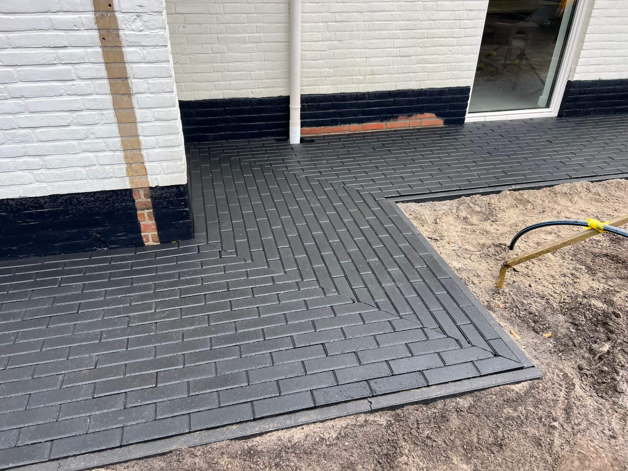 Het grondwerk hebben we met klein materieel uitgevoerd. 35cm grond ontgraven en zand aangebracht. In het terras hebben we keramische tegels MBI GeoCeramica® 90x90x4cm Patch-Plus Grey gecombineerd in de paden met een dikformaat antraciet van Kijlstra. De verhoogde borderbak is opgetrokken met Patioblokken van MBI Antraciet 60x12x10 cm.