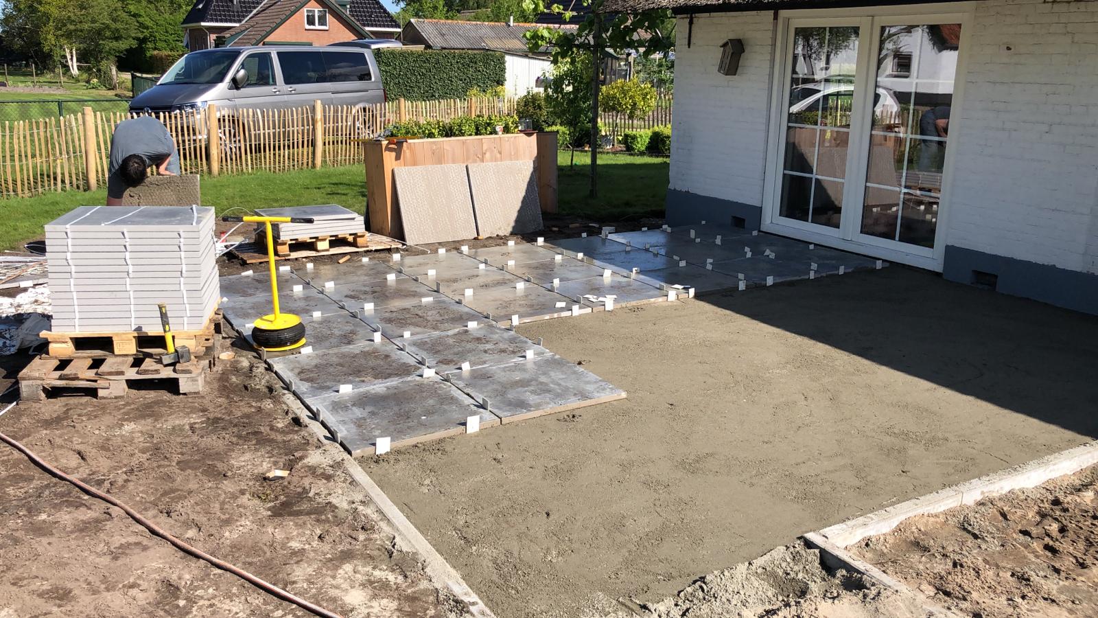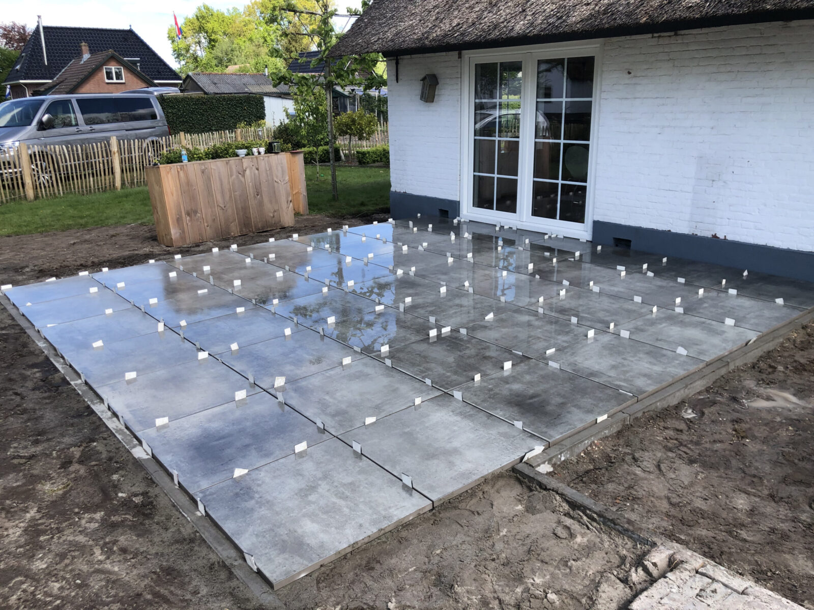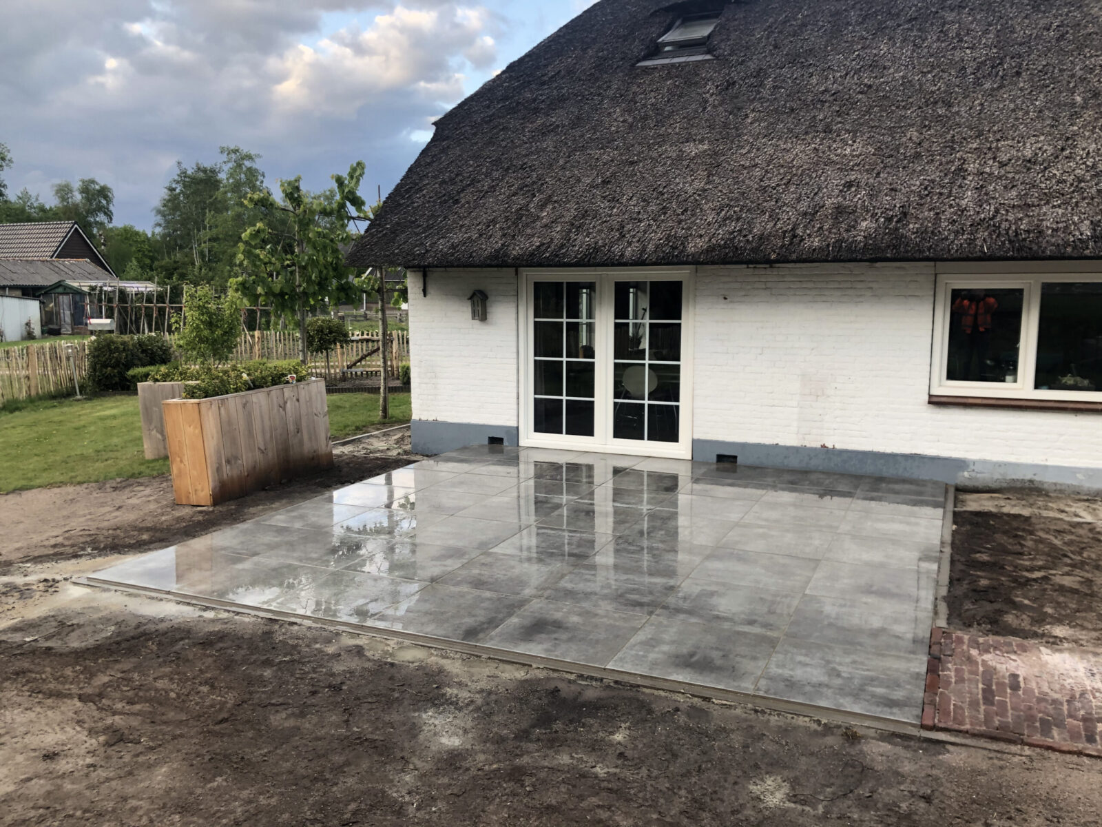 Keramische terras met oude waaltjes Oldebroek gelegd in beton en gebonden voeg.