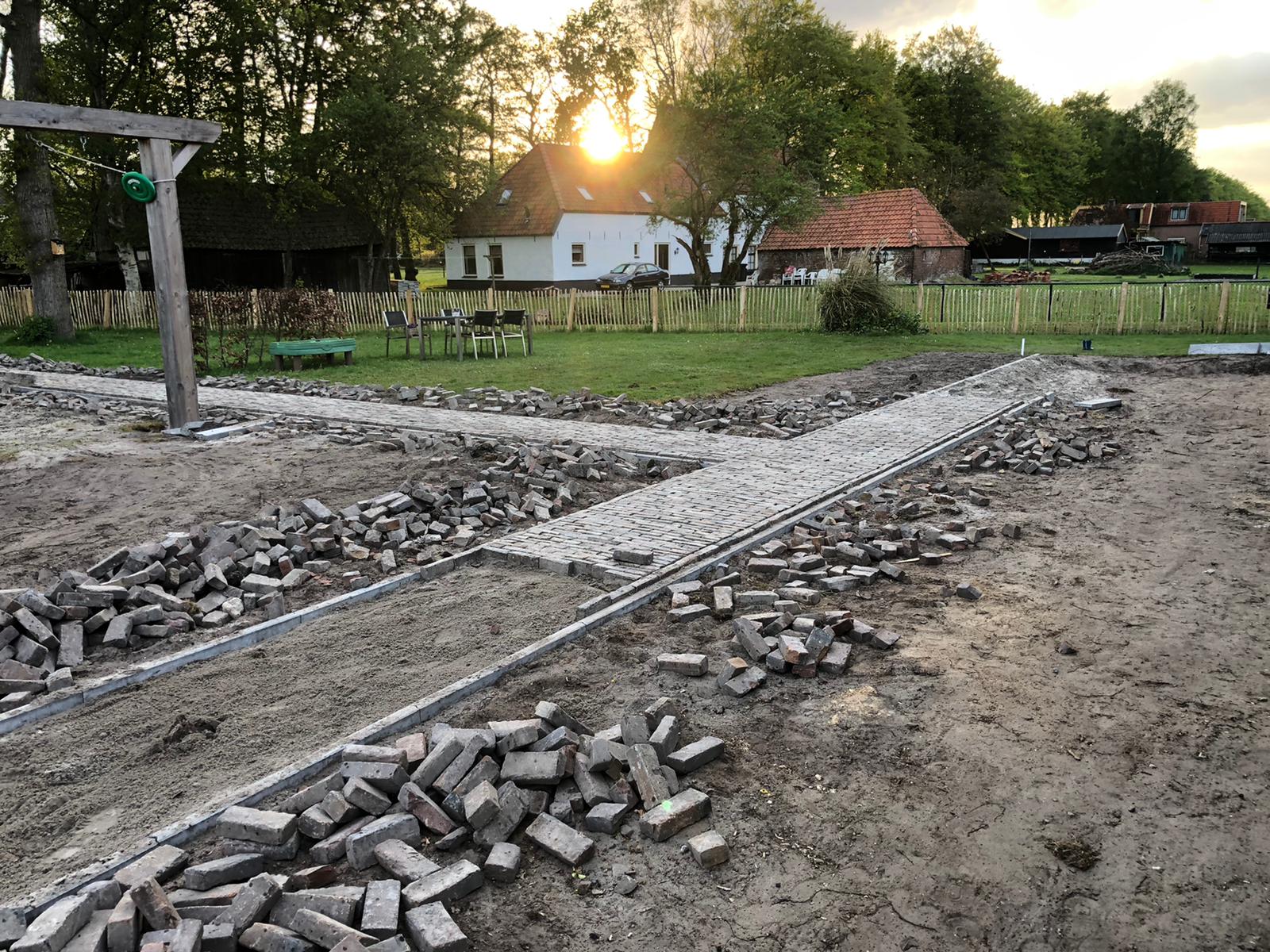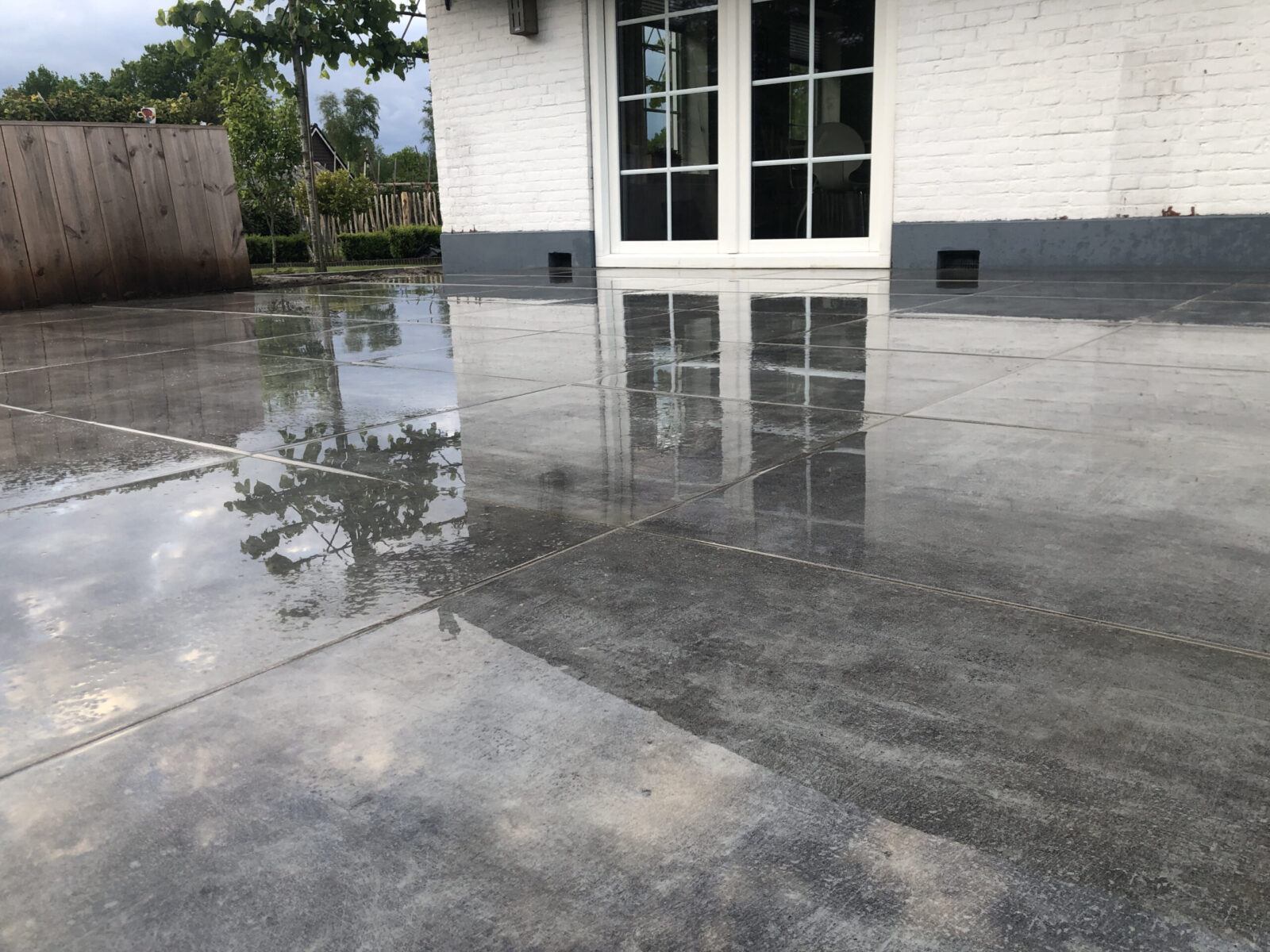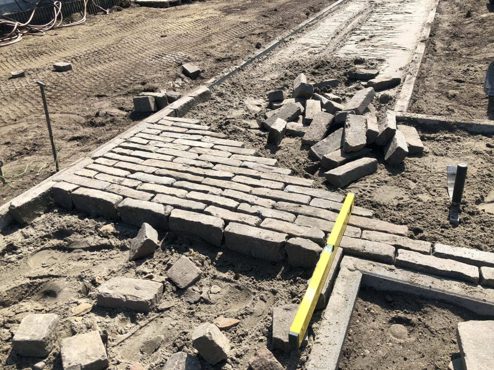 Keramische terras met oude waaltjes Oldebroek gelegd in beton en gebonden voeg.