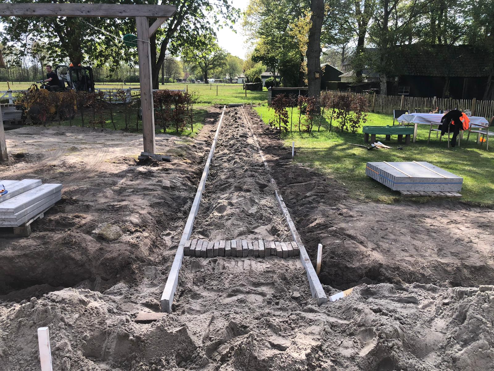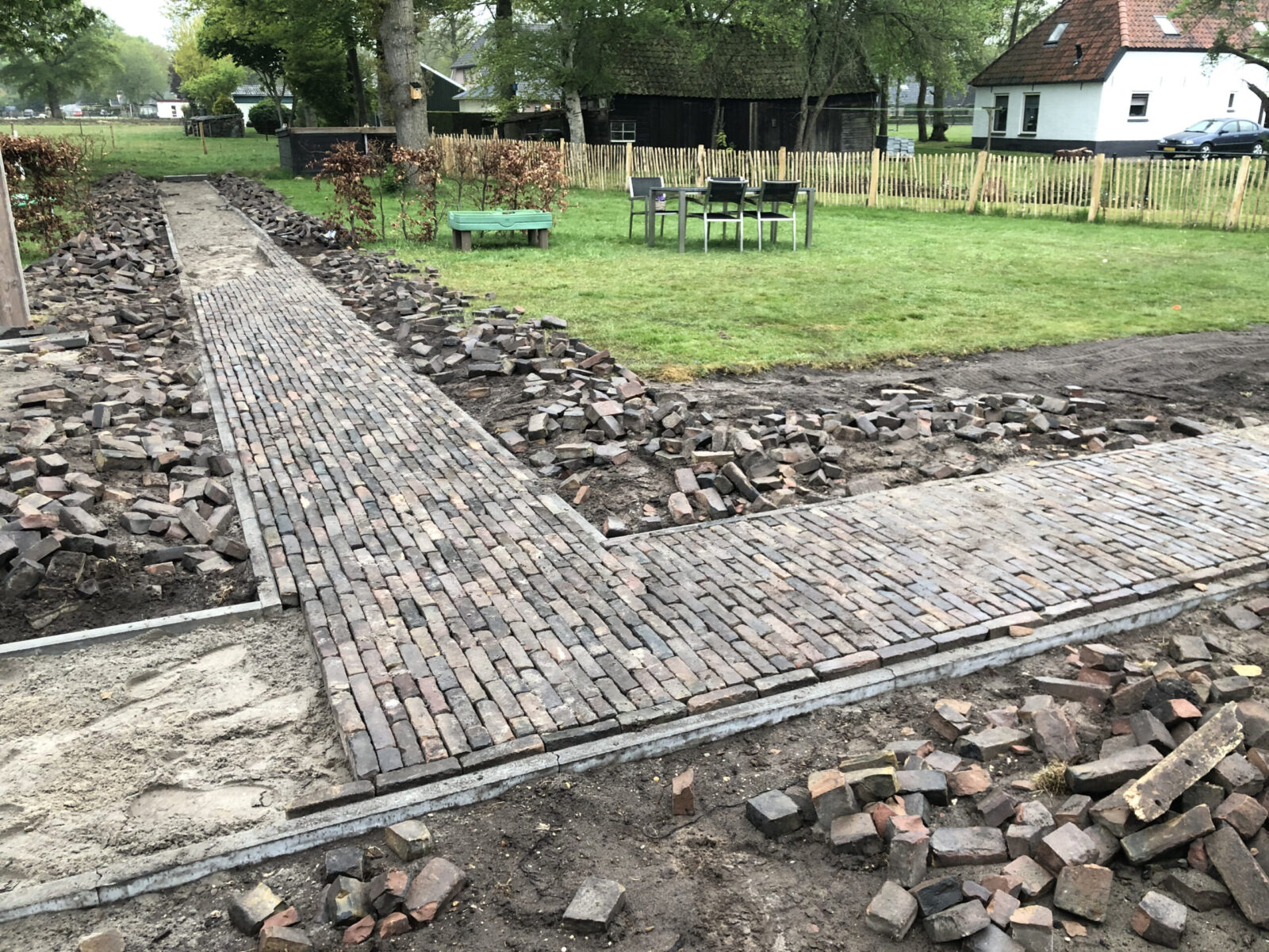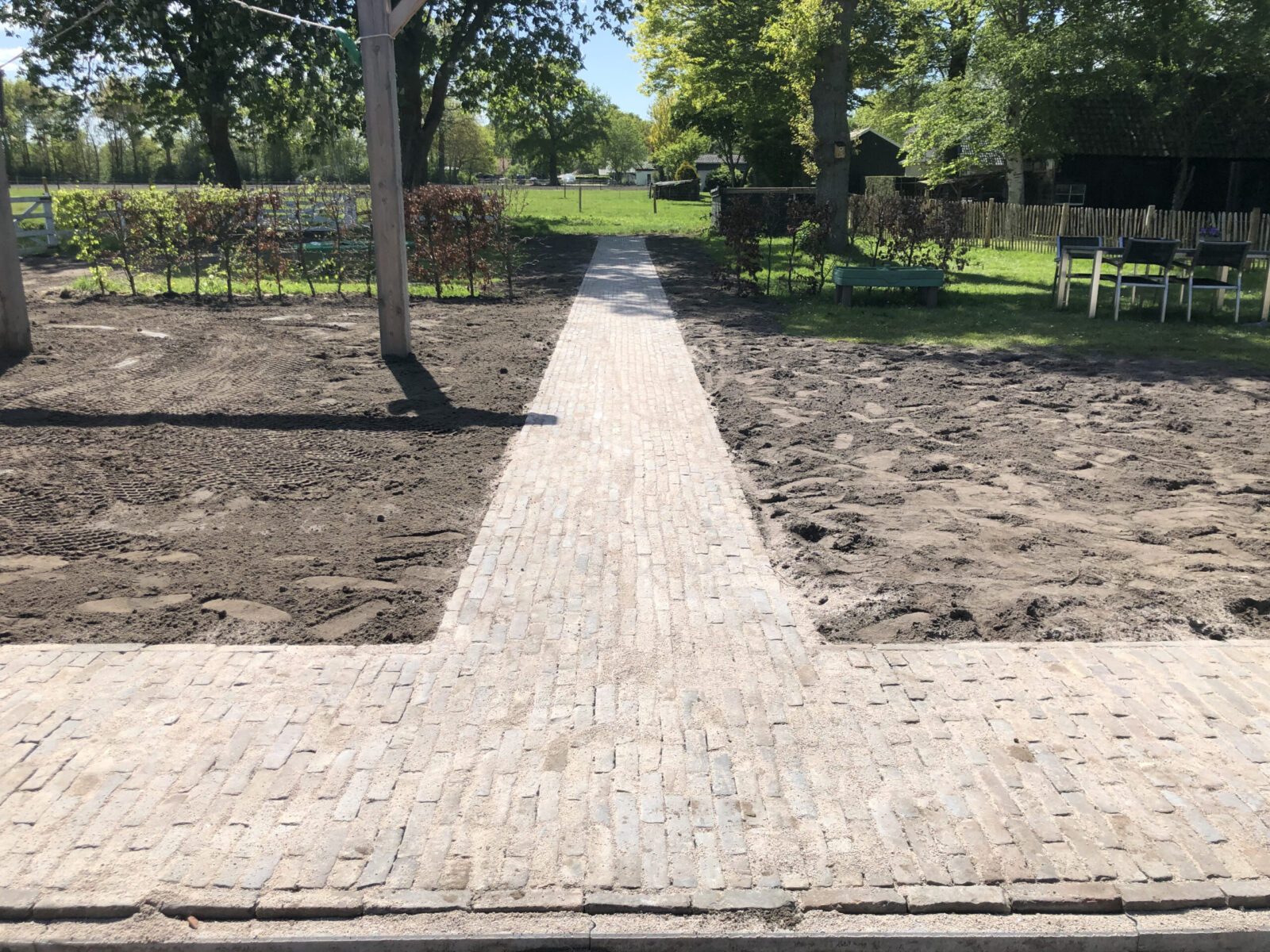 We hebben eerst het grondwerk uitgevoerd met klein materieel waarna we het terras hebben gelegd met nieuwe keramische tegels. De tegels zijn gelegd in 20cm beton en met een cement gebonden voeg De paden zijn aangelegd met oude gebakken Waaltjes. Daarna de graszoden aangebracht wat de tuin direct afmaakt.