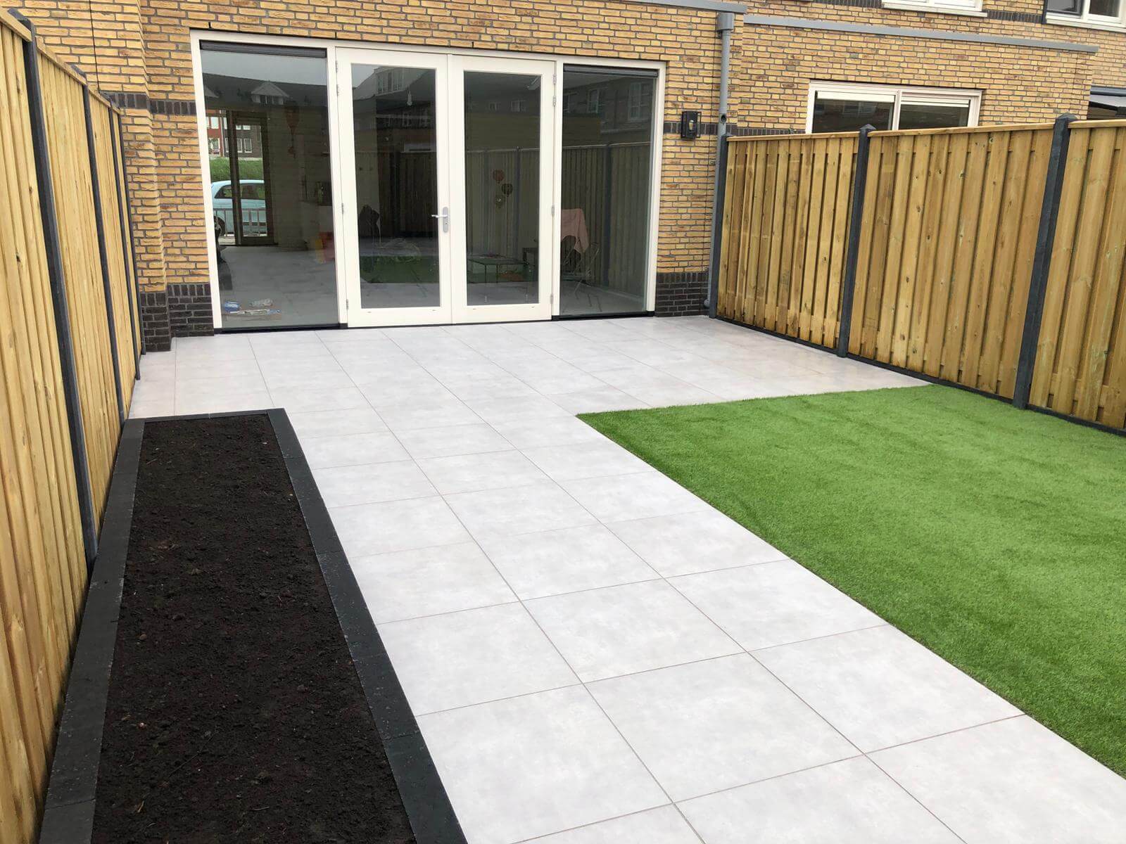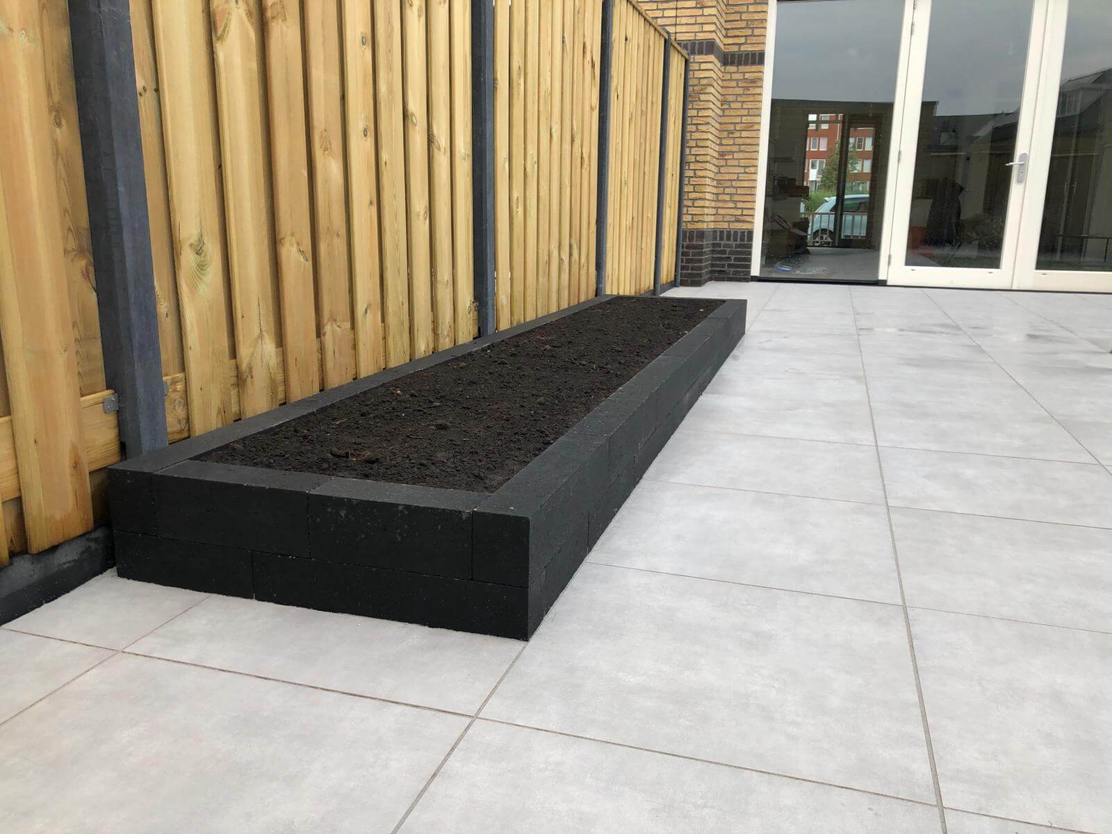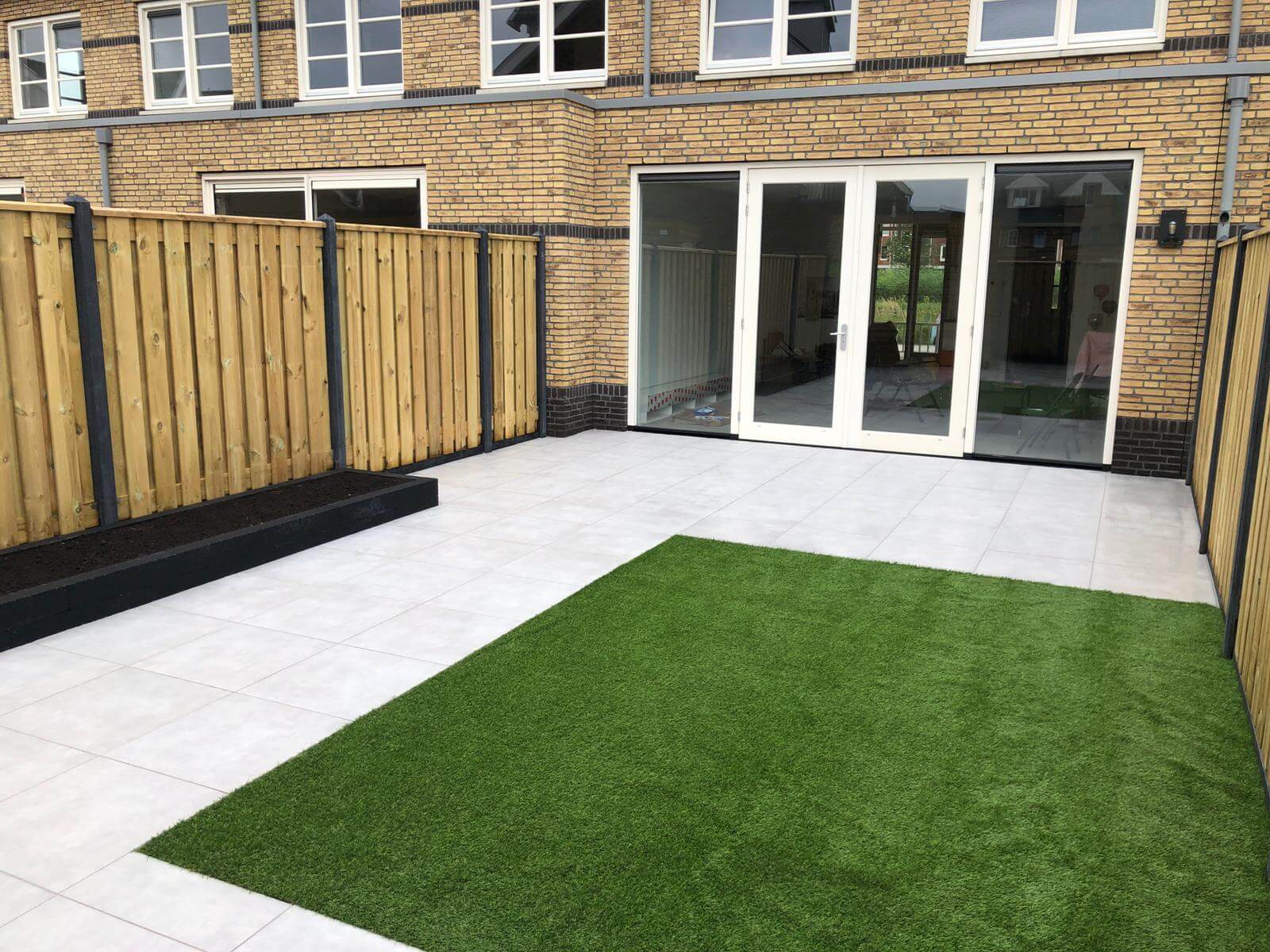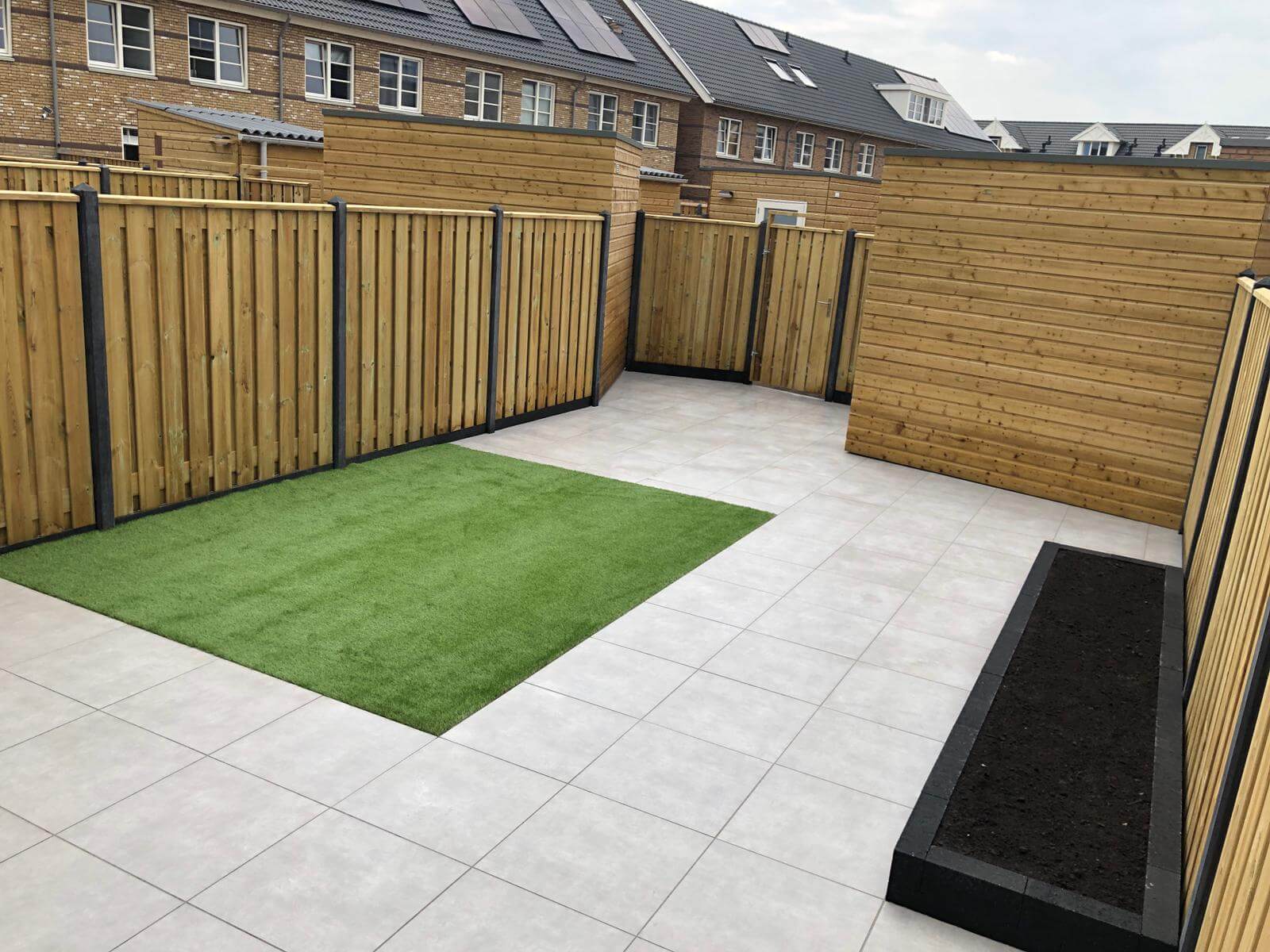 Ontwerp en aanleg nieuwe tuin Almere met keramisch terras, borderbak van patio blokken en kunstgras.