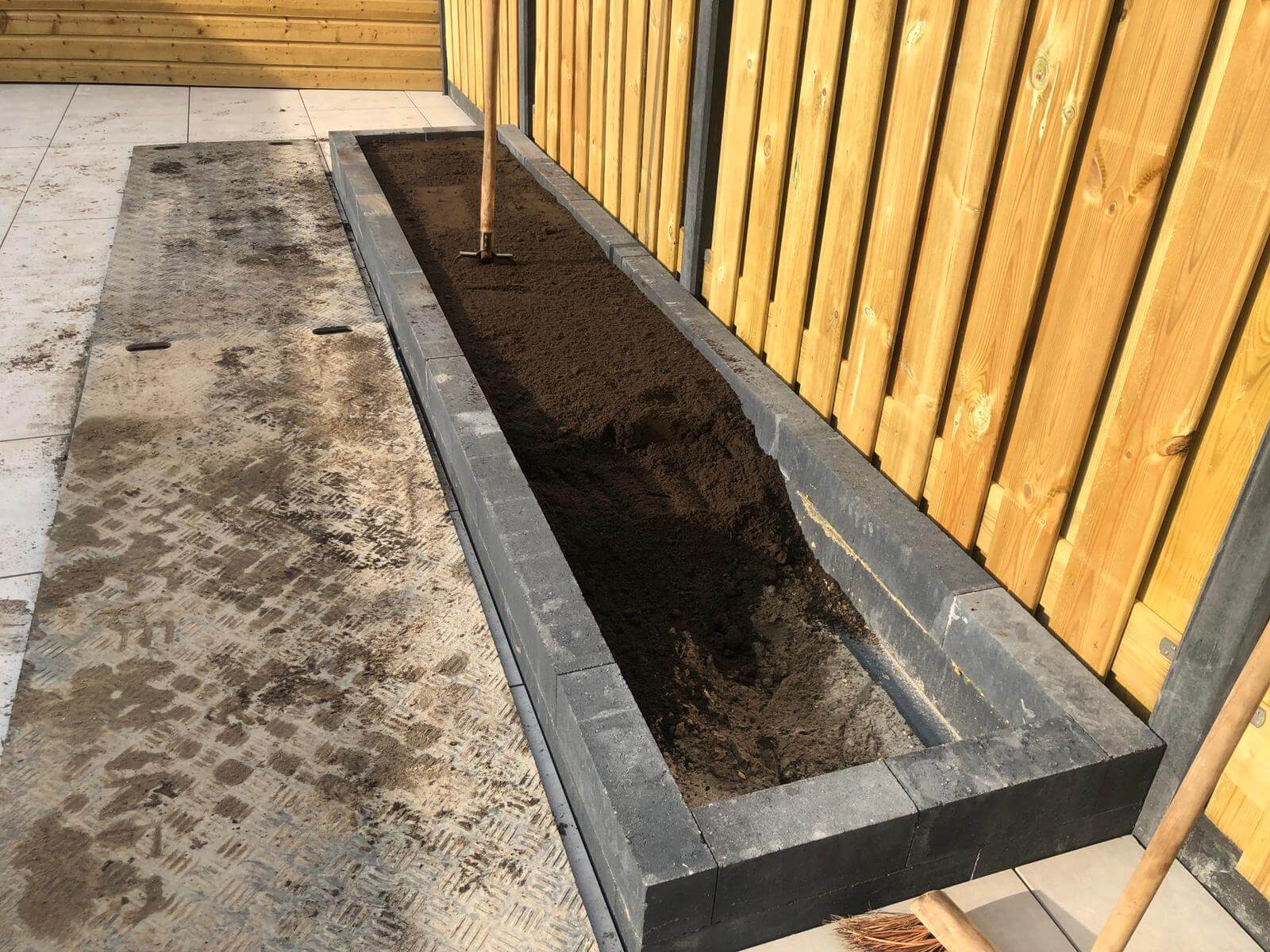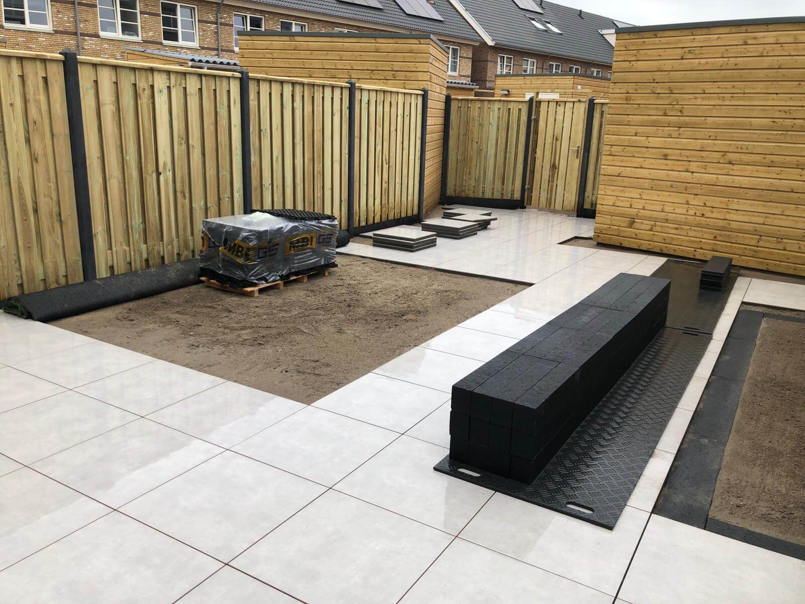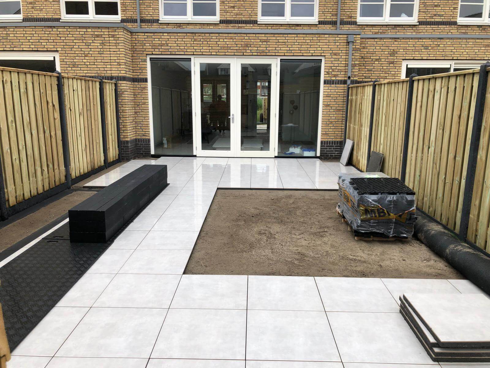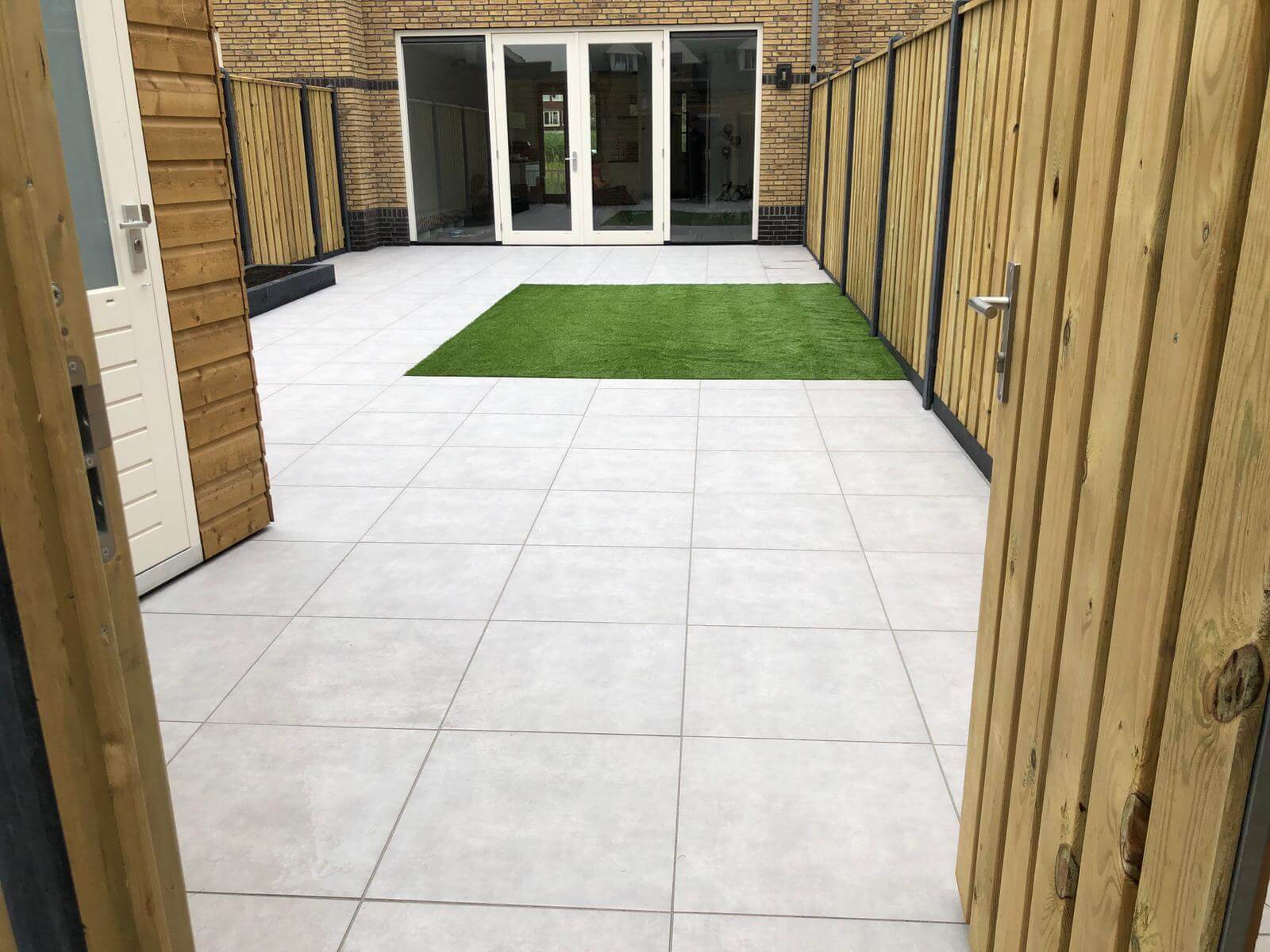 Ontwerp en aanleg nieuwe tuin Almere met keramisch terras, borderbak van patio blokken en kunstgras.