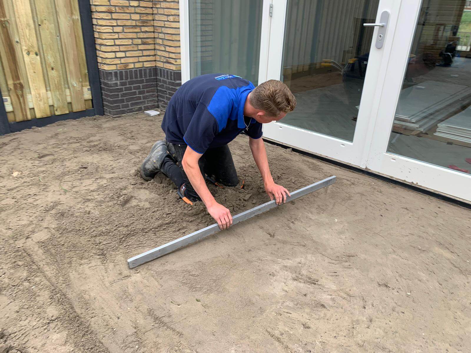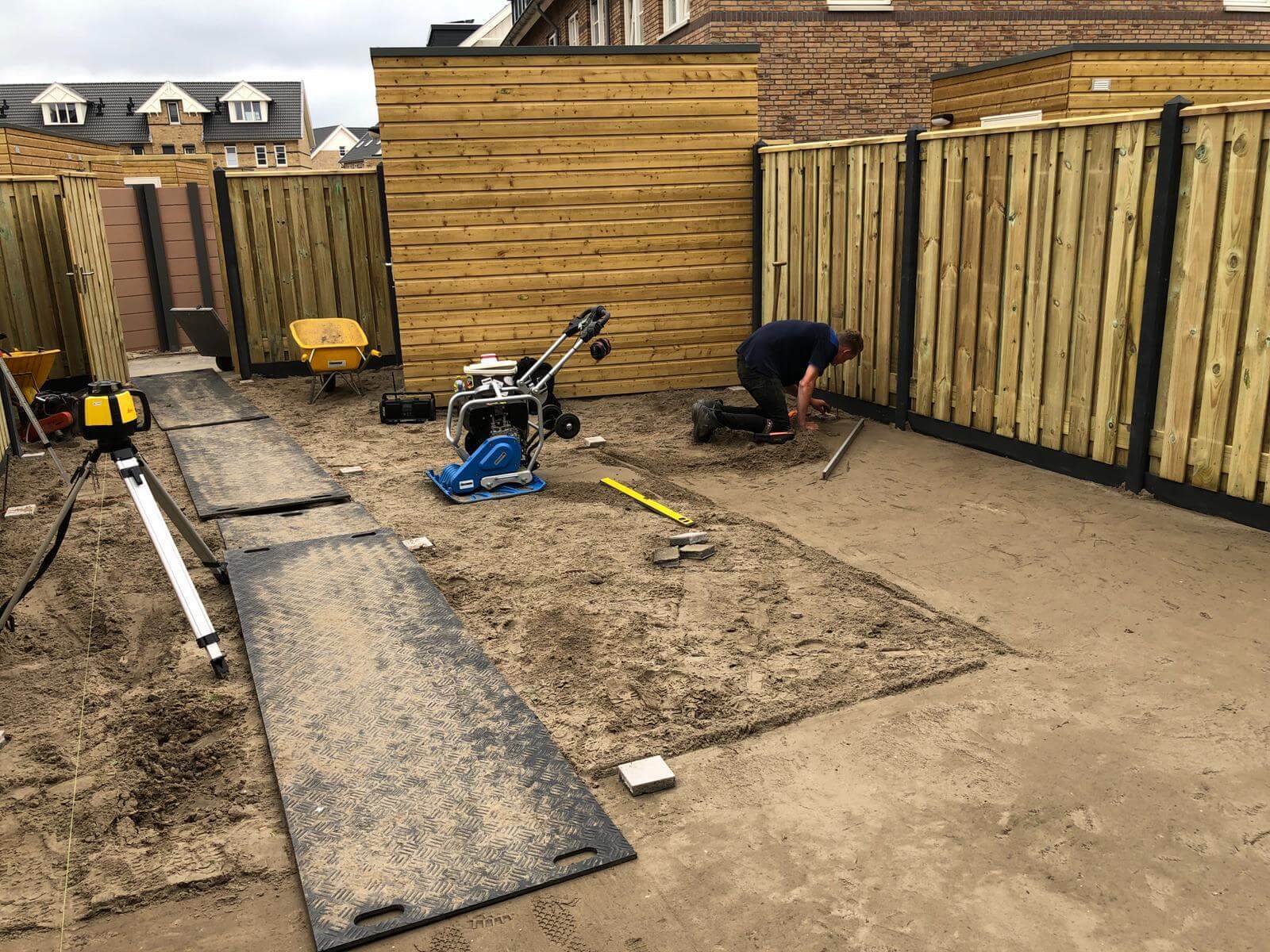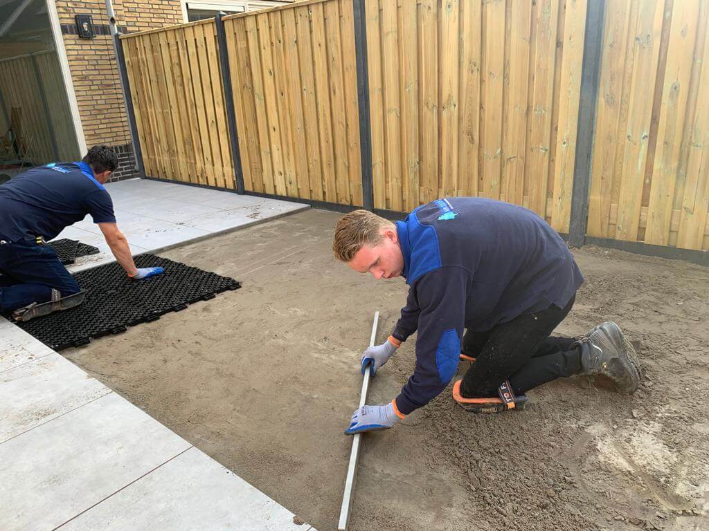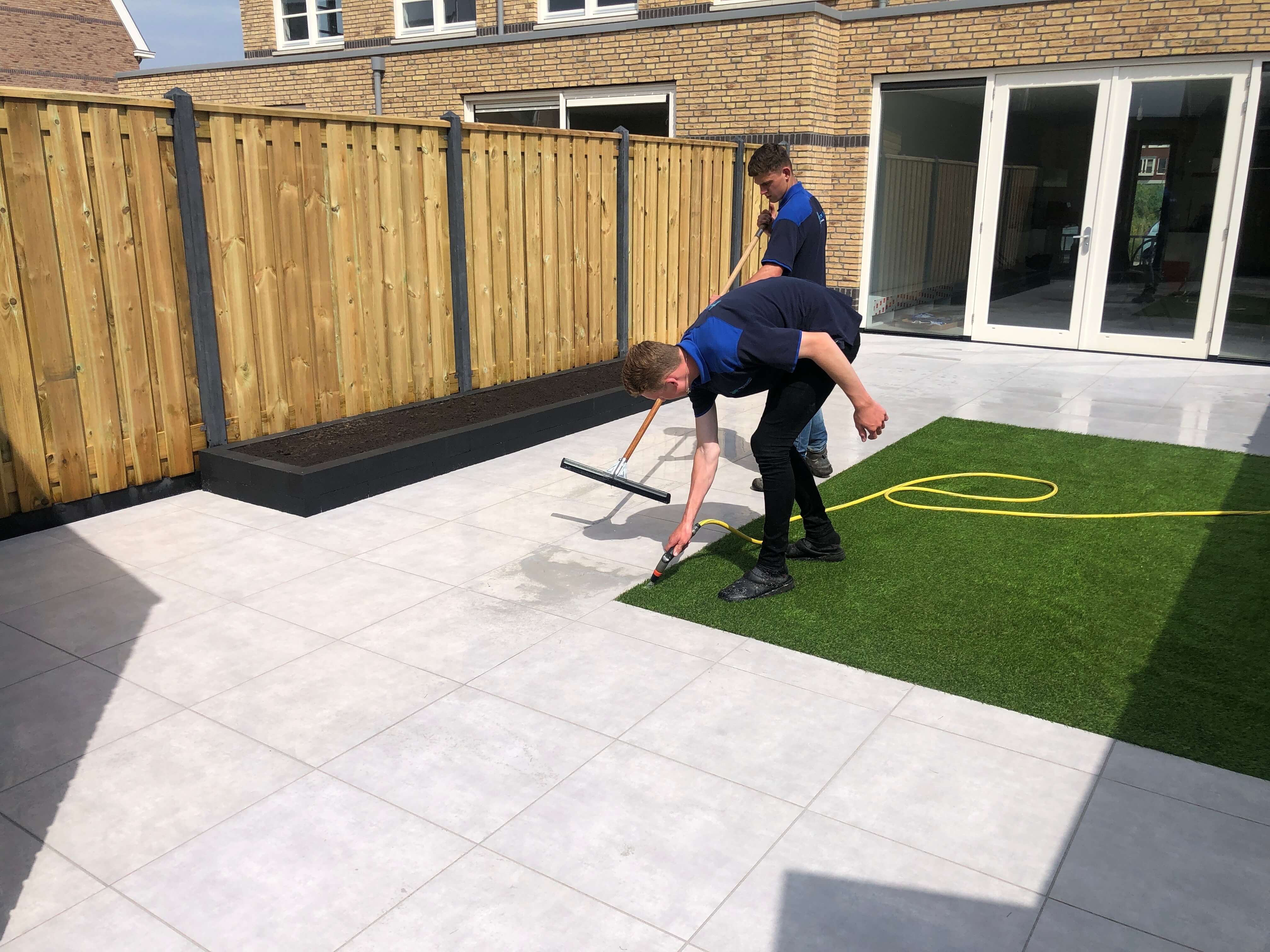 Ontwerp en aanleg nieuwe tuin Almere met keramisch terras, borderbak van patio blokken en kunstgras.