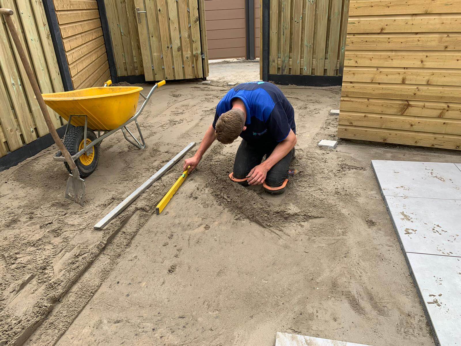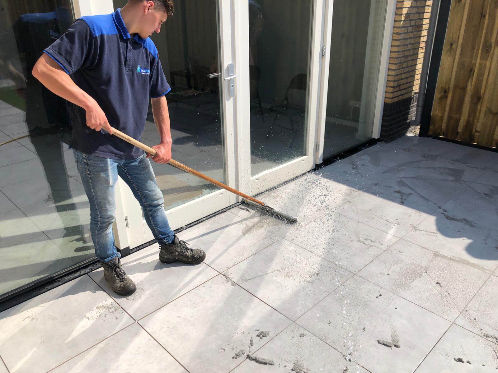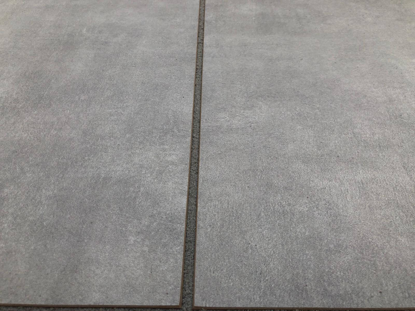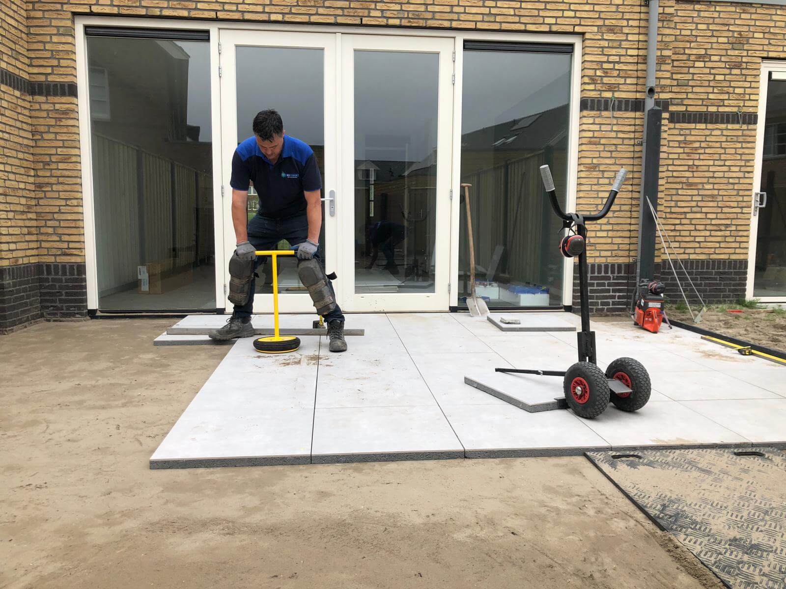 In het terras hebben we keramische tegels GeoCeramica 60x60x4cm one Grey met een toplaag 1 cm aangebracht. Het keramiek is onlosmakelijk verbonden met de waterdoorvoerende Stabikorn laag. De voegen zijn van Varistone LM Aqua drainerende waterdoorlatende voegmortel steengrijs.