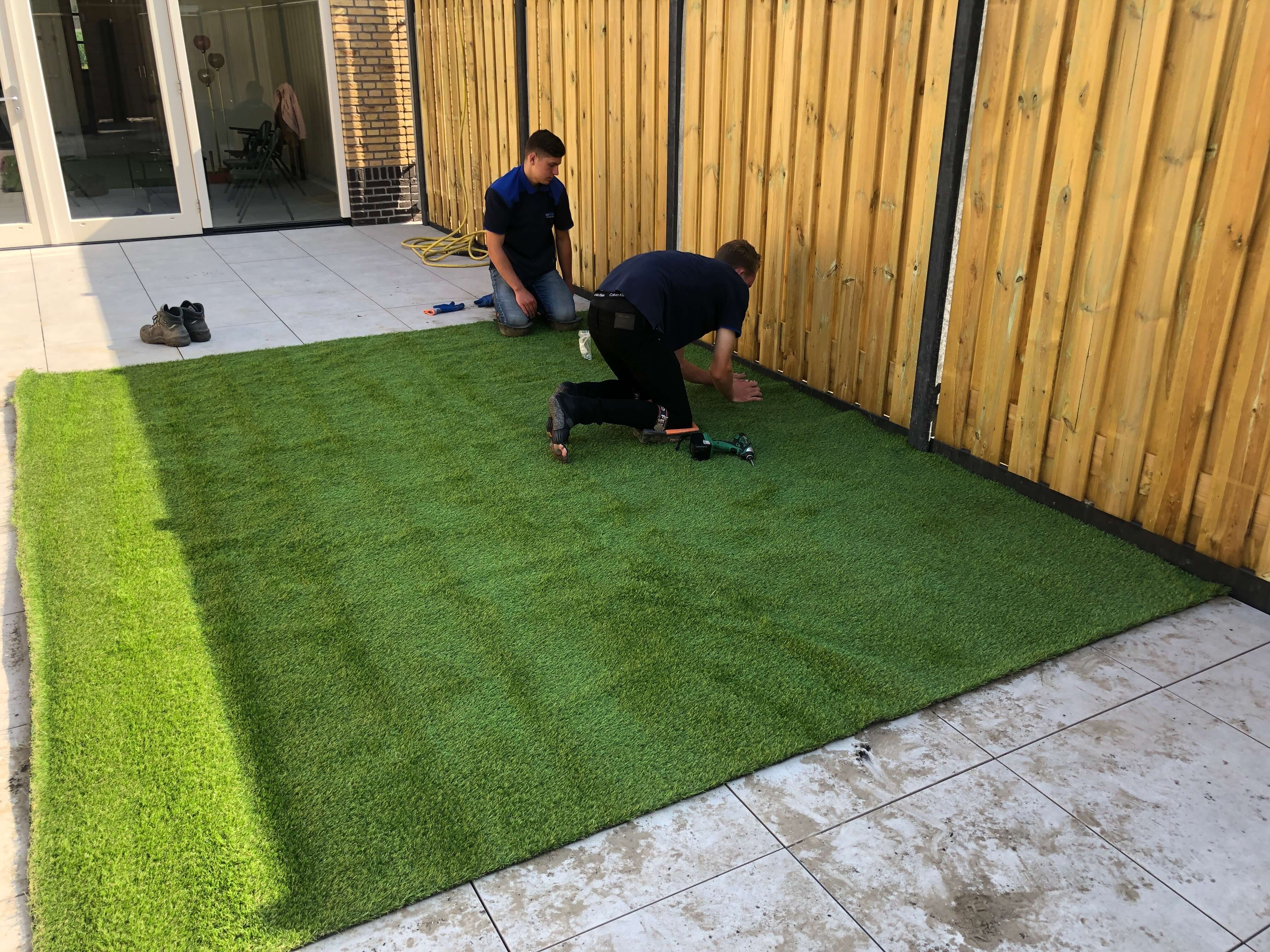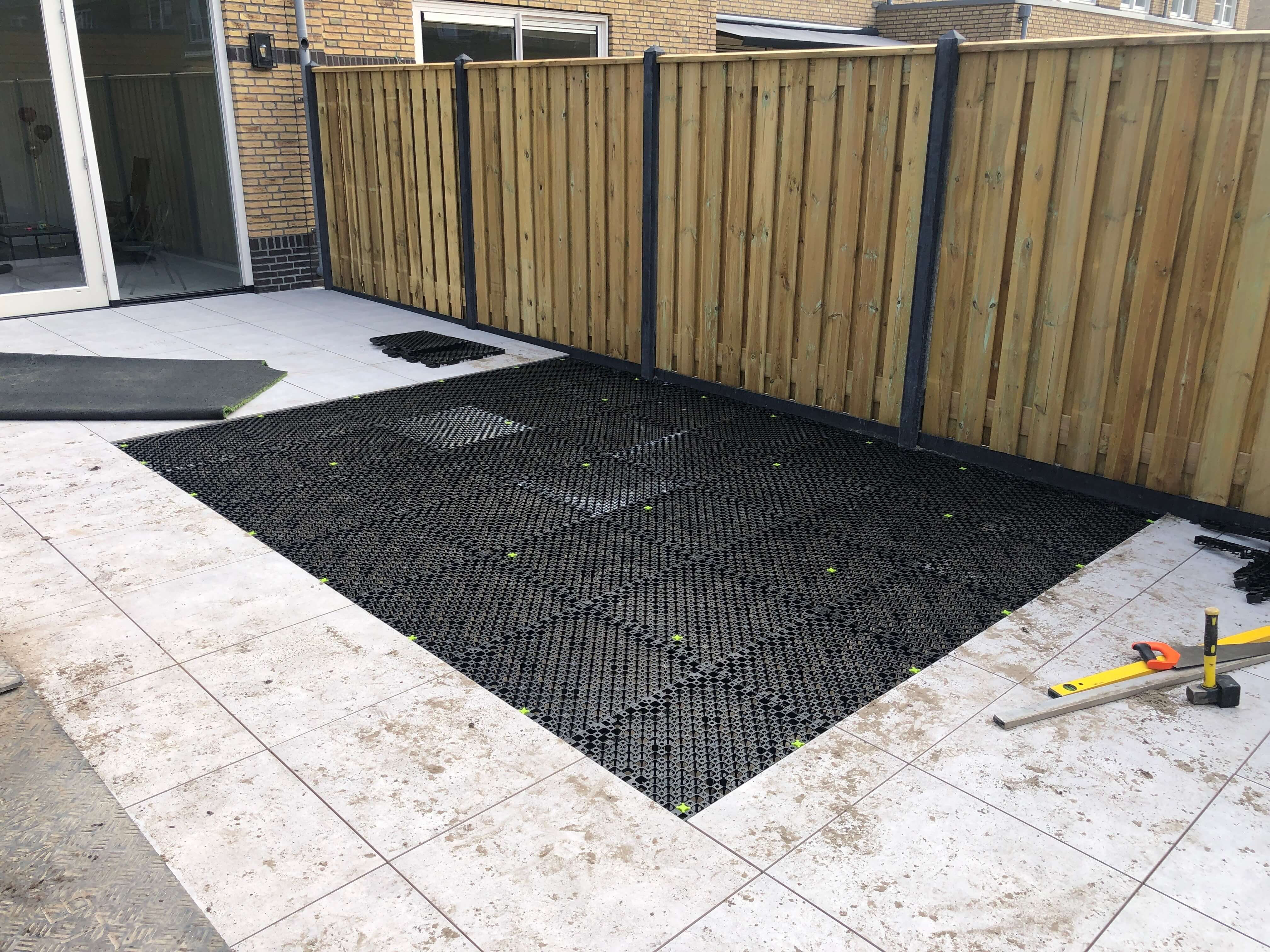 Het 30mm dikke kunstgras wordt vastgezet op een Drainbase waterdoorlatende onderplaat wat door middel van een connectiesysteem wordt gekoppeld en zorgt dat de platen niet van elkaar verschuiven.