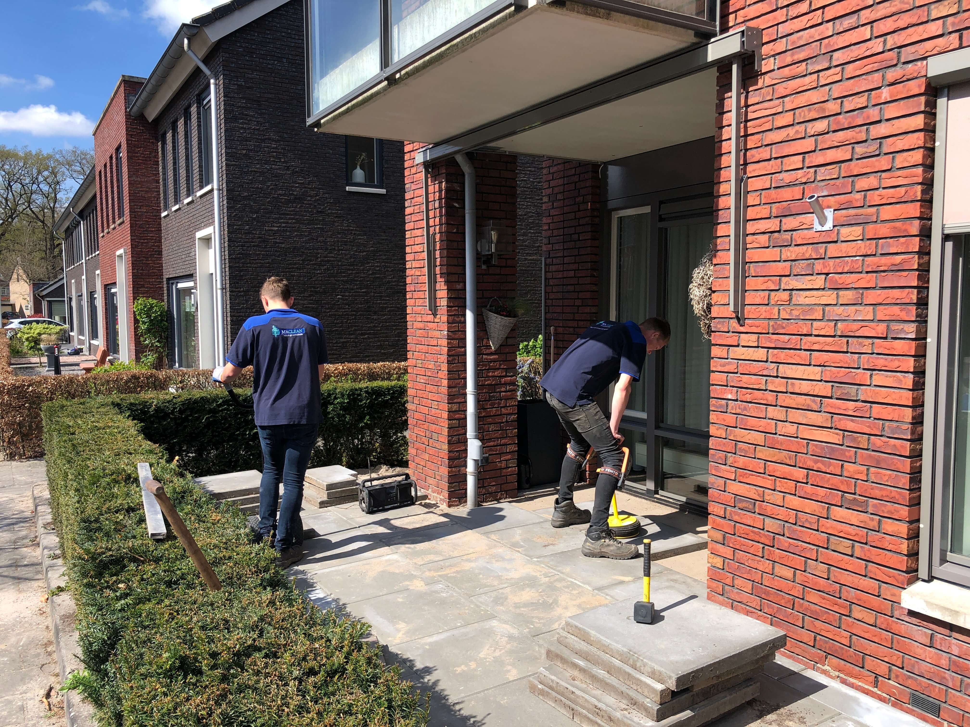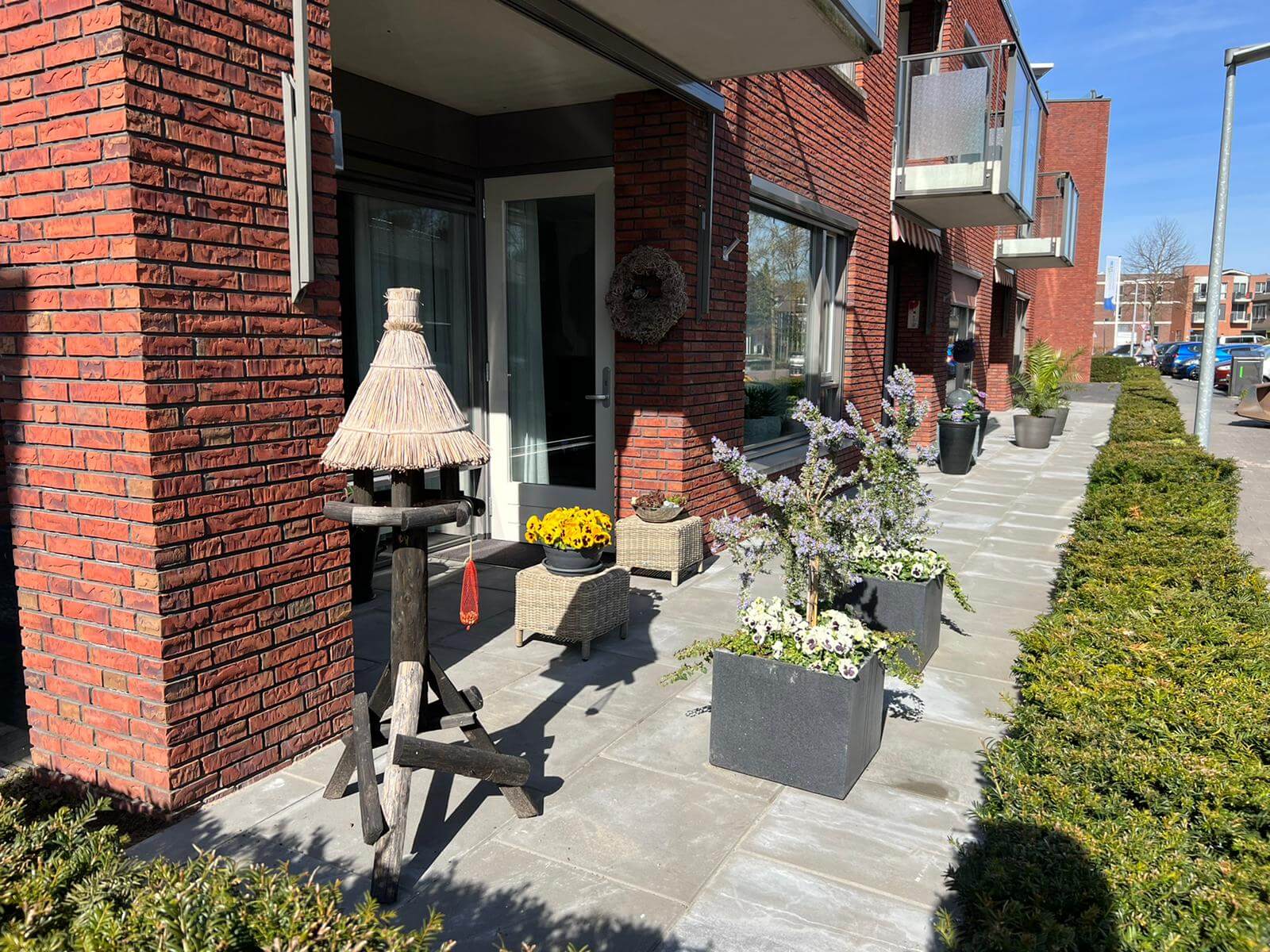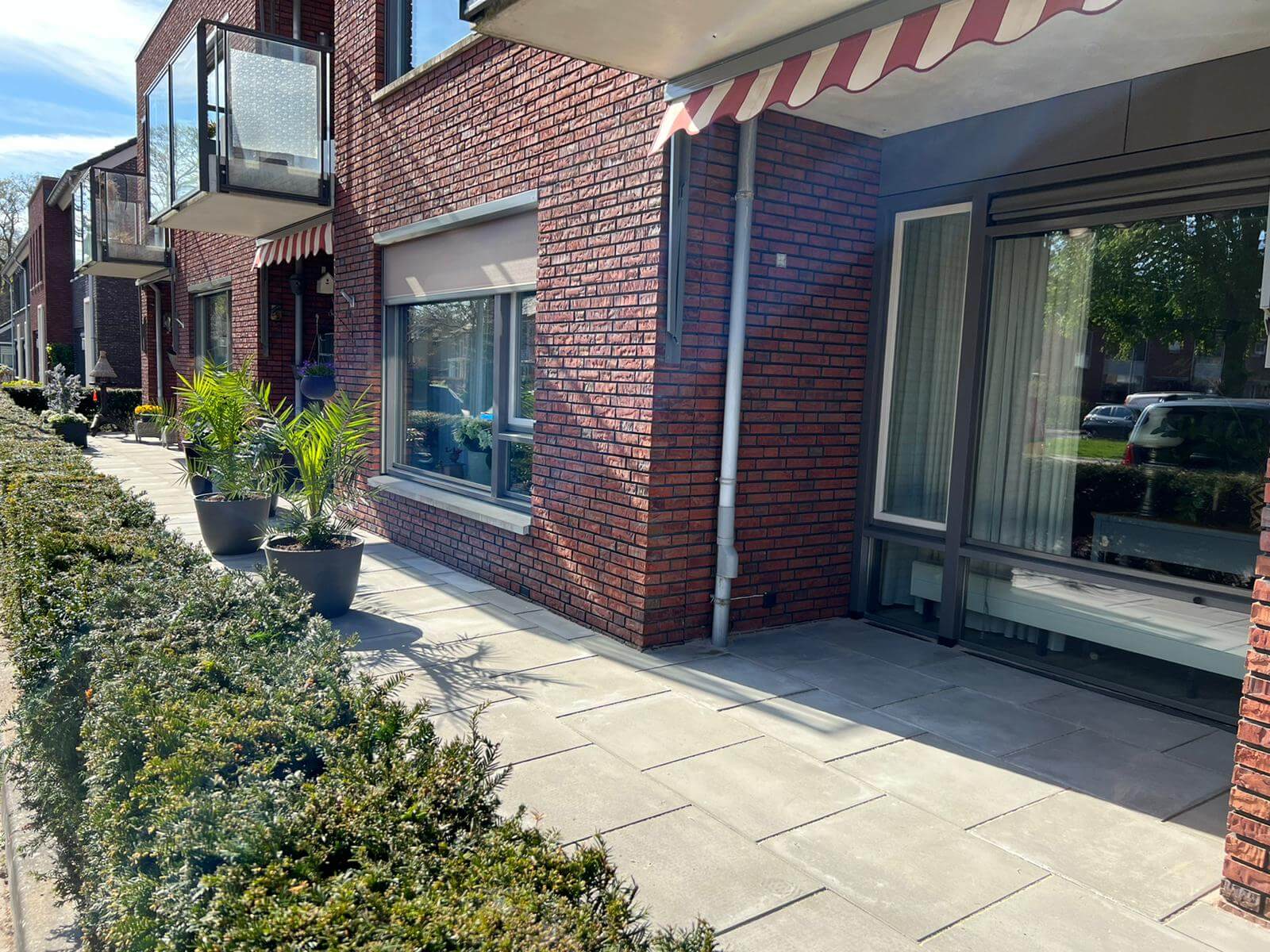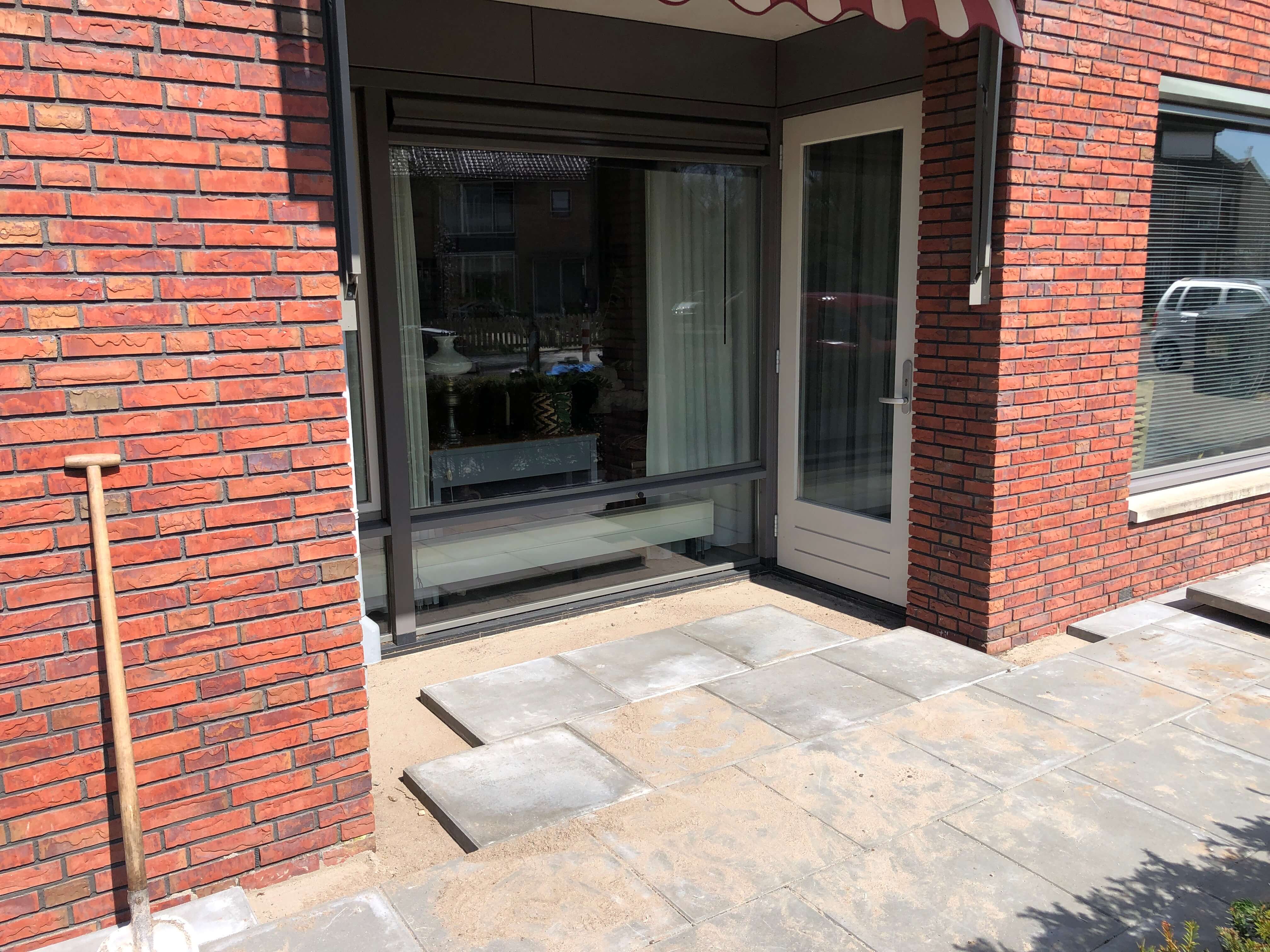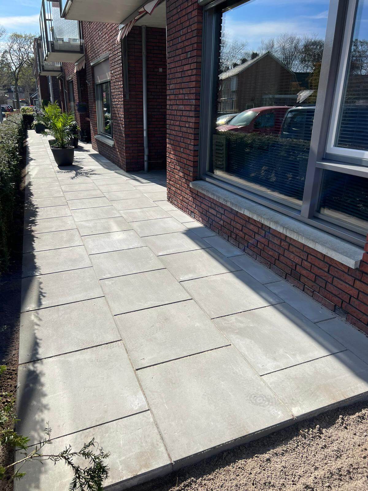 Het terras is aangelegd met een Kijlstra betontegel 60x60x5 cm grijs.