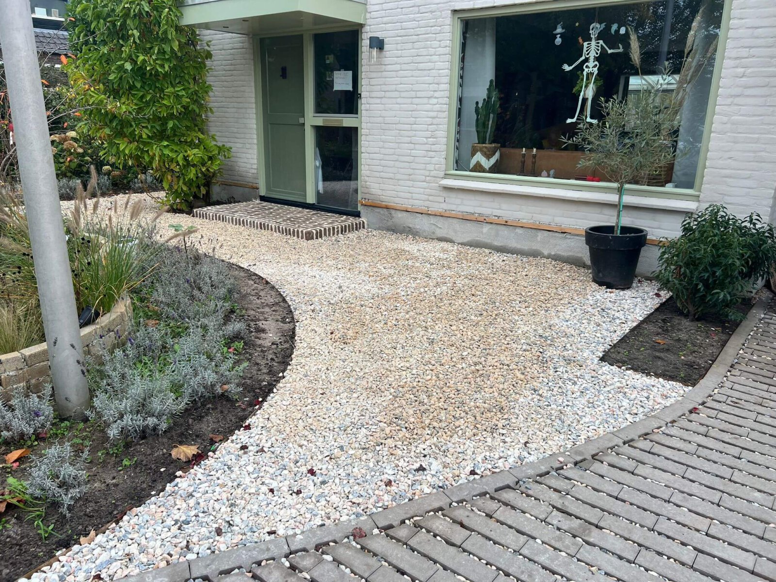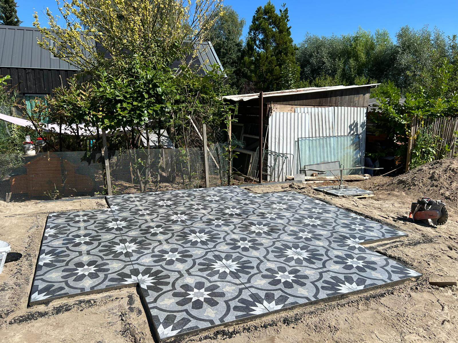 In het terras zijn keramische tegels GeoCeramica Decoro Tulipani 80x80x4cm aangebracht. Als staptegels Caledonia OAK 120x30x4cm houtlook. De tegel is uitgevoerd met een toplaag 1 cm keramiek. Het keramiek is onlosmakelijk verbonden met de waterdoorvoerende Stabikorn laag. De voegen zijn van Varistone LM Aqua drainerende waterdoorlatende voegmortel steengrijs. Tussen de stapstenen is Flamingo Marble split 6-14 mm als decoratie aangebracht op een stabilisatiemat met een corten stalen kantopsluiting in combinatie met een poort van kastanjehout. In de oprit is een NCB klinker aangebracht. Deze klinker is 17% waterpasserend en zijn de poriën afgevuld met split zodat het regenwater infiltreert in de bodem.