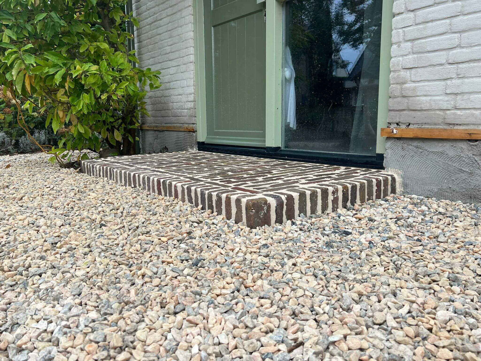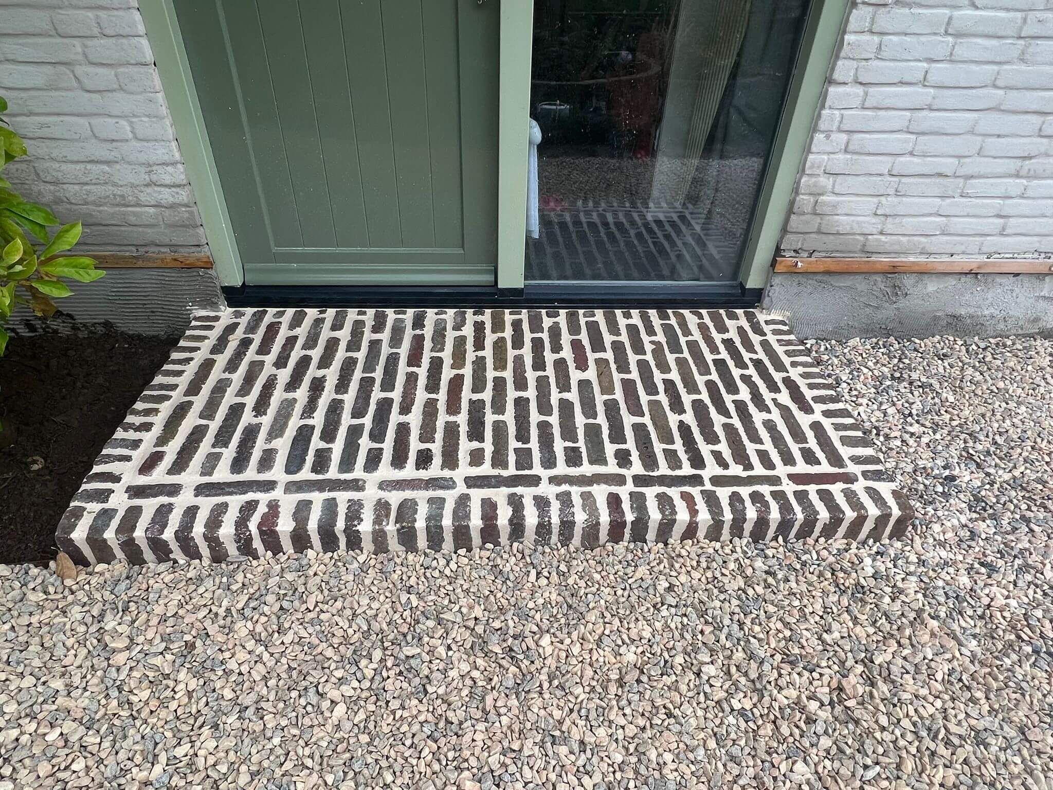 De entree is op een betonnen fundering gemetseld van 19e eeuwse Waaltjes licht ingevoegd met hoogwaardige ARDEX GK Beige.