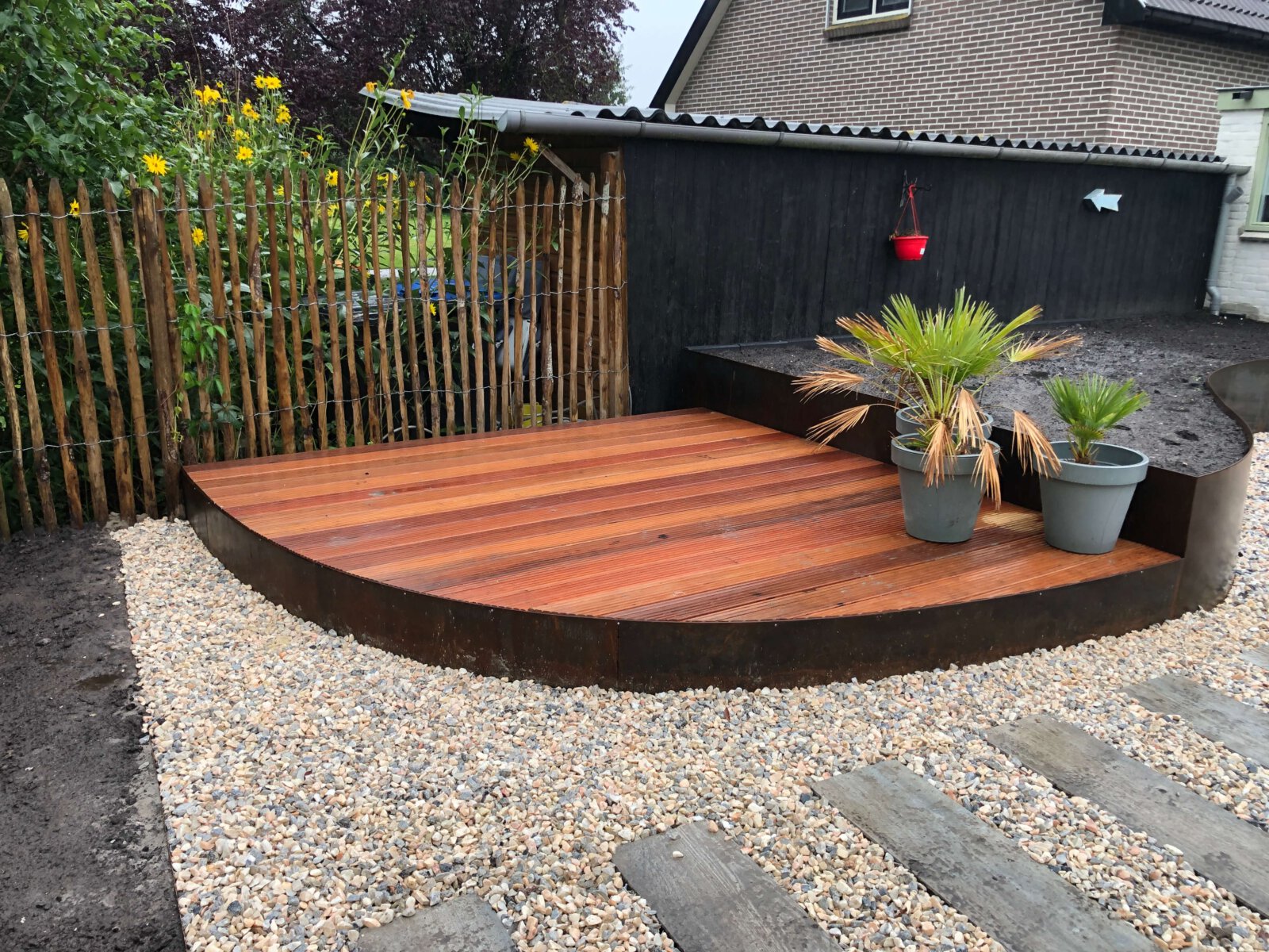 De vlonder is gemaakt van een geprofileerde hardhouten vlonderplank met een natuurlijke uitstraling De fundering is gemaakt van hardhout Angelim Verhelmo 4,5x7cm op piketpalen Azobe 5x5x100cm. Door deze combinatie van hardhouten vlonder en keramisch terras is het een luxe onderhoudsvrije tuin geworden.