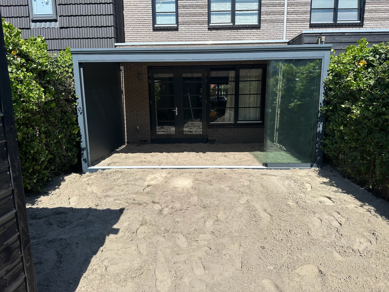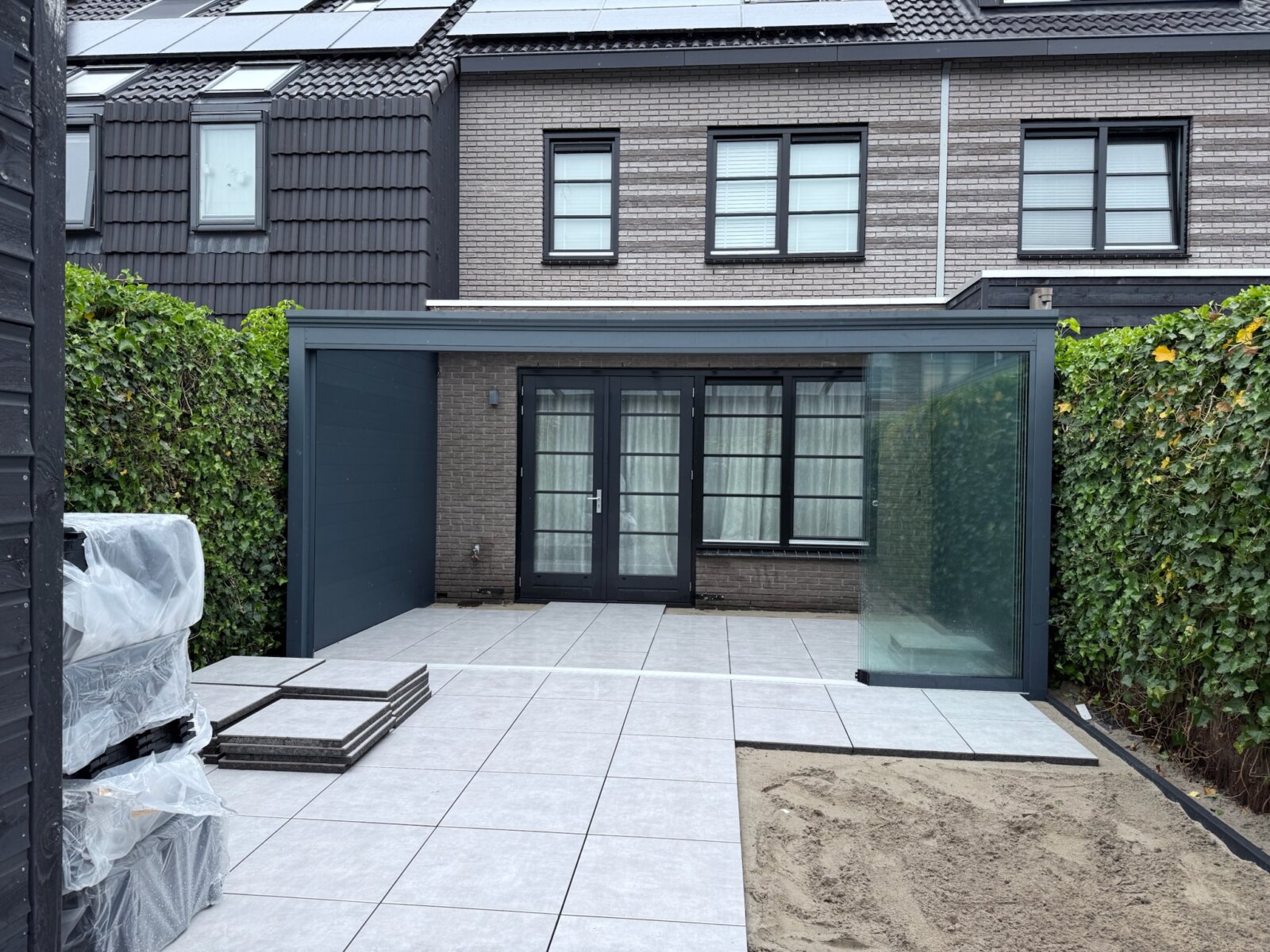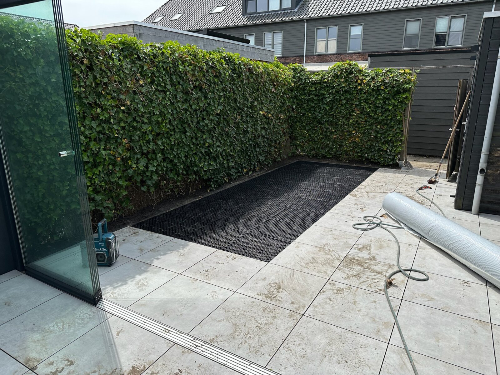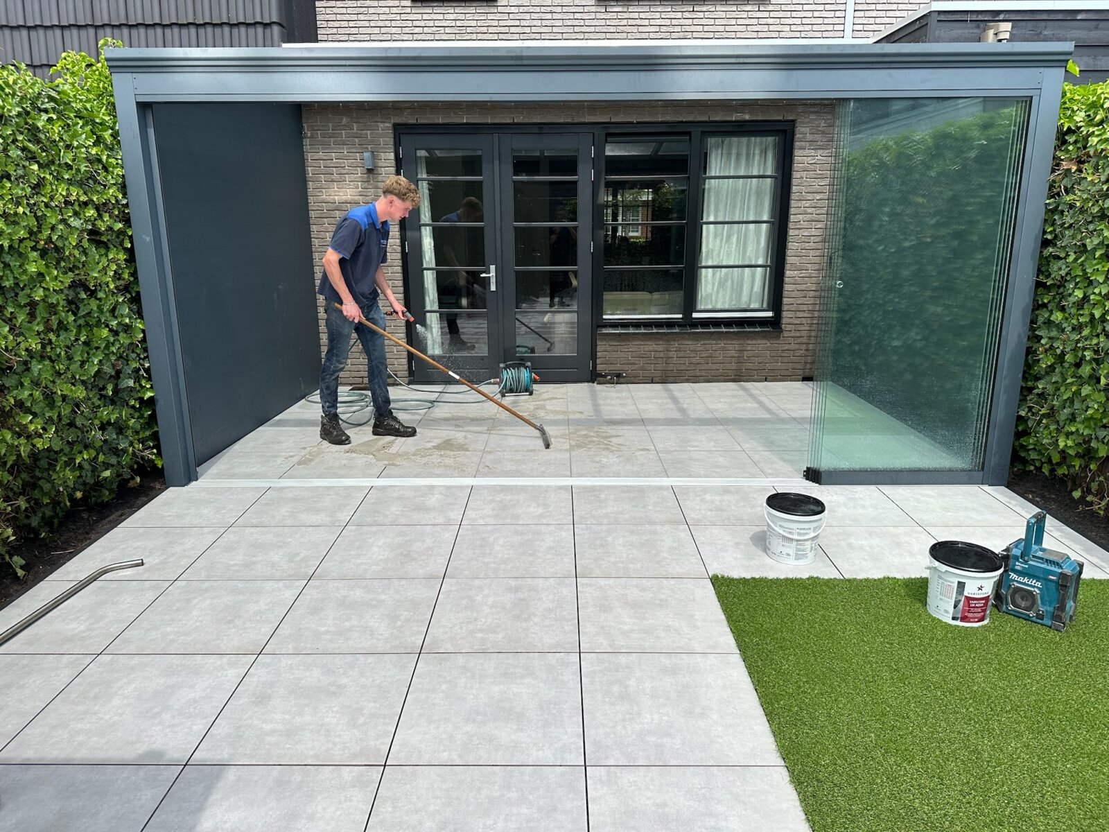 Wij hebben het grondwerk met klein materieel uitgevoerd en het zand-grond aan en afgevoerd door het achterpad. In het terras en de overkapping hebben we keramische tegels MBI GeoCeramica® 60x60x4cm Old Grey (Private label) met een toplaag 1 cm aangebracht. Het keramiek is onlosmakelijk verbonden met de waterdoorvoerende Stabikorn laag. De voegen zijn van Varistone LM Aqua drainerende waterdoorlatende voegmortel kleur naturel.