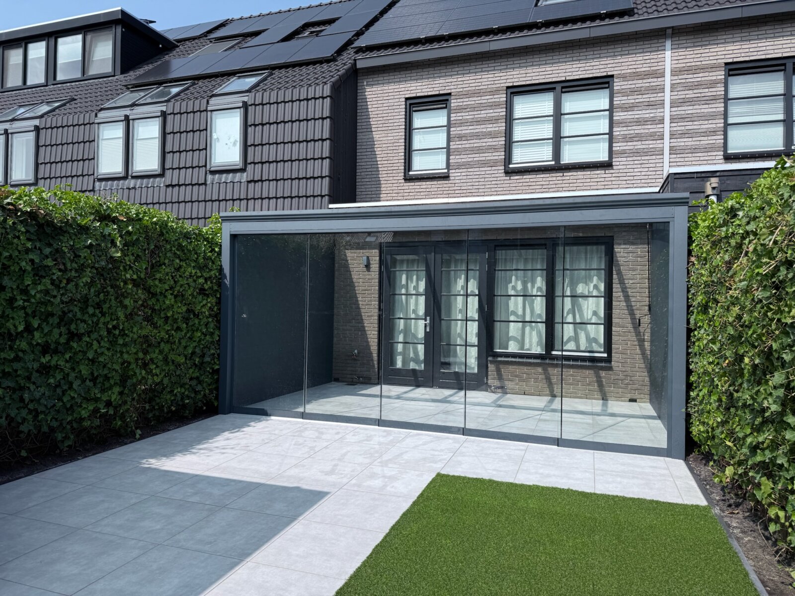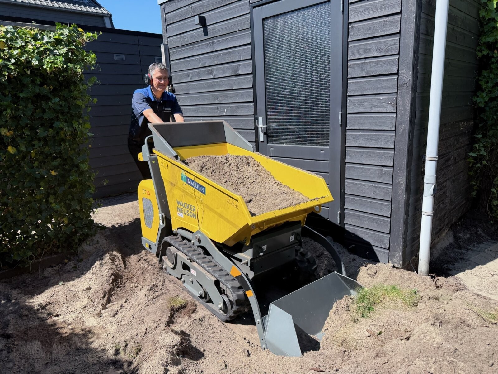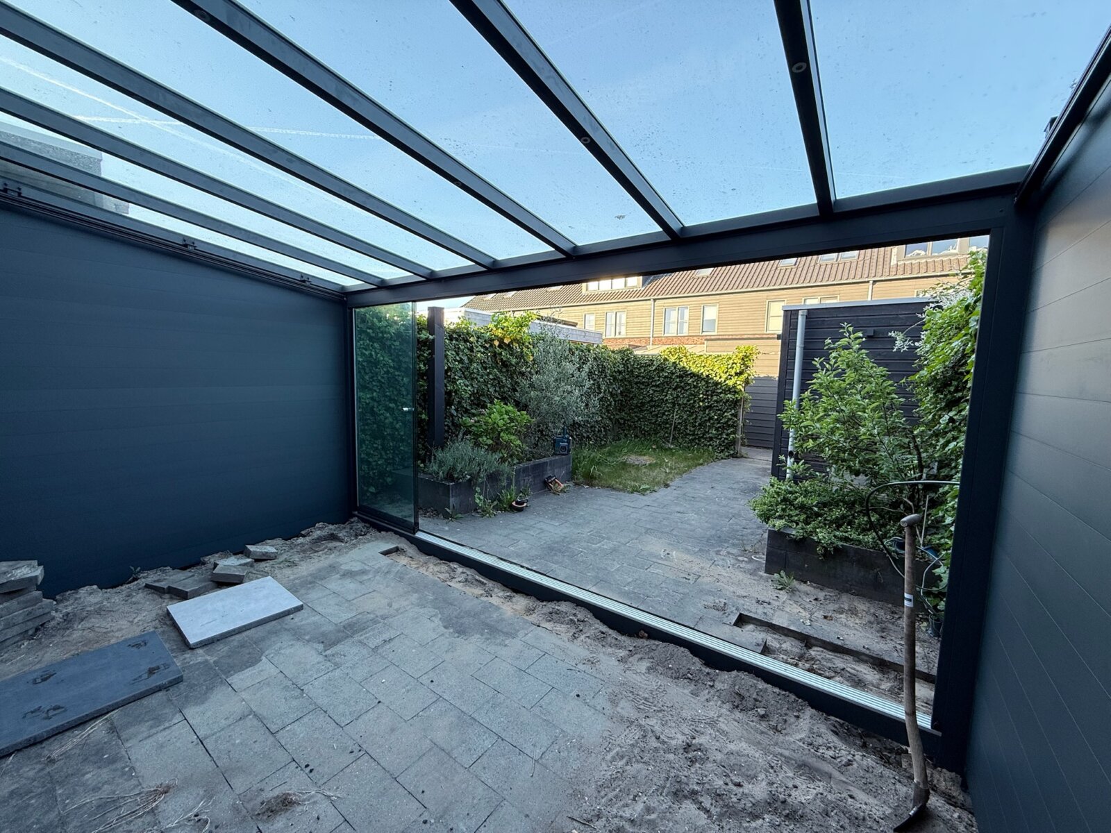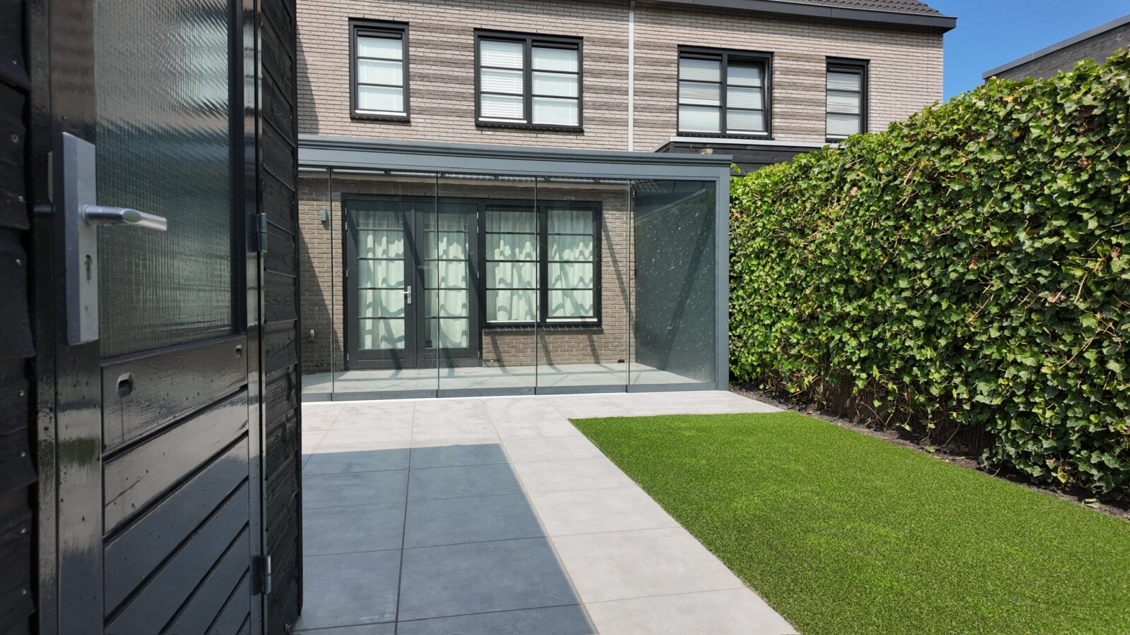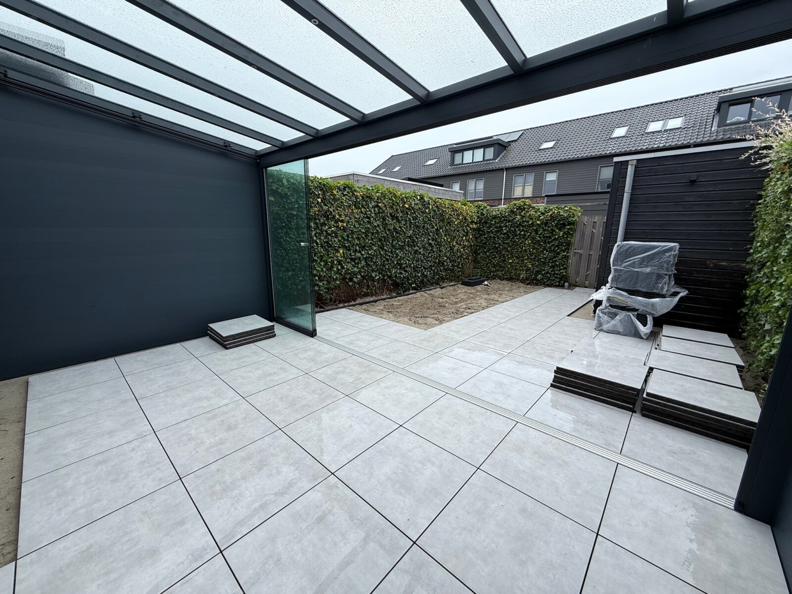 Wij hebben het grondwerk met klein materieel uitgevoerd en het zand-grond aan en afgevoerd door het achterpad. In het terras en de overkapping hebben we keramische tegels MBI GeoCeramica® 60x60x4cm Old Grey (Private label) met een toplaag 1 cm aangebracht. Het keramiek is onlosmakelijk verbonden met de waterdoorvoerende Stabikorn laag. De voegen zijn van Varistone LM Aqua drainerende waterdoorlatende voegmortel kleur naturel.