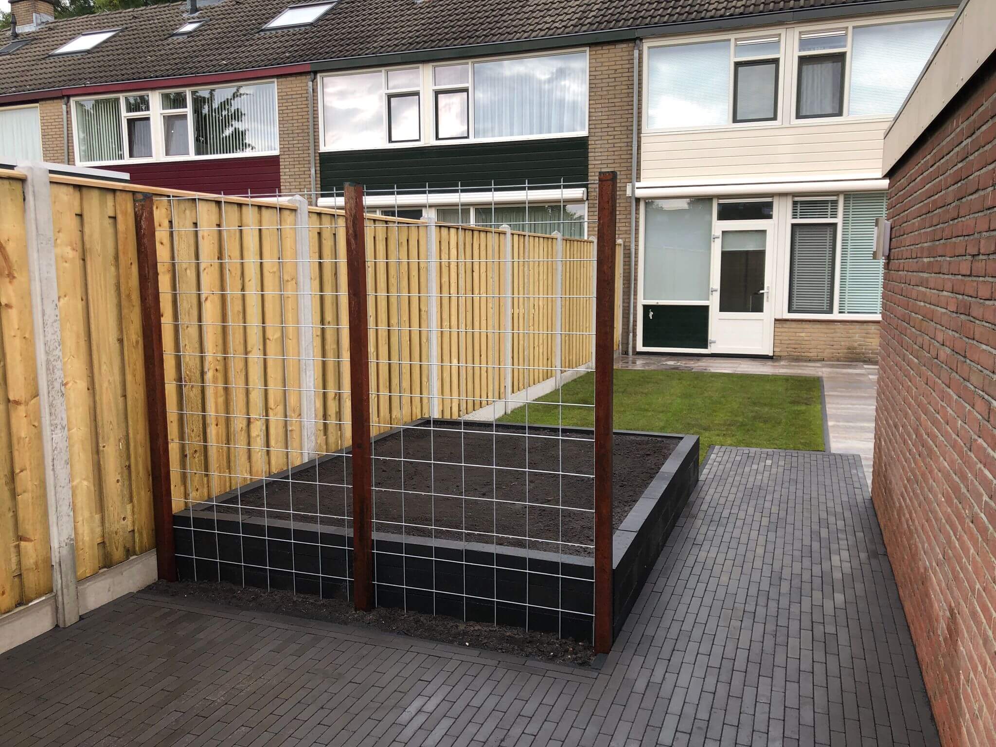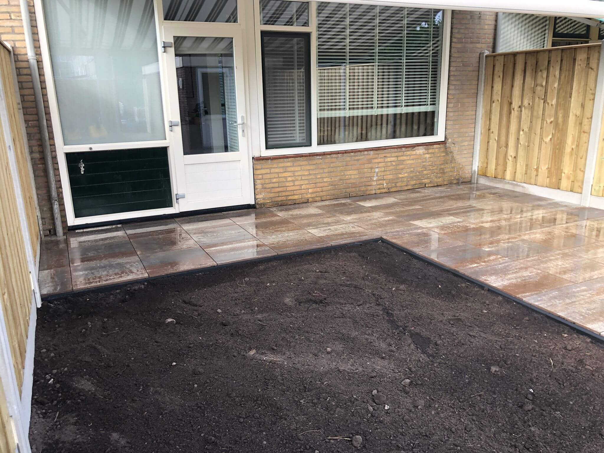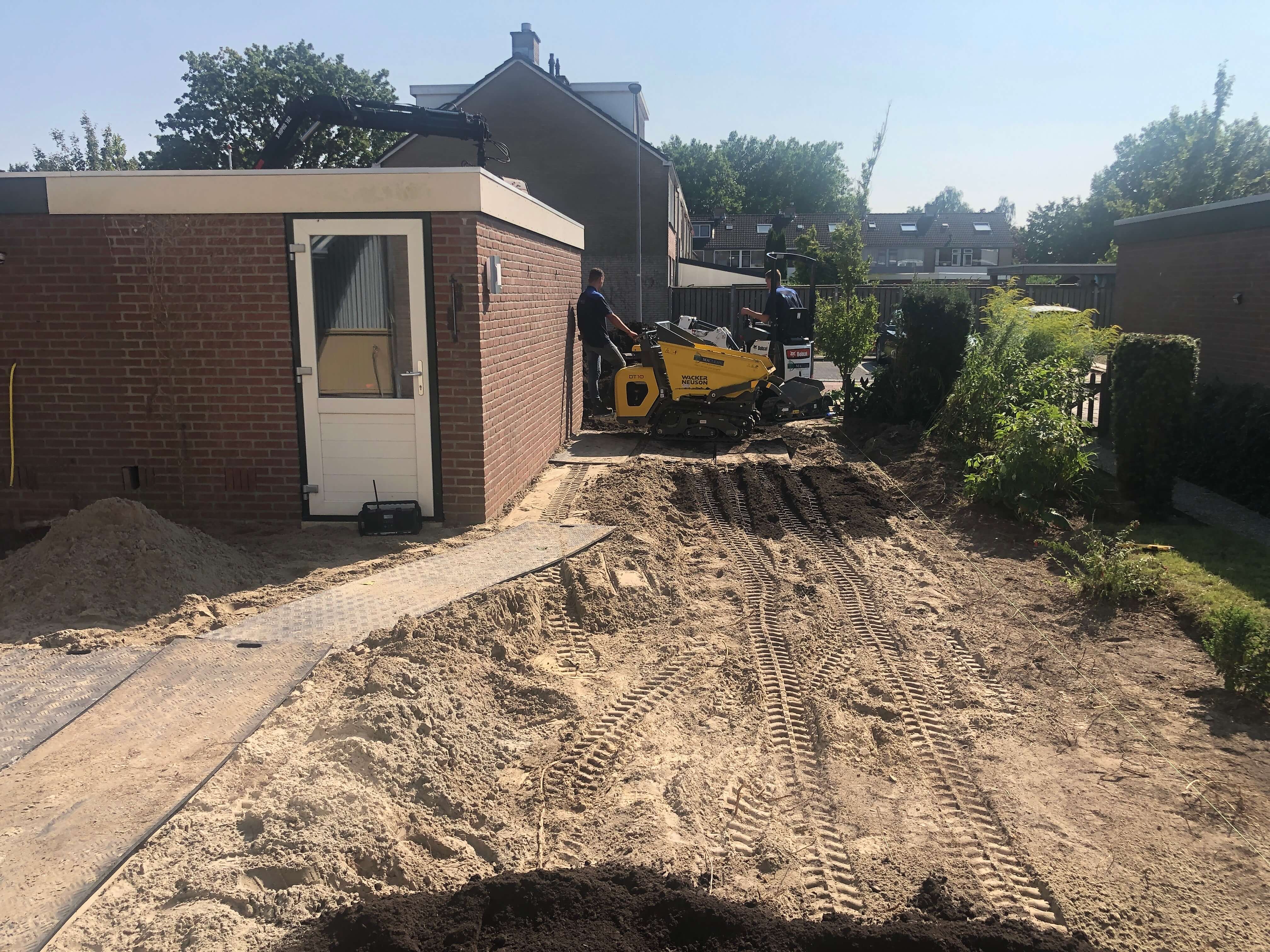 We hebben eerst tuin leeg gehaald het straatwerk en groen afgevoerd. Het grondwerk hebben we uitgevoerd met klein materieel en 25 cm straatzand aangebracht waarna we de hout-betonschutting hebben geplaatst. In het terras we MBI Geostretto Plus Tops Marilleva tegels 60x60x4cm met een pad van zwarte MBI GeoCotto Nero waalformaat aangebracht.