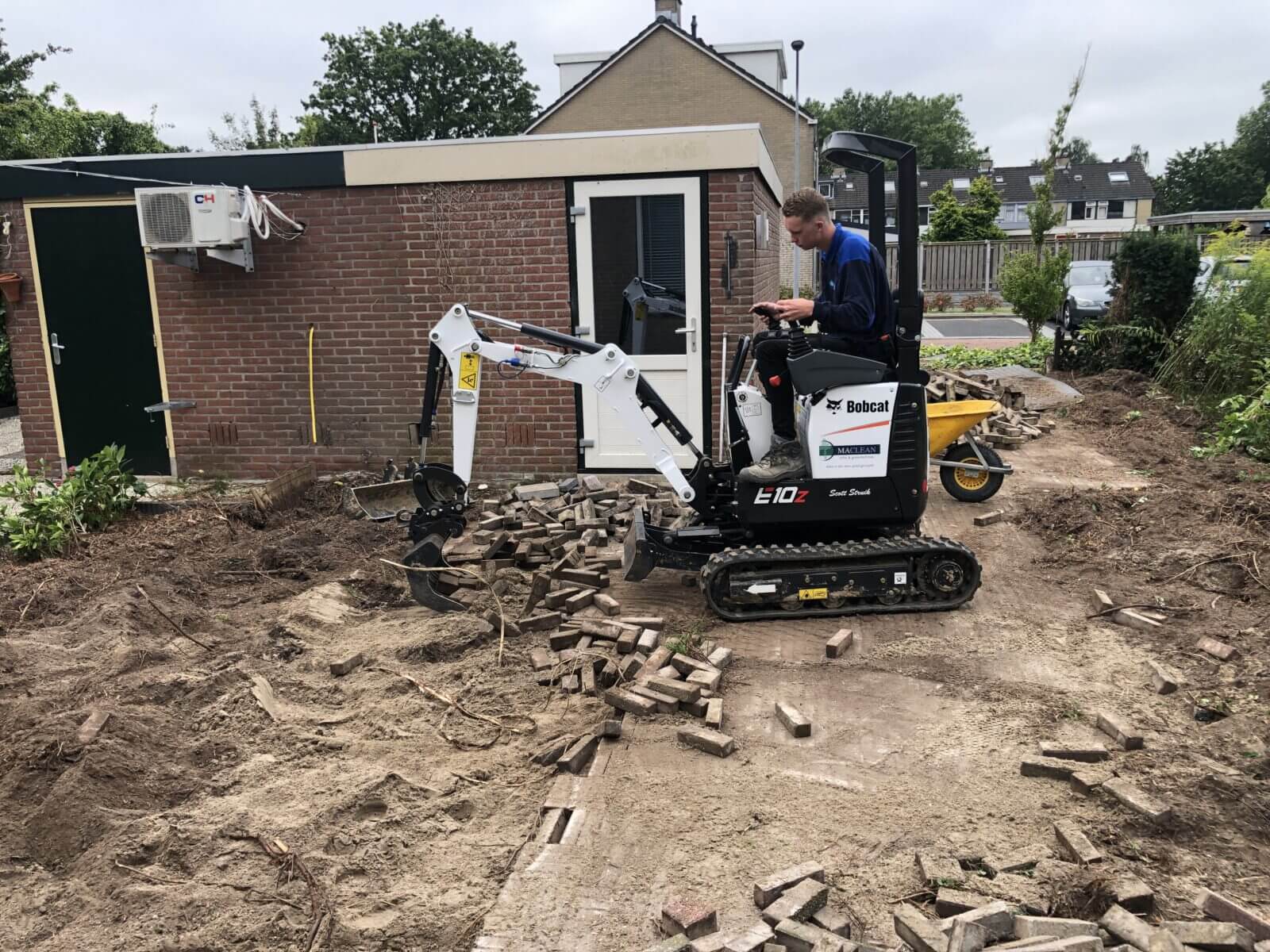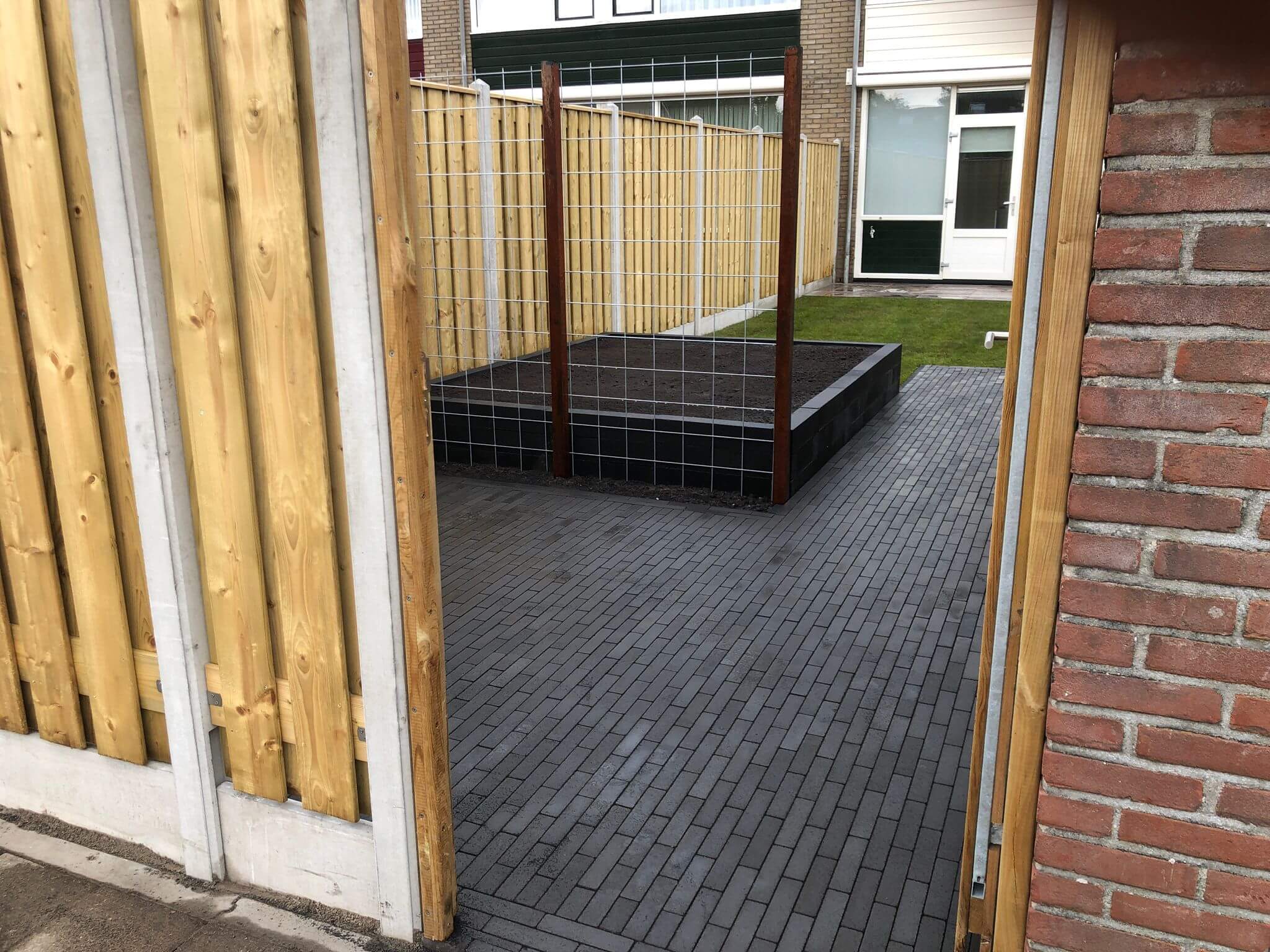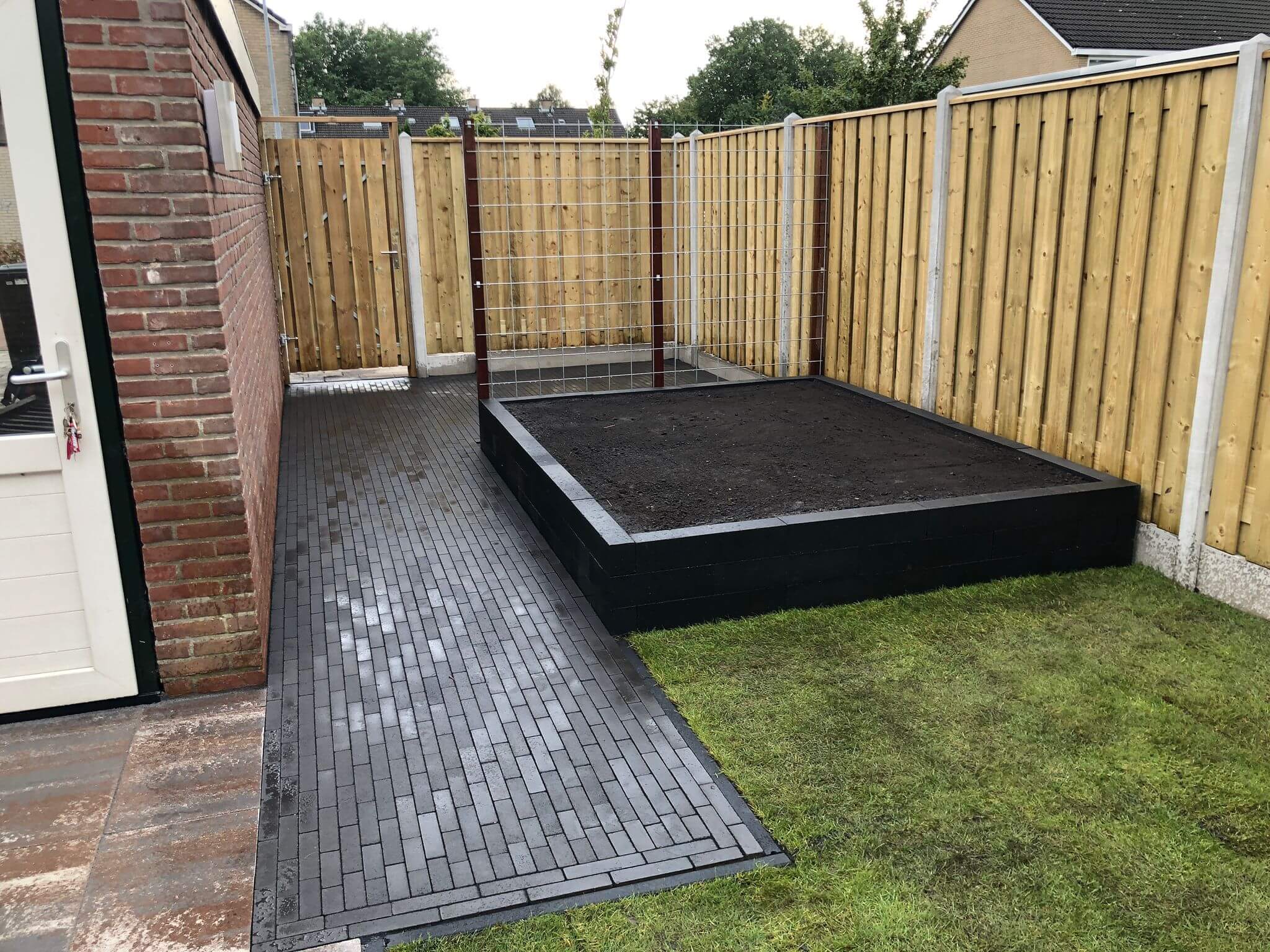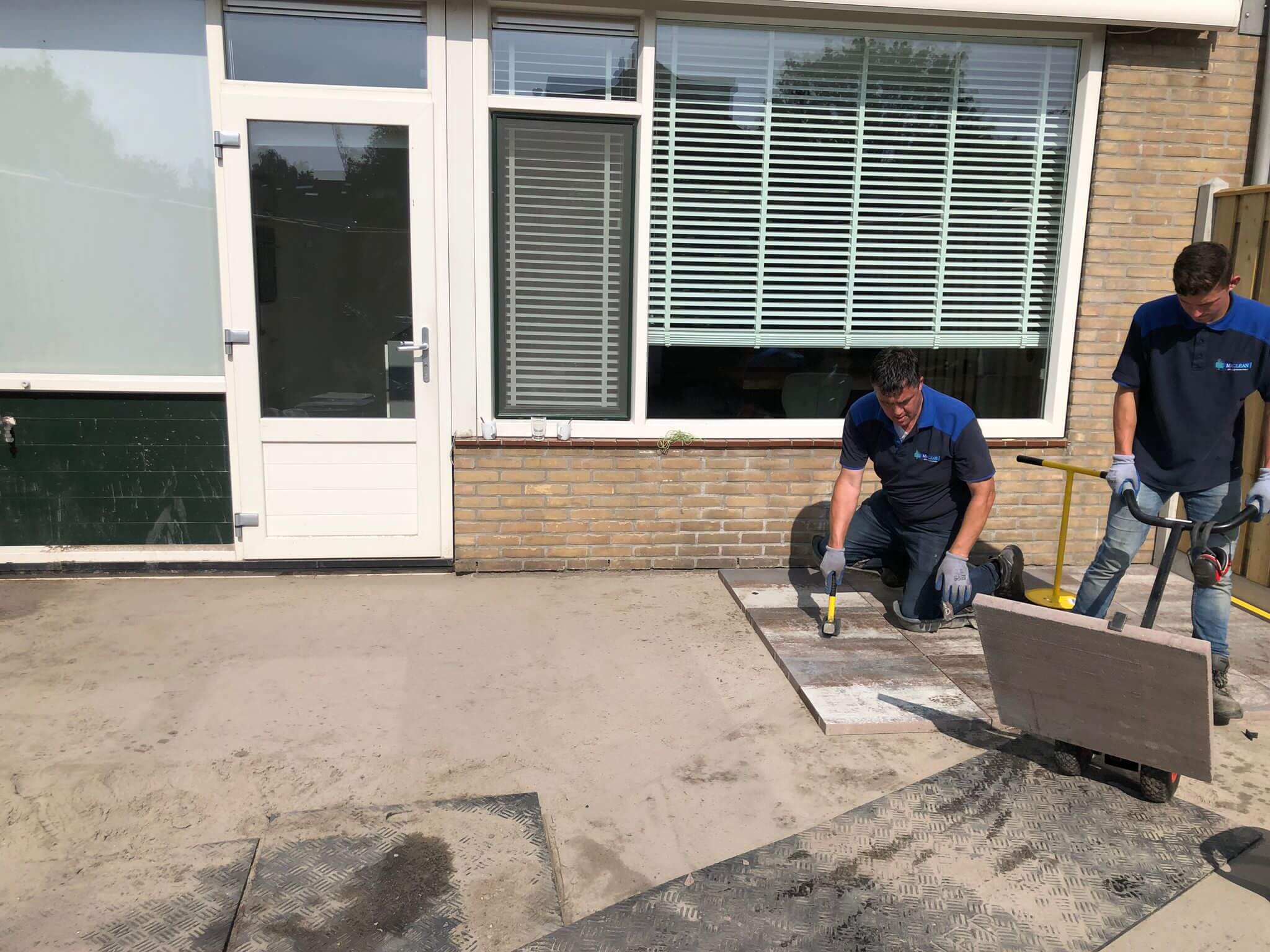 We hebben eerst tuin leeg gehaald het straatwerk en groen afgevoerd. Het grondwerk hebben we uitgevoerd met klein materieel en 25 cm straatzand aangebracht waarna we de hout-betonschutting hebben geplaatst. In het terras we MBI Geostretto Plus Tops Marilleva tegels 60x60x4cm met een pad van zwarte MBI GeoCotto Nero waalformaat aangebracht.