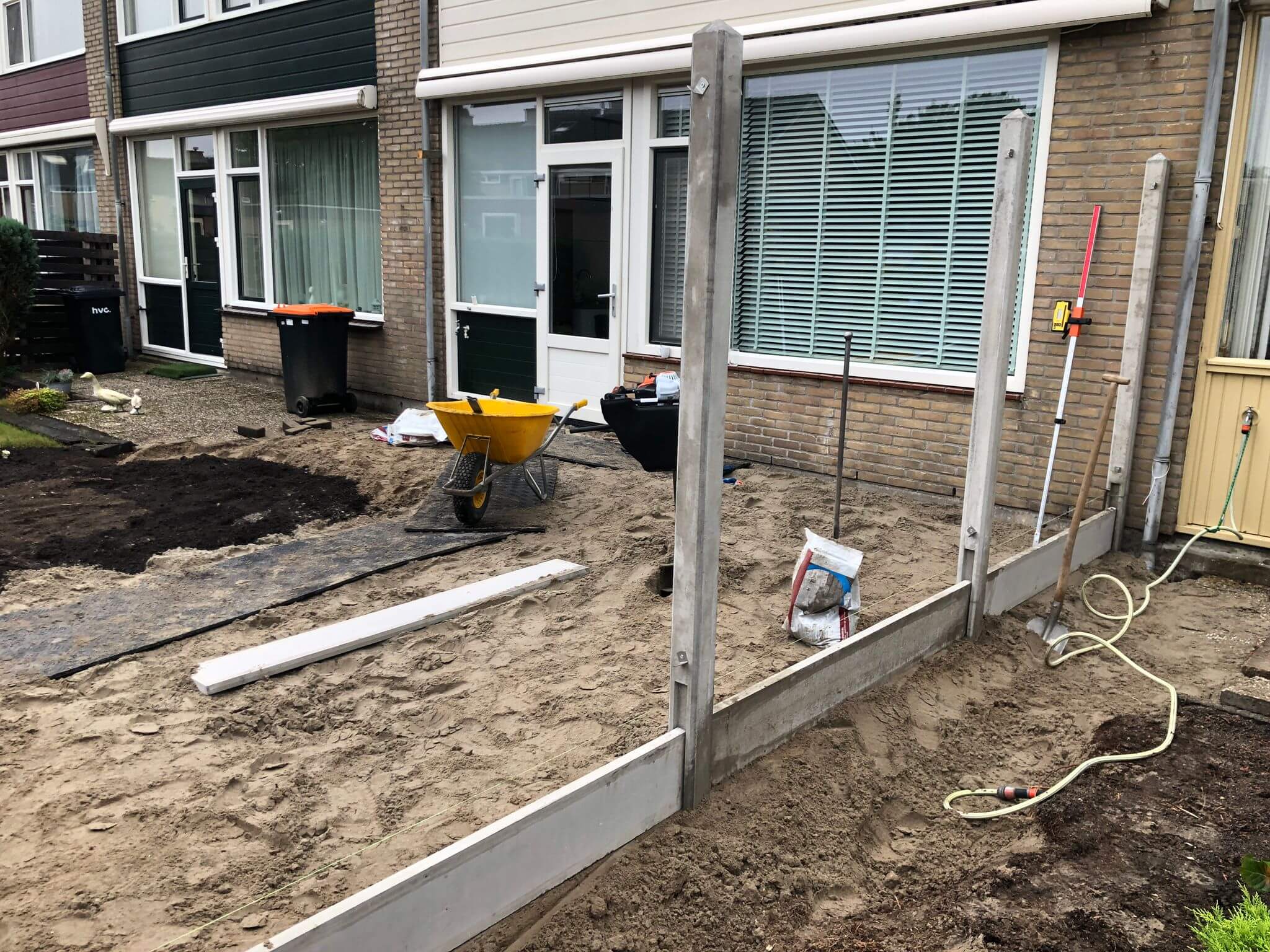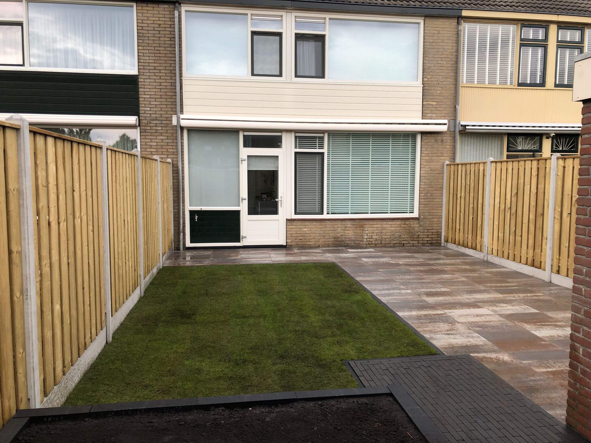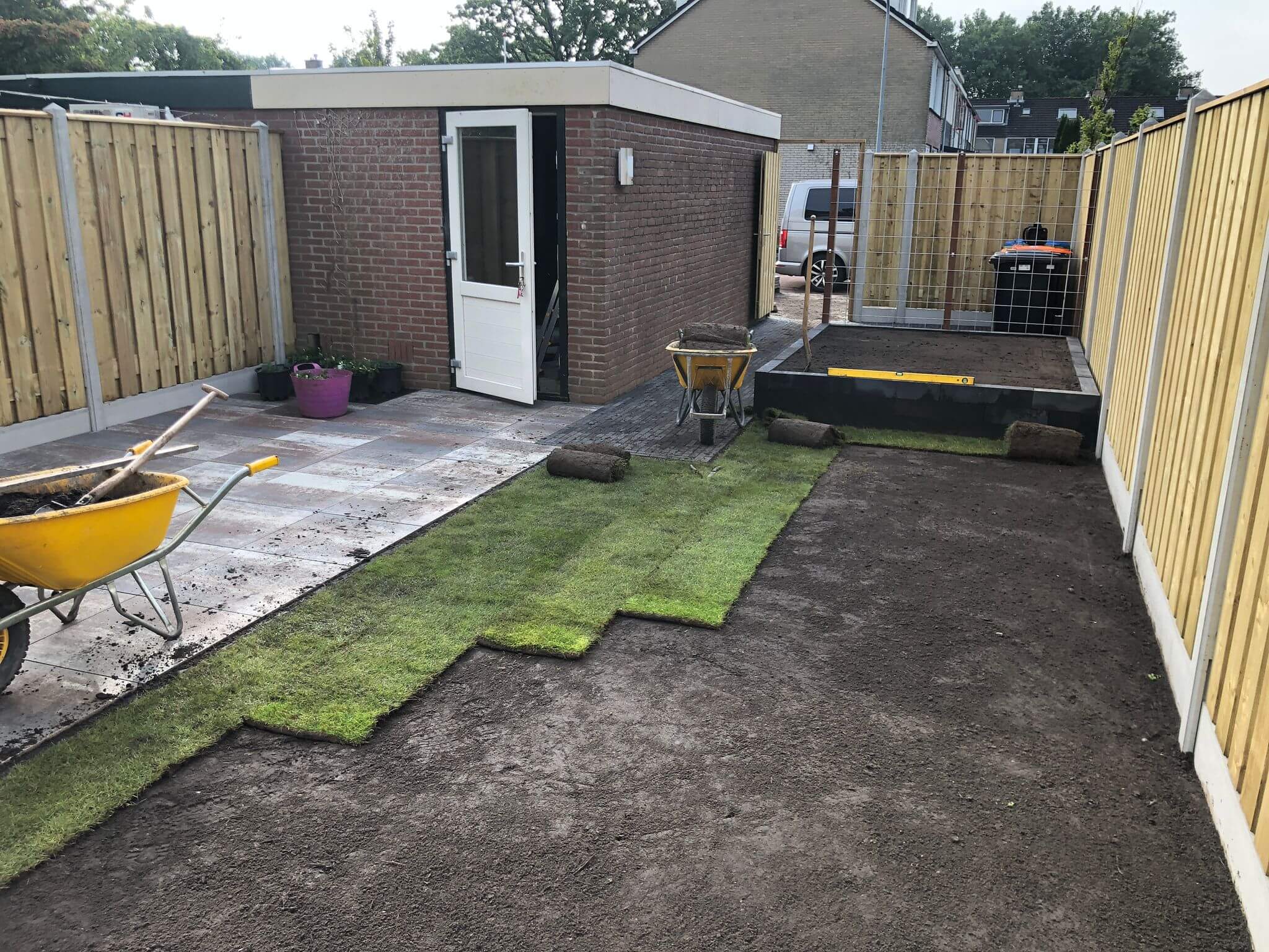 Tuinrenovatie, grondwerk verwijden groen, terras, hout-betonschutting en graszoden Lelystad.