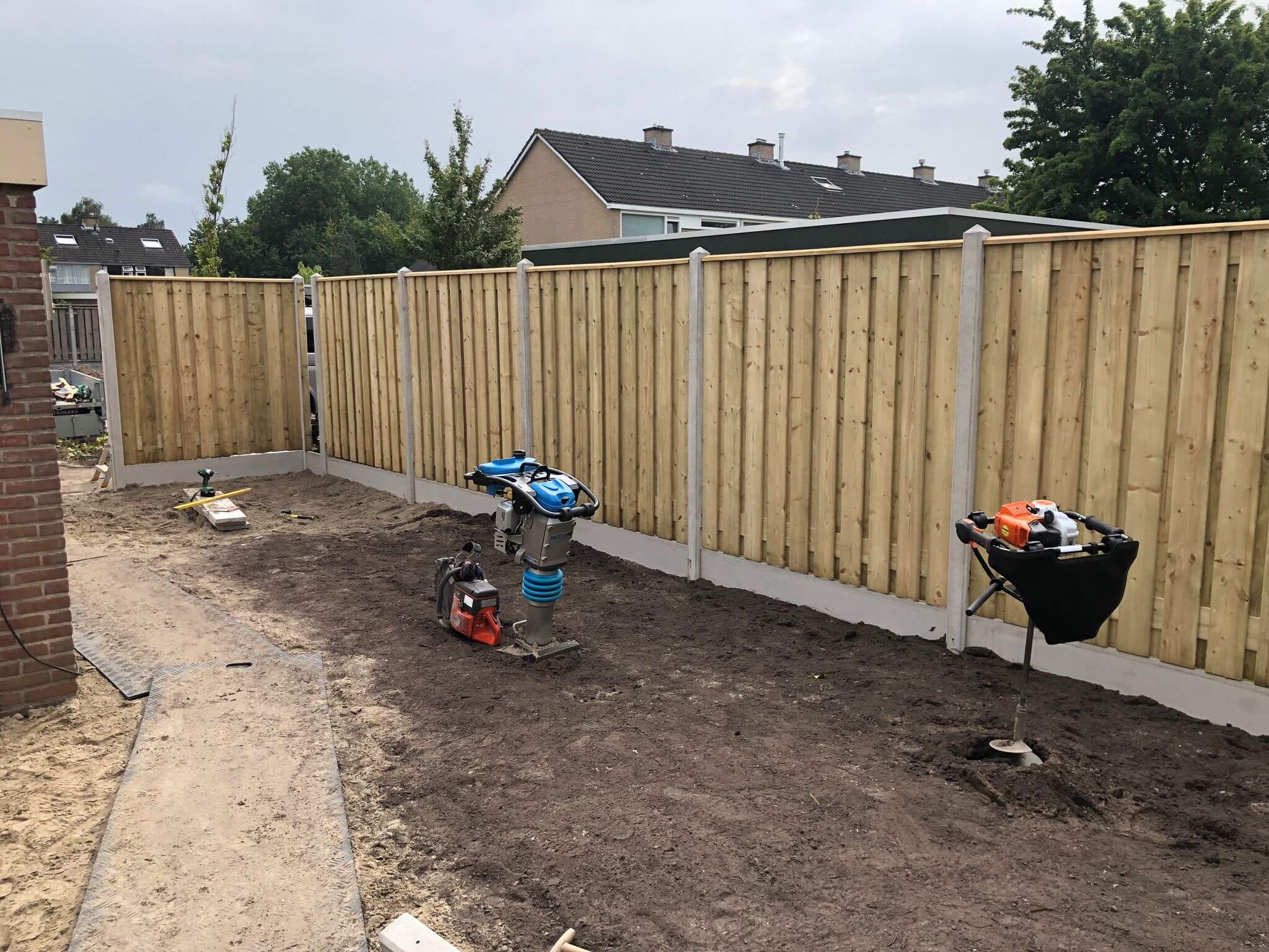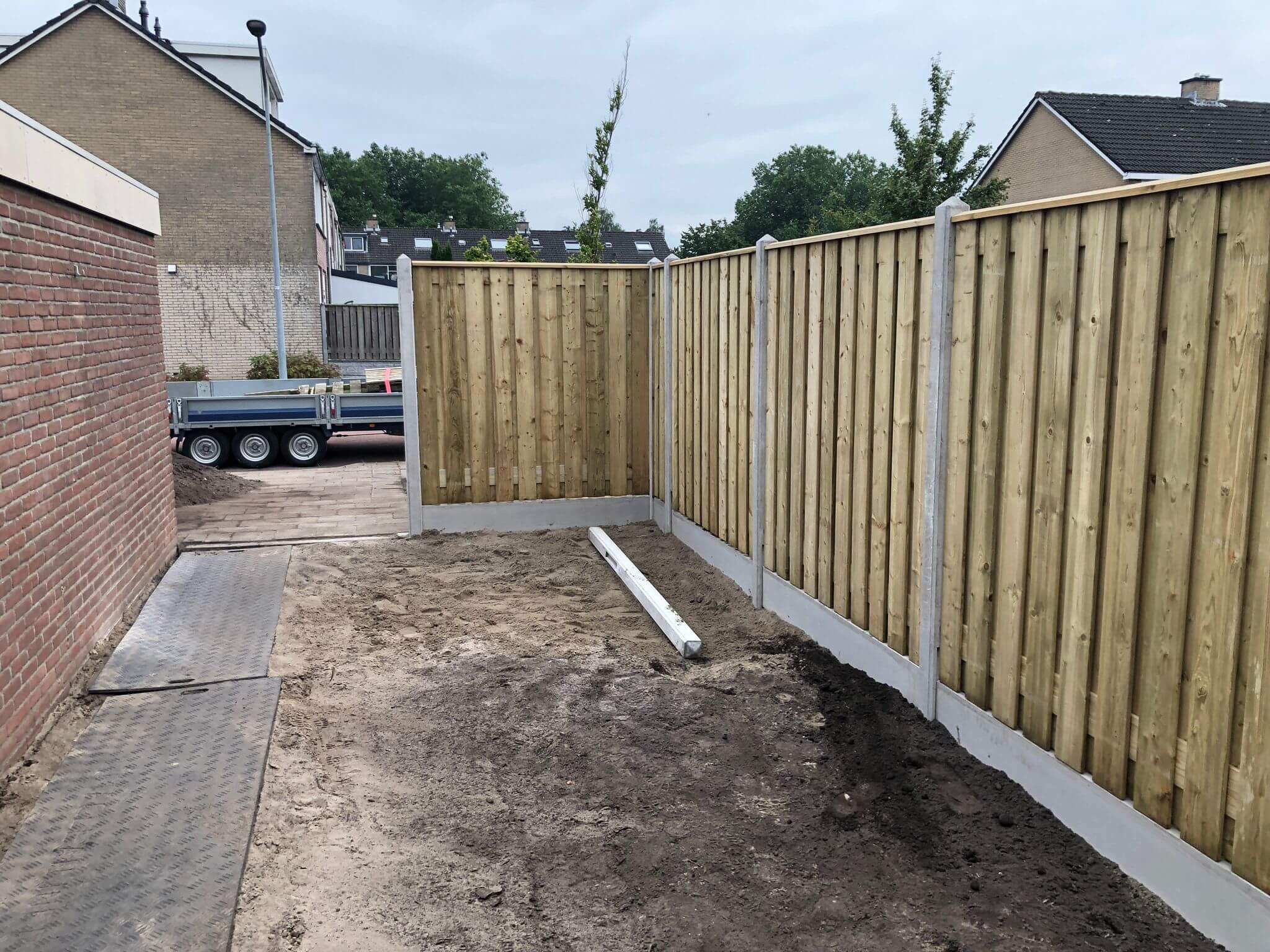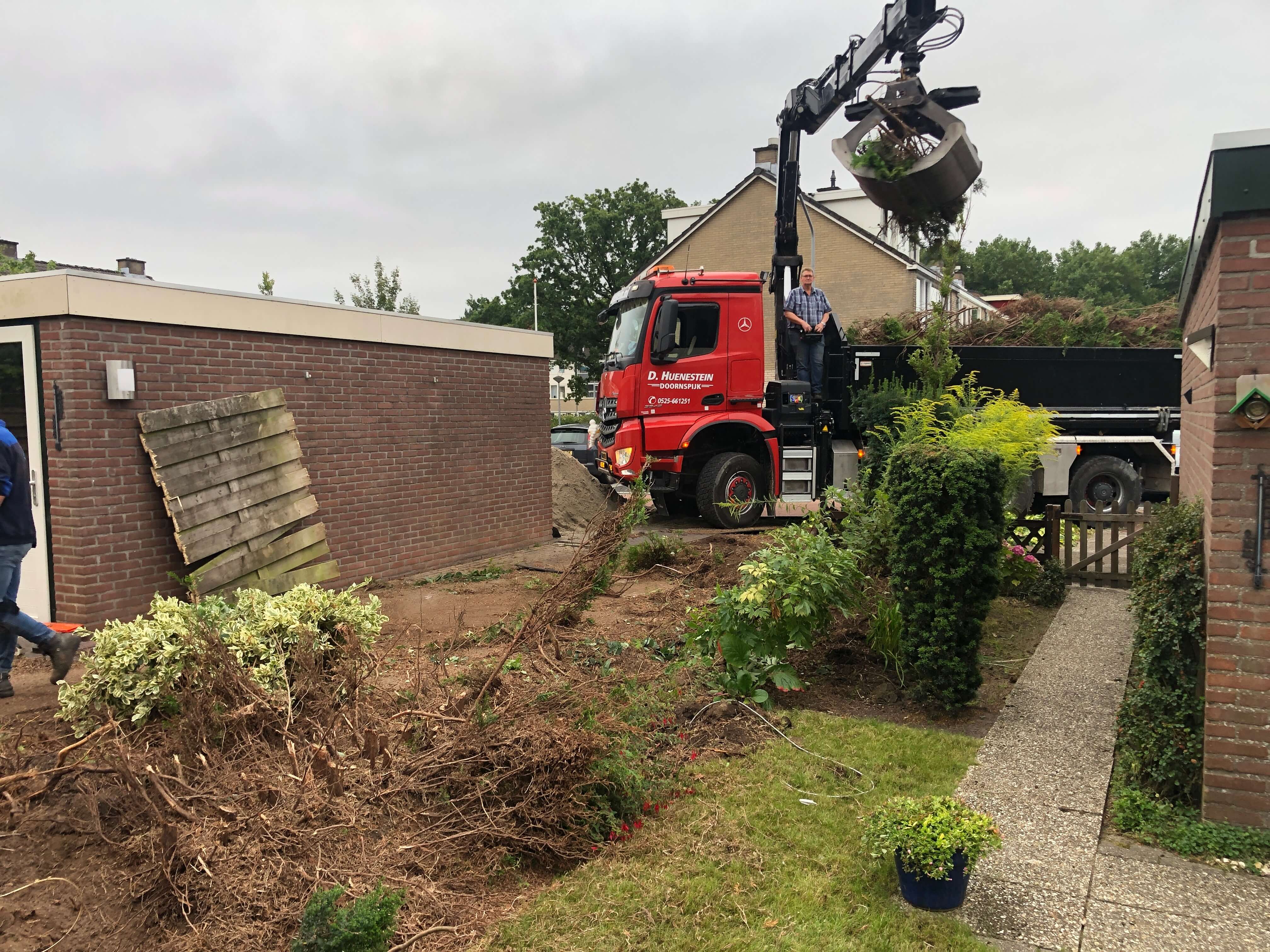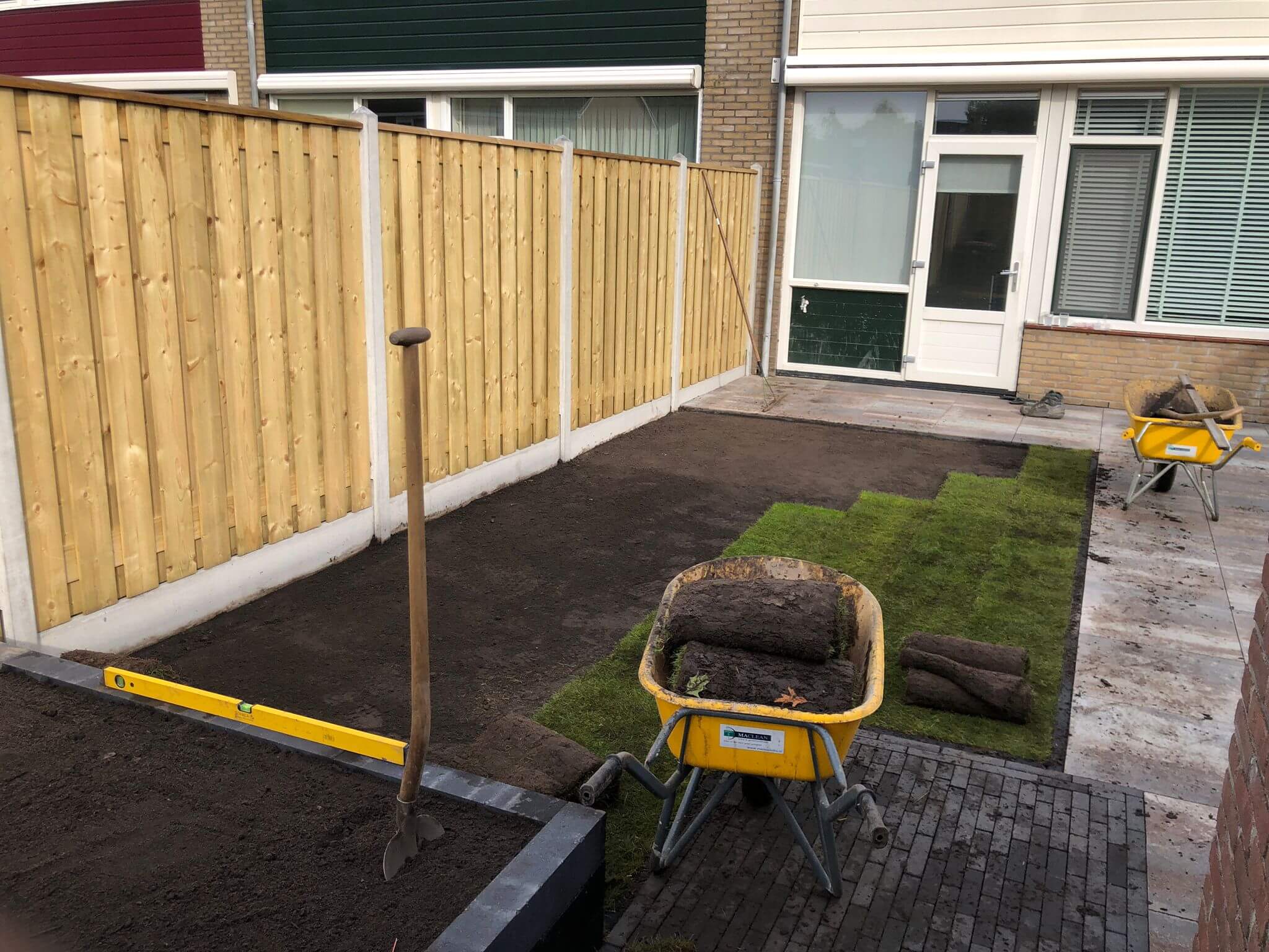 Tuinrenovatie, grondwerk verwijden groen, terras, hout-betonschutting en graszoden Lelystad.