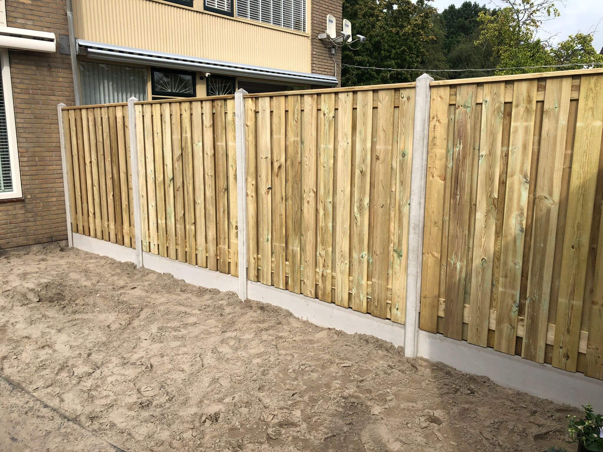 -Schutting deel 180×180 cm geschaaft 21 planken van geïmpregneerd grenen. met een grijze betonpaal en betonplaat.