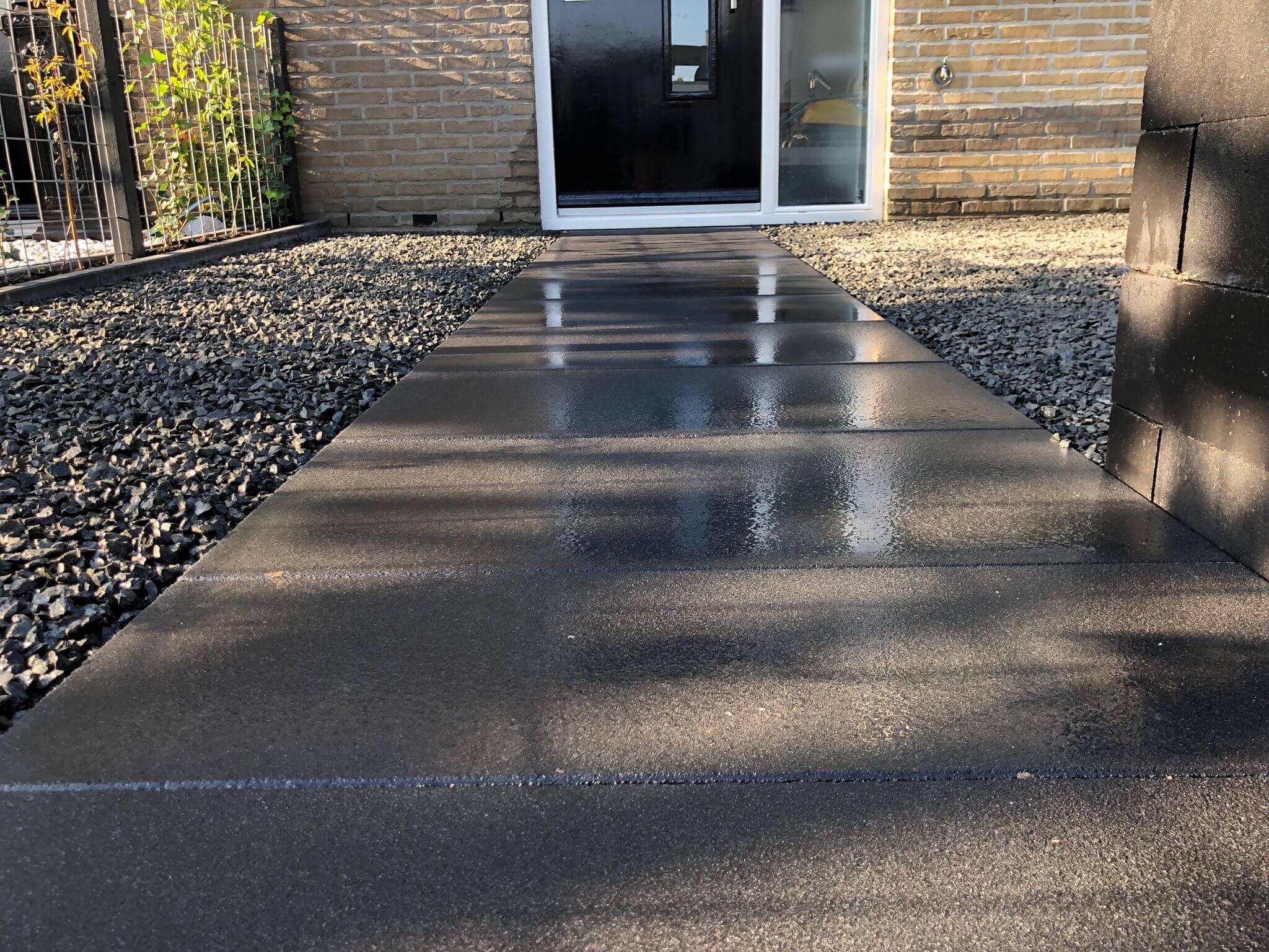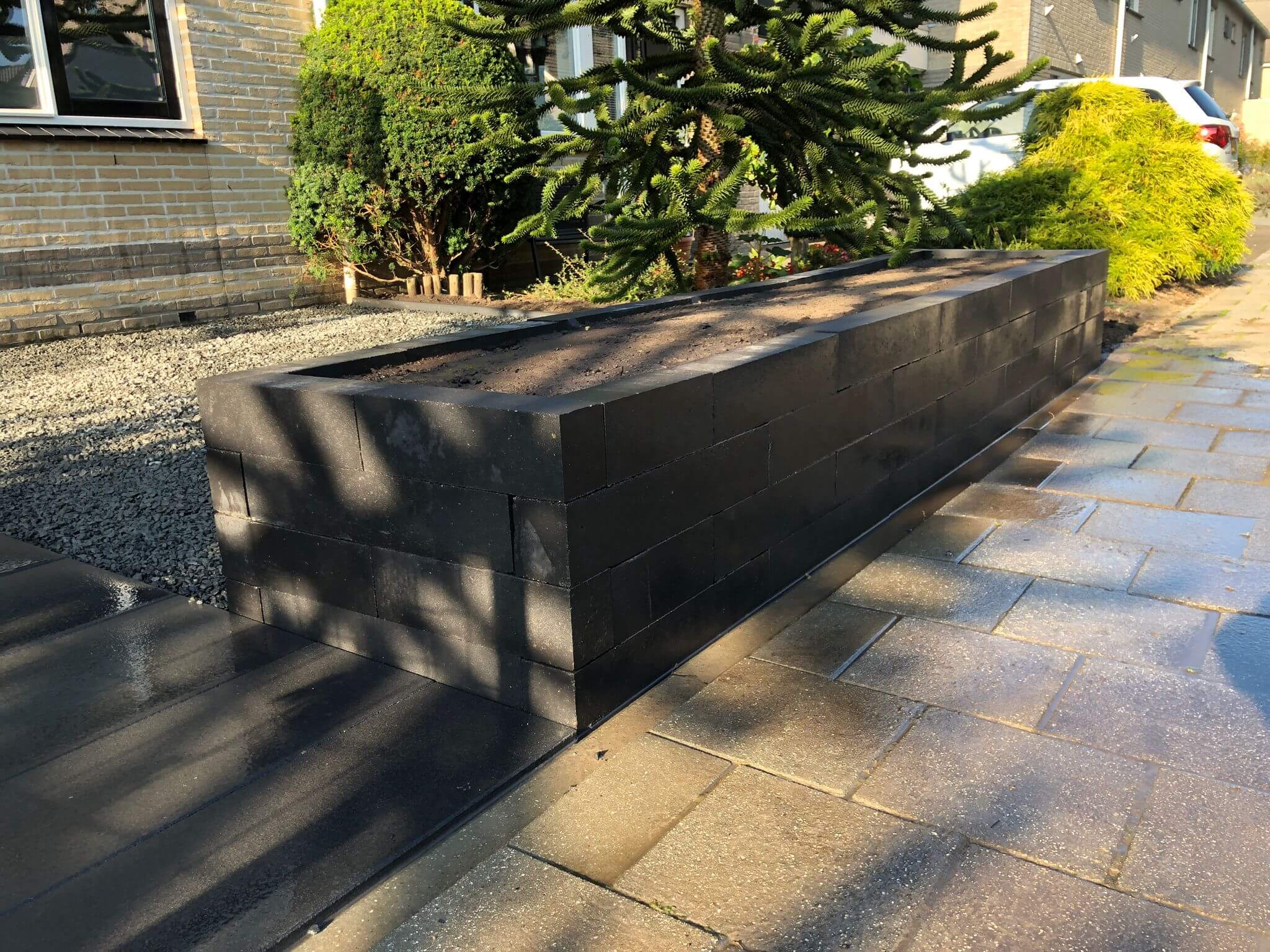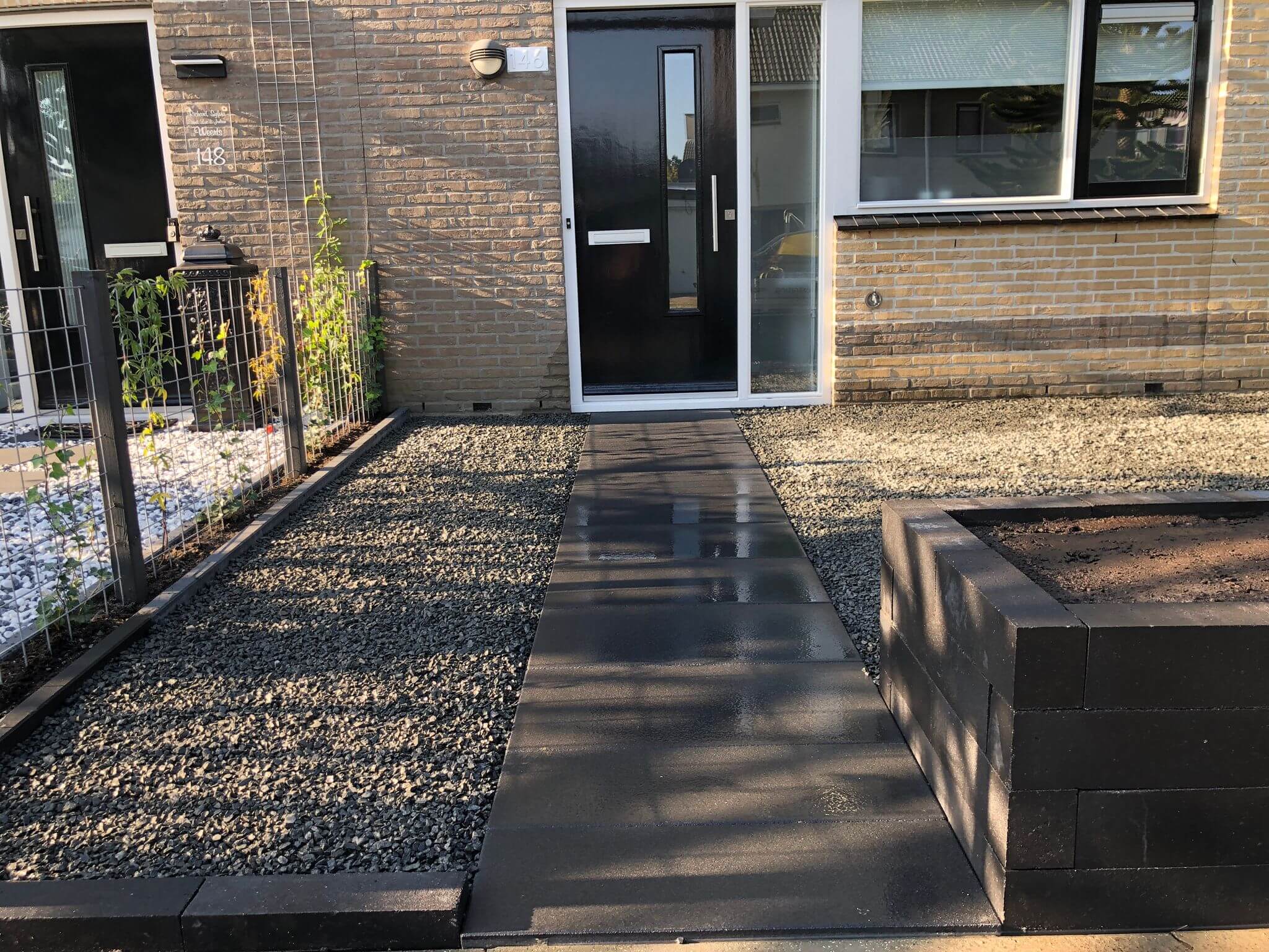 We hebben eerst het grondwerk uitgevoerd in de voortuin. Waarna we het pad hebben gelegd met betontegels MBI GeoCollor 3.0 Tops 80x40x4cm Dusck Black. De borderbak is gemaakt van MBI patioblokken 12x10x60cm Antraciet.
