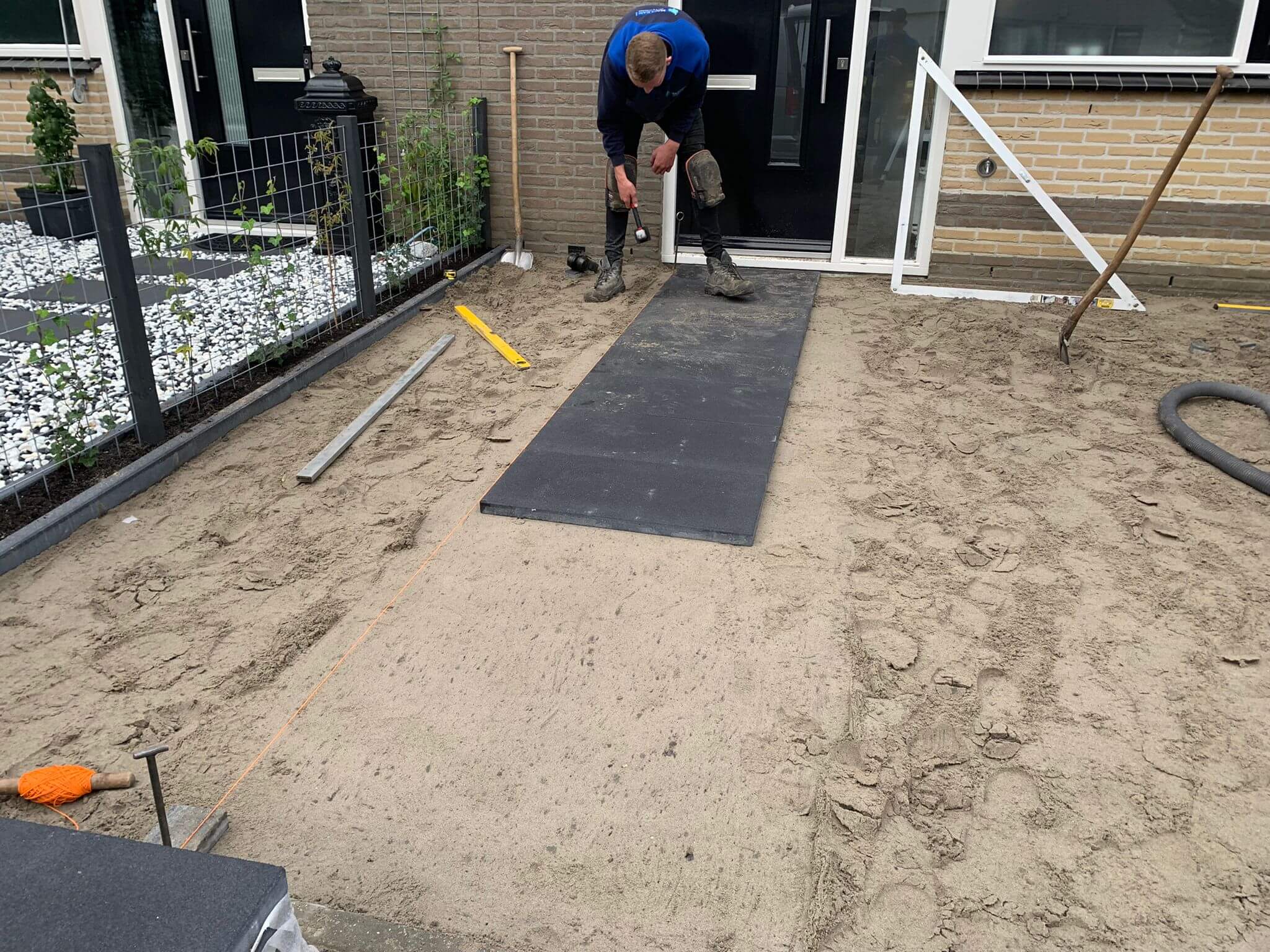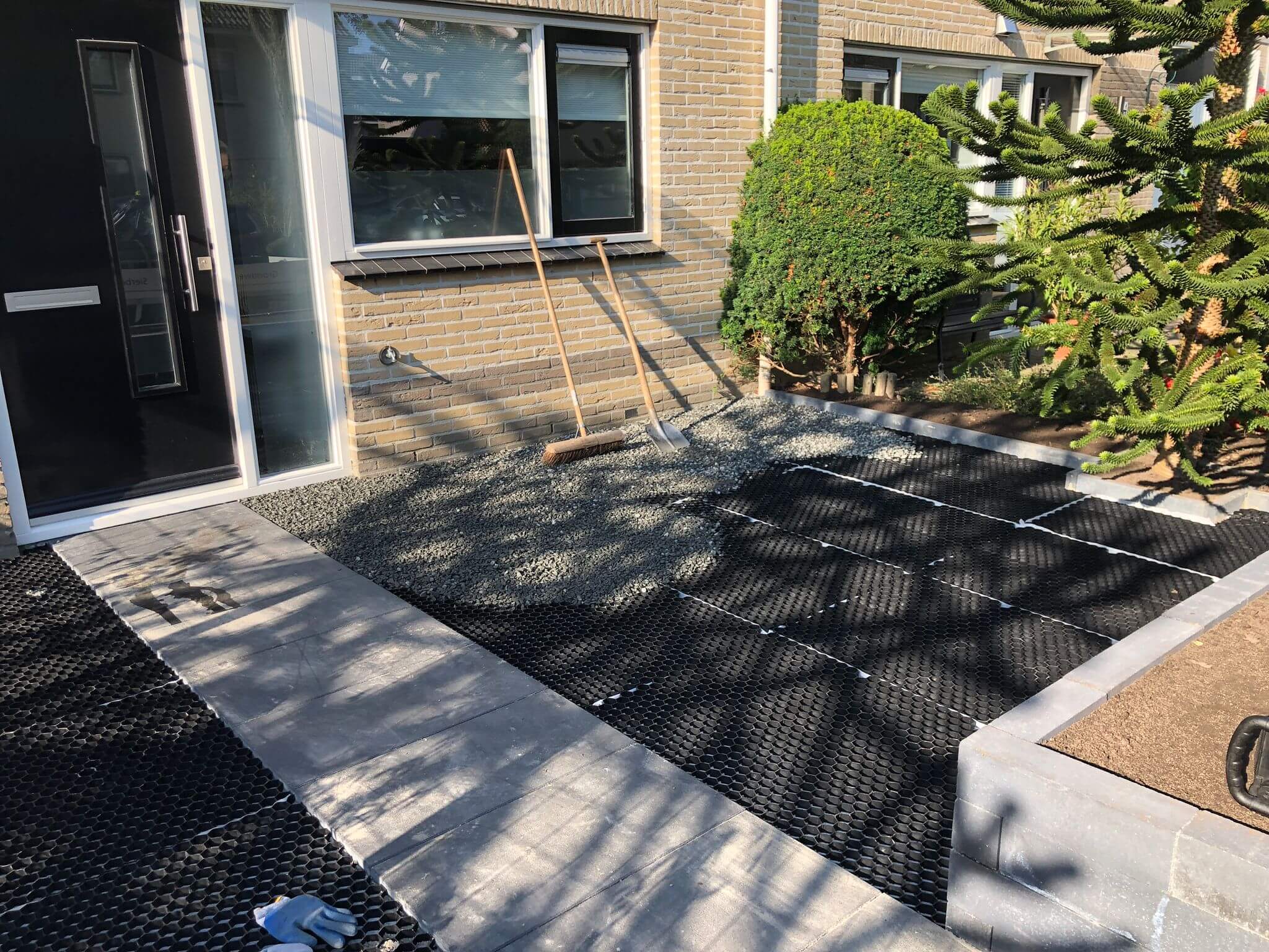 Onder het Basaltsplit 16/32mm hebben we grindplaten 120x80cm met geïntrigeerd geotextiel aangebracht.